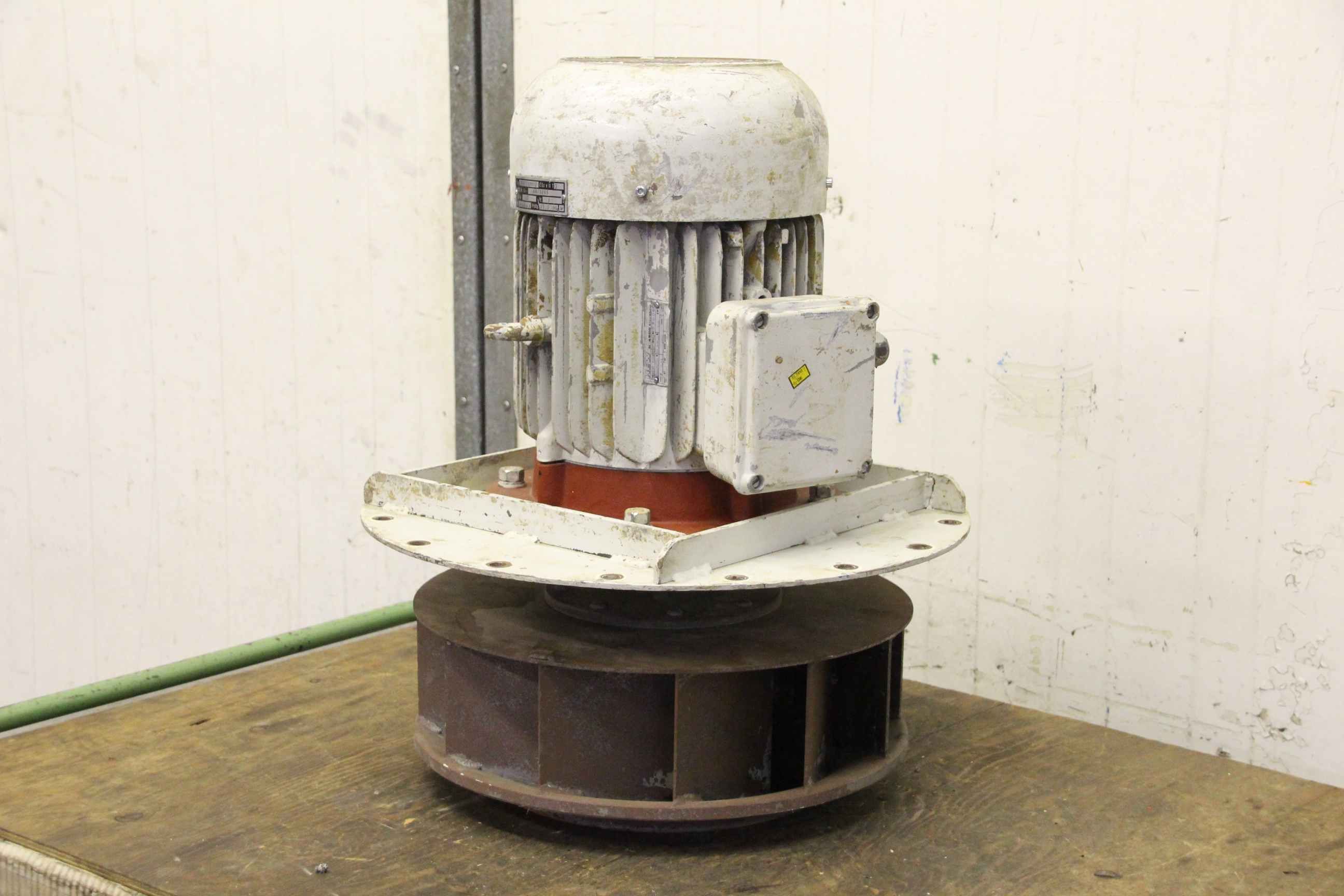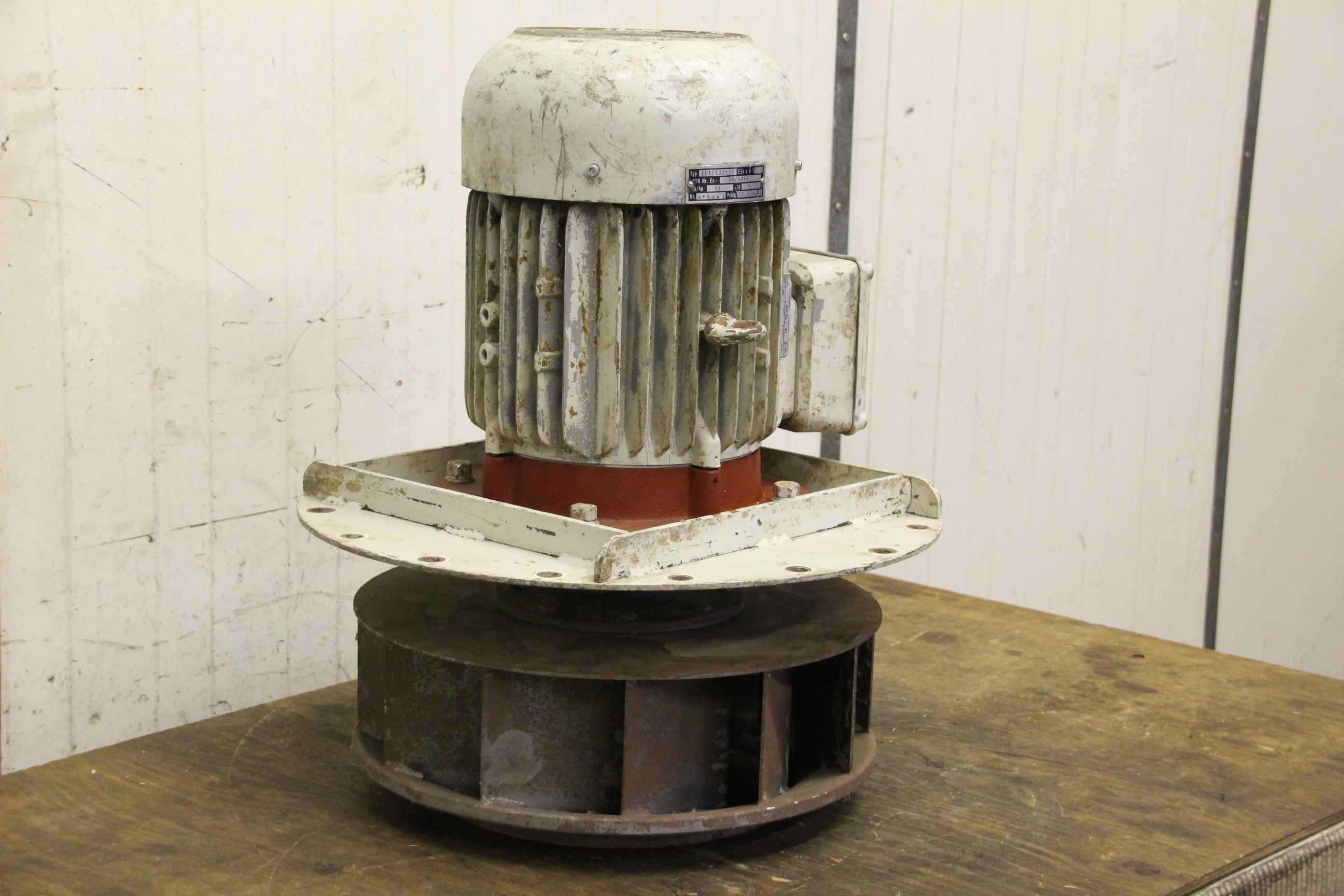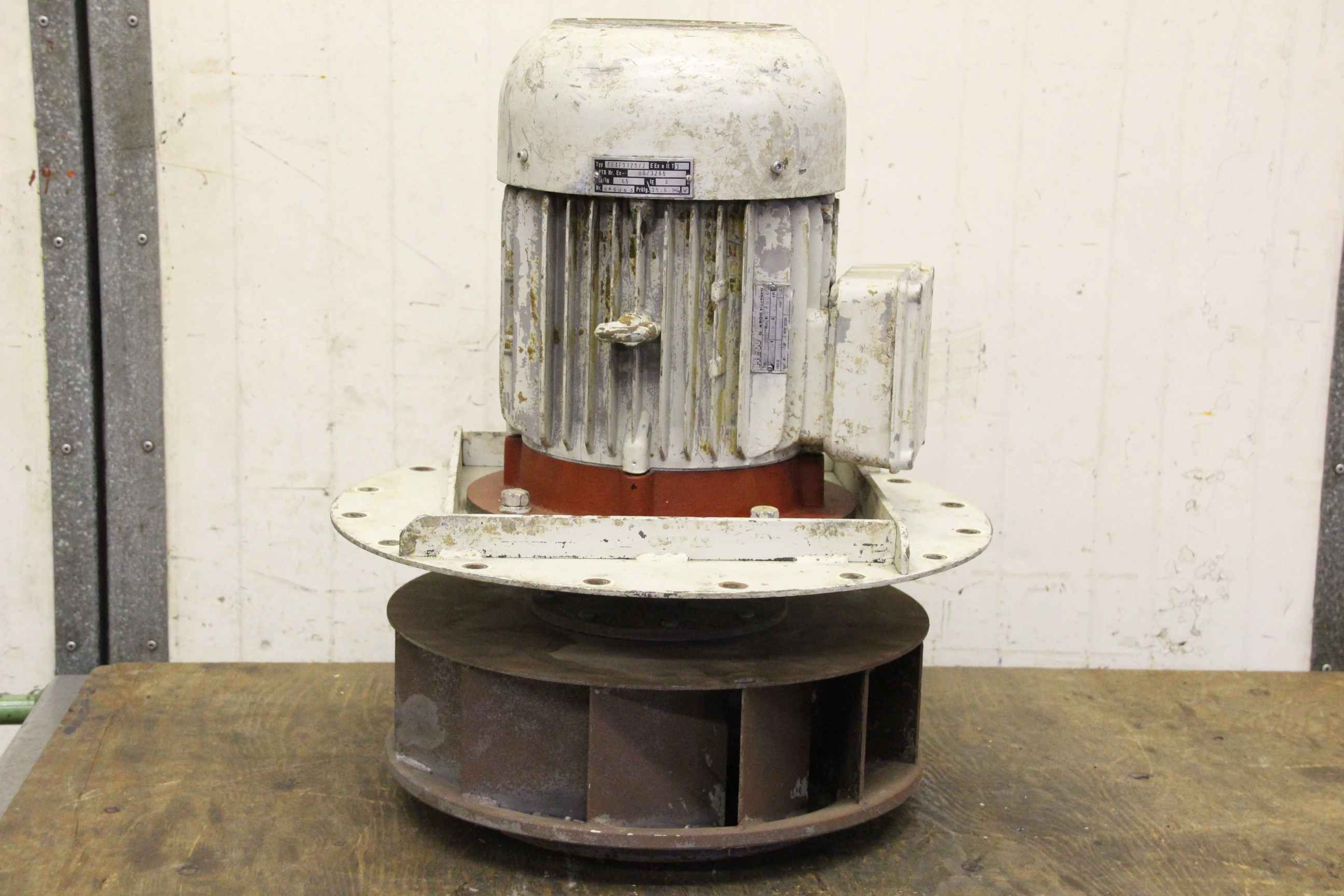 Centrifugal fan, dust extractor fan, fan, extractor, dust fan-Motor: HEW type EEXF 132S/2-Motor power: 4.6 kW-Speed: 2880 rpm-without: housing-Impeller outside: Ø 415 mmSheet metal plate hole circle: Ø 470/13 mm-Dimensions: Ø 500/595 mm-Weight: 68 kg