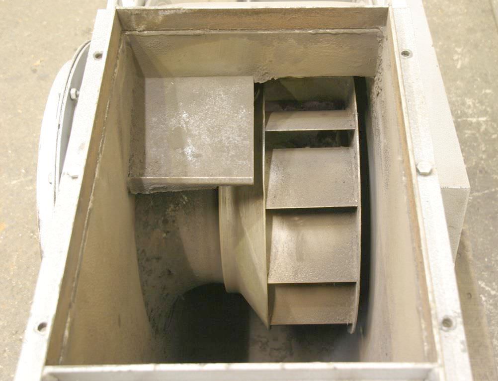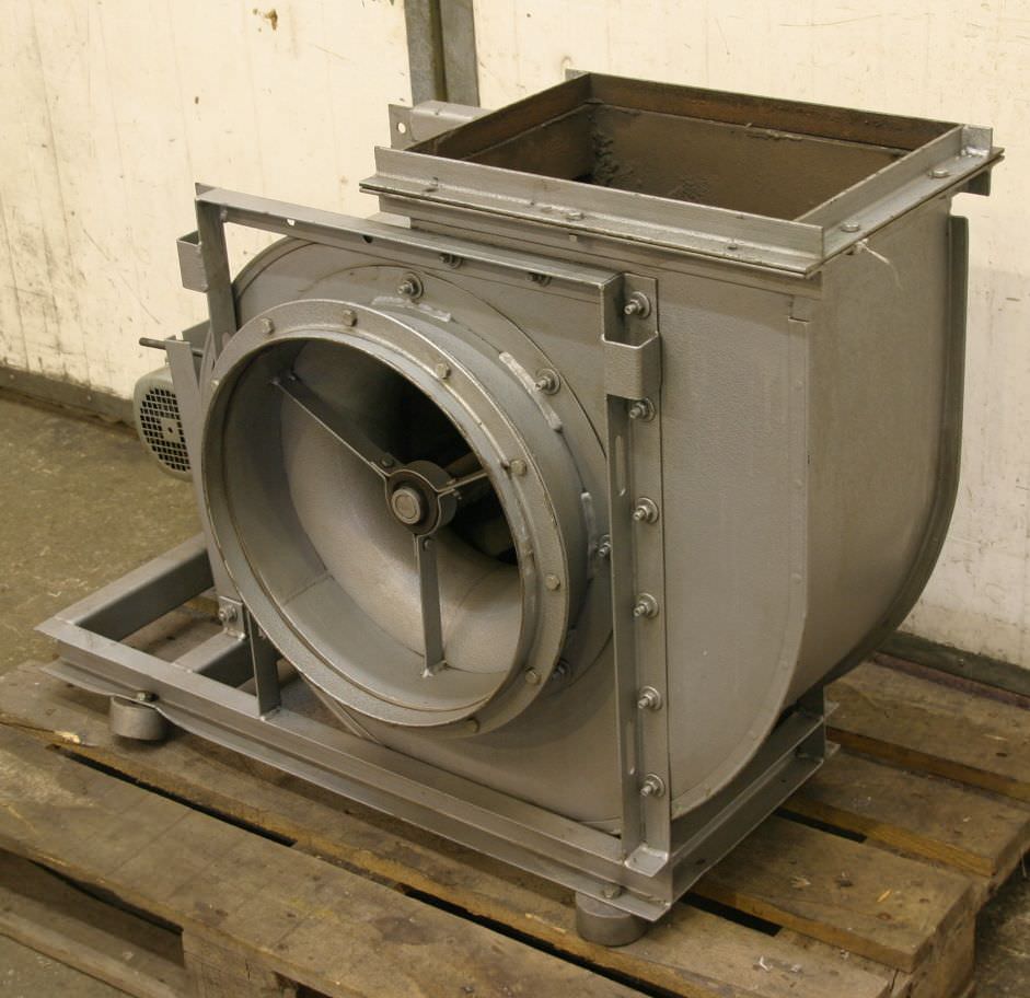 Centrifugal fan, dust extractor fan, fan, extractor, dust fan-Motor power: 4 kW-Speed: 2850 rpm-Max. Volume flow: 7200 m³/h-Max. Pressure: 120 kp/ m²-Connection input: Ø 450 mm-Connection output: 400 x 400 mm-Impeller Ø: - mm-Dimensions: 1030/930/H1240 mm-Weight: 222 kg