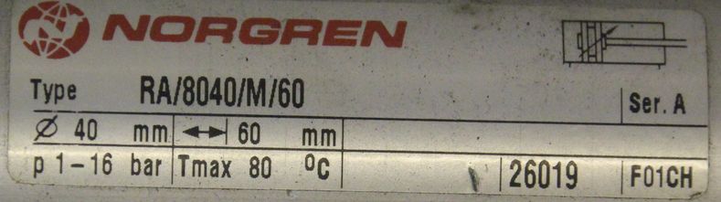 Pneumatic cylinder, air cylinder, pneumatic piston, air piston -Stroke travel: 60 mm -Piston diameter: 40 mm -Quantity: 5 available Price: per piece -Dimensions: 255/55/H80 mm -Weight: 1.1 kg/piece