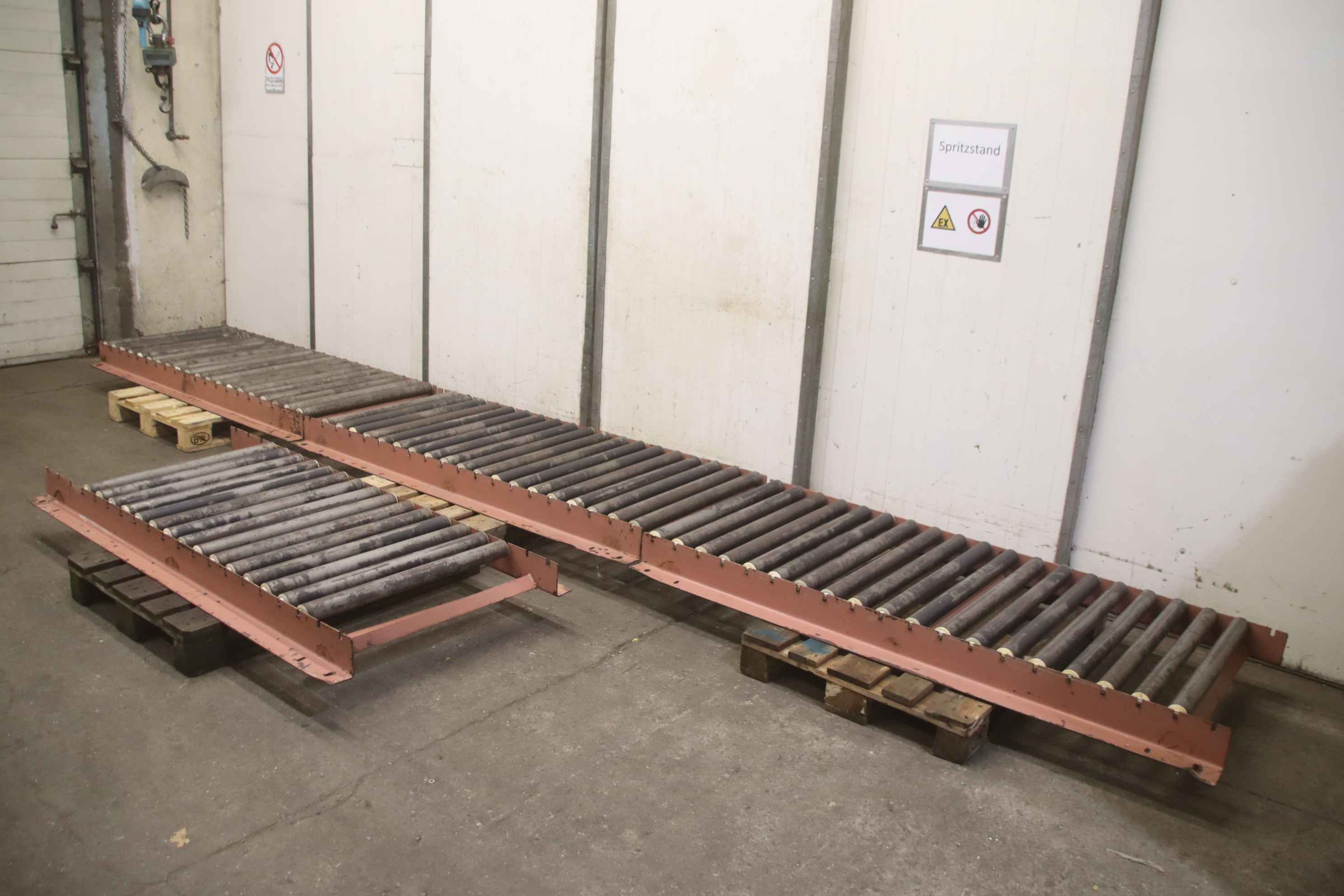 Roller conveyor, conveyor track, roller conveyor belt, roller track-Roller conveyor: not driven, 4 sections-Roll width: 795 mm-Rollers: Ø 60 mm-Roller spacing/axle distance: 100 mm, 7 wheels are missing, see photos-Total length: 7.96 m-Dimensions: 4x 1990/970/H135 mm-Price/tax: complete-Transport dimensions: 1990/970/H540 mm-Weight: 363 kg