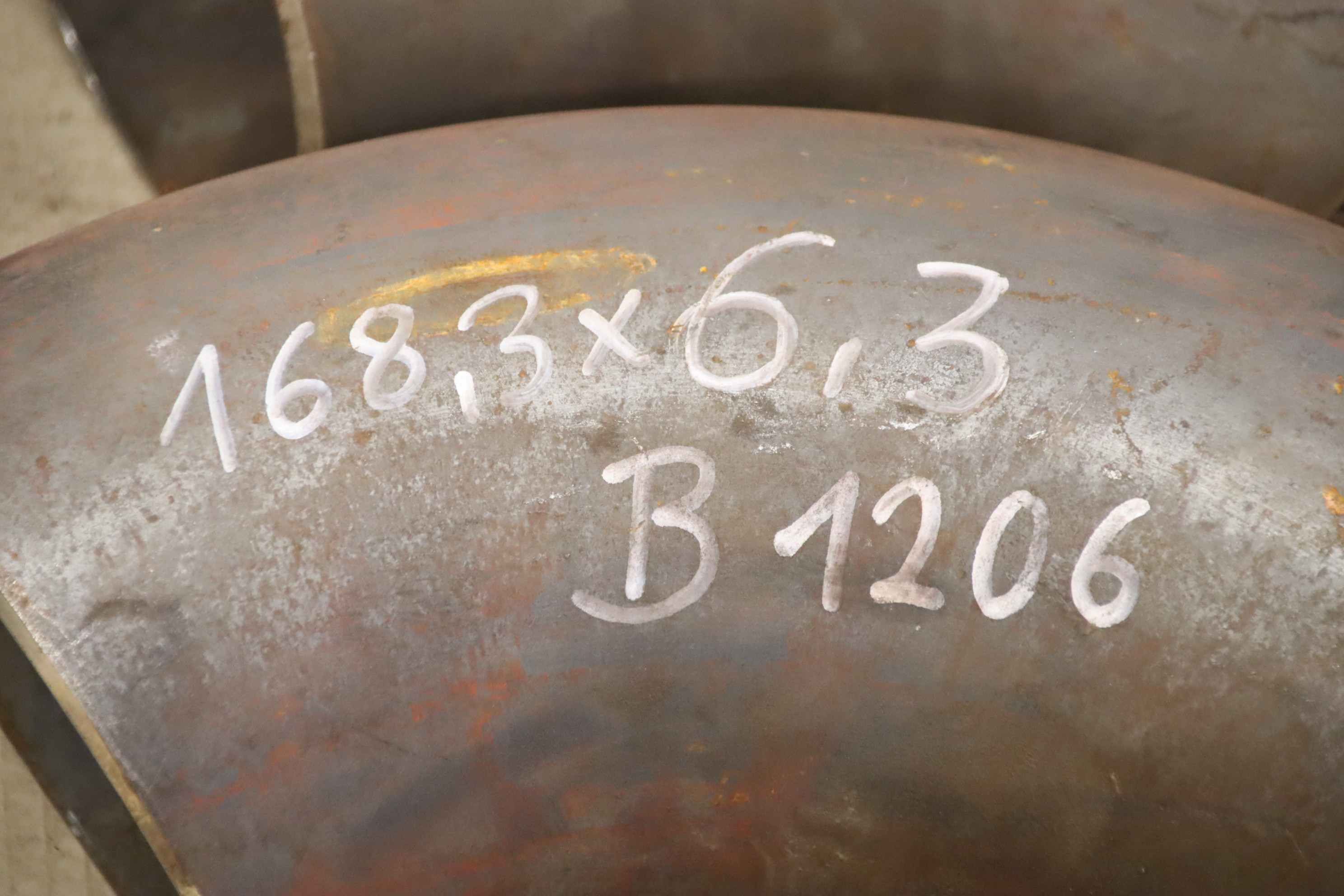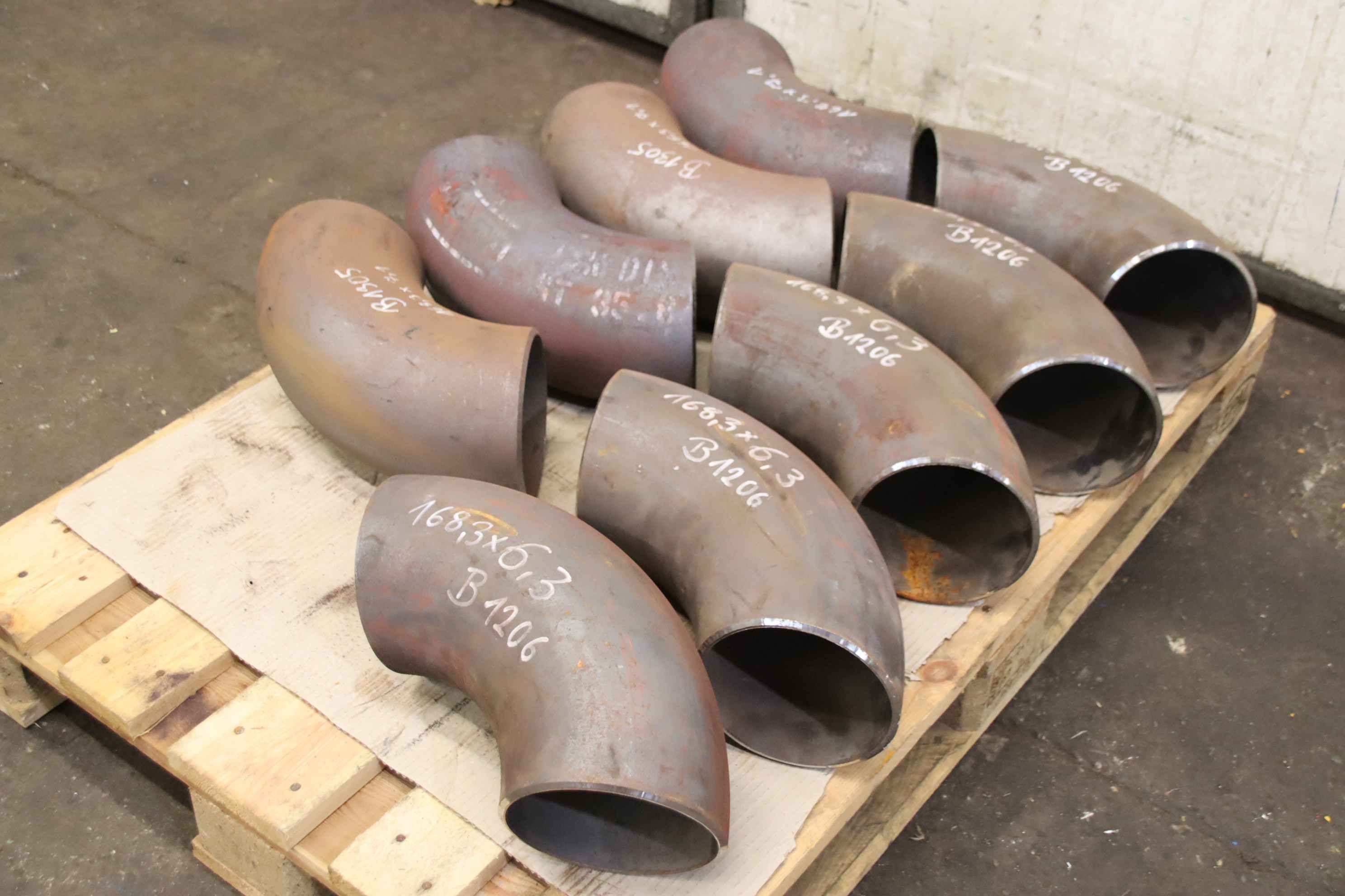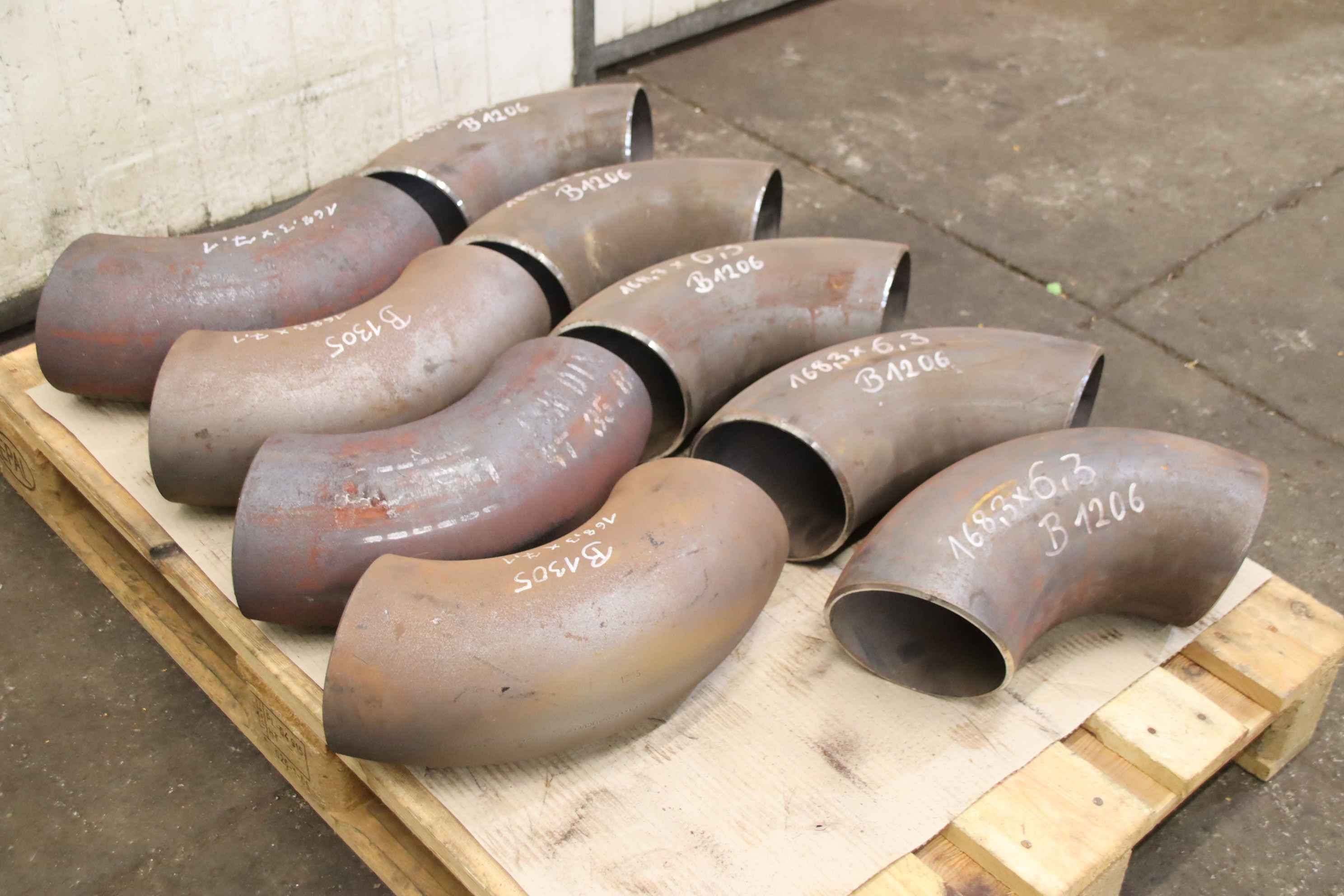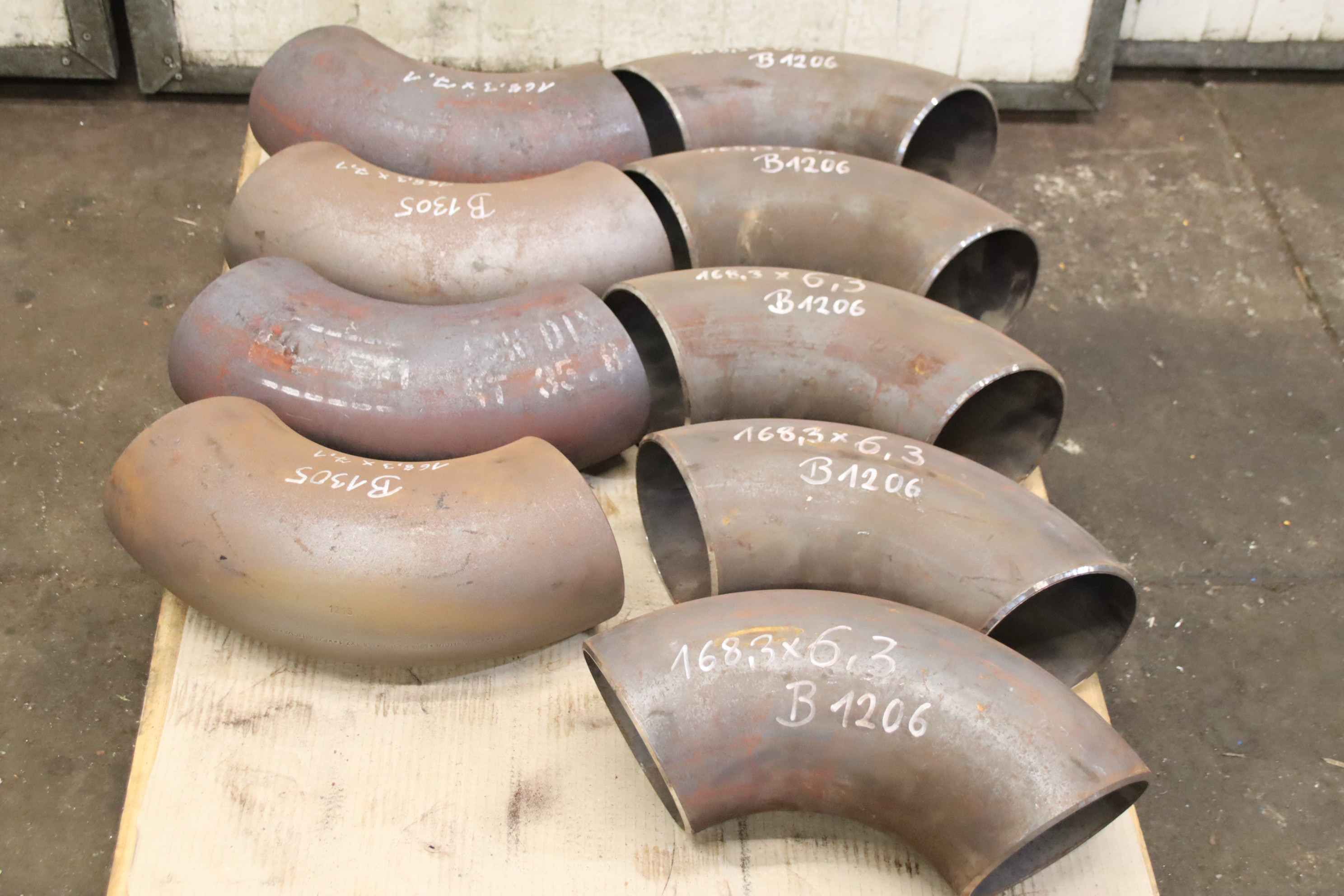 Flange connection, V-flange, pipe coupling, welding reduction, reduction, clapper base, pipe bend, welding bend, pipe angle-Pipe elbow: welding elbow 90° 9 pieces-Type: P235GH S 168.3 x 6.3 5 pcs.-Type: P235GH TC1/F 168.3 mm x 7.1 mm 4 pieces. see photos / parts list-Price/tax: complete-Stock: other sizes/types also available, please inquire-Transport dimensions: 1200/800/H170 mm-Weight: 114 kg with pallet