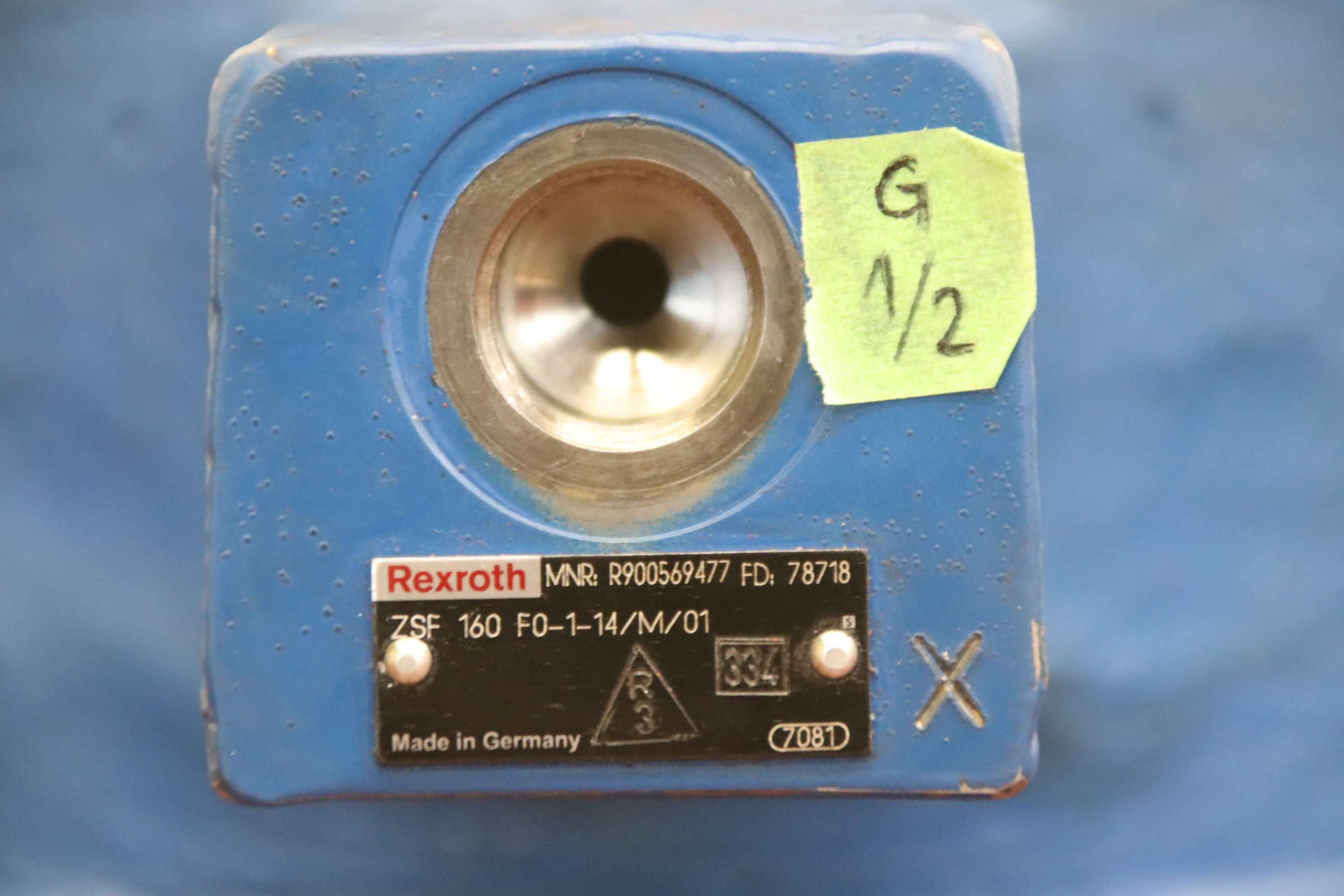 Hydraulic valve, pressure valve, filling valve, pre-fill valve -Manufacturer: Rexroth, Filling valve type ZSF 160 FO-1-14/M/01 -Classification: NG160ZSF-160F1-1 -Nominal size: 160, A B, mechanically operated -Connections: G 1 1/4 / G1/2 -Individual components: see photos -Overall dimensions: 470/310/280 mm -Weight: 49 kg