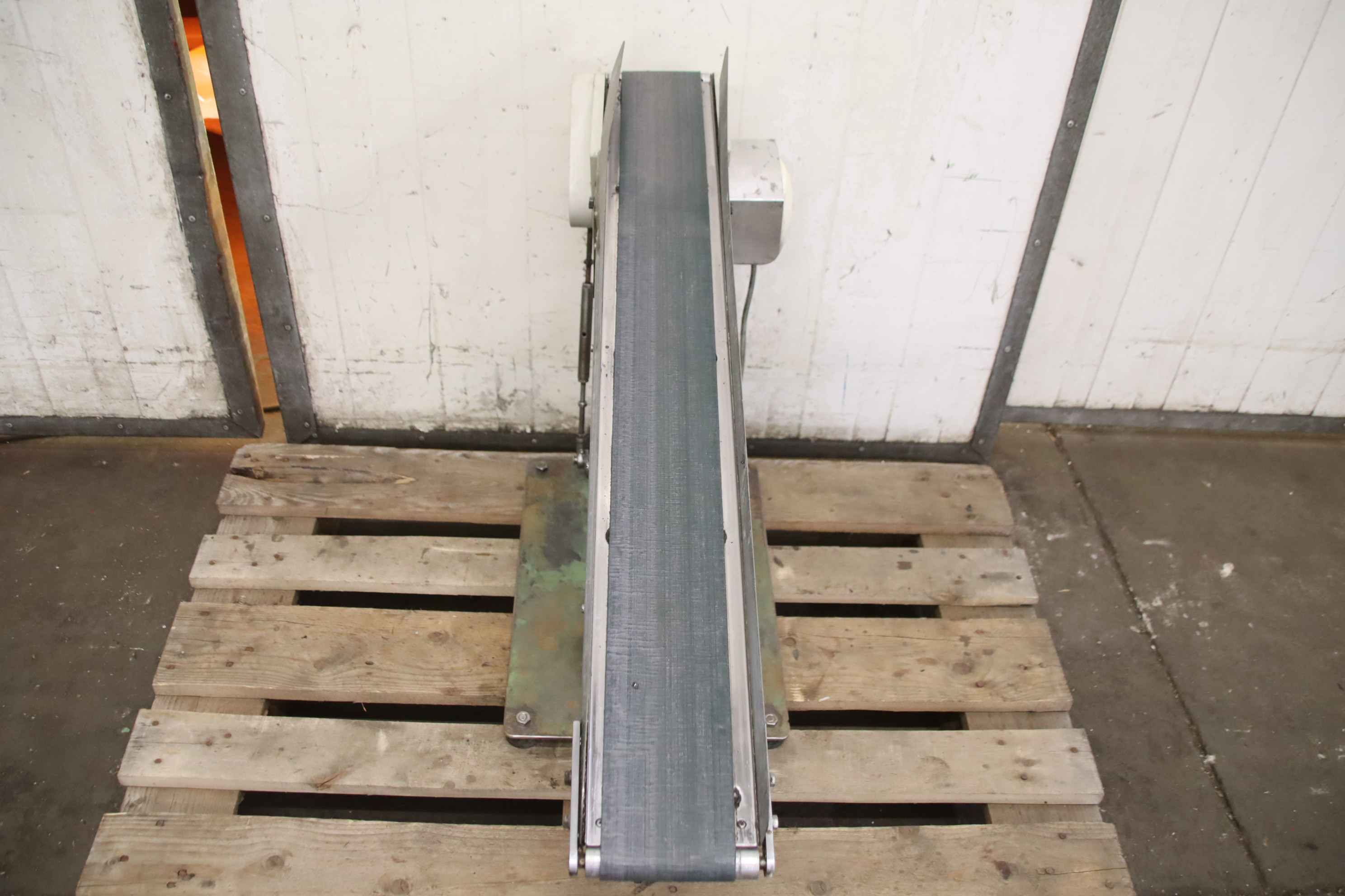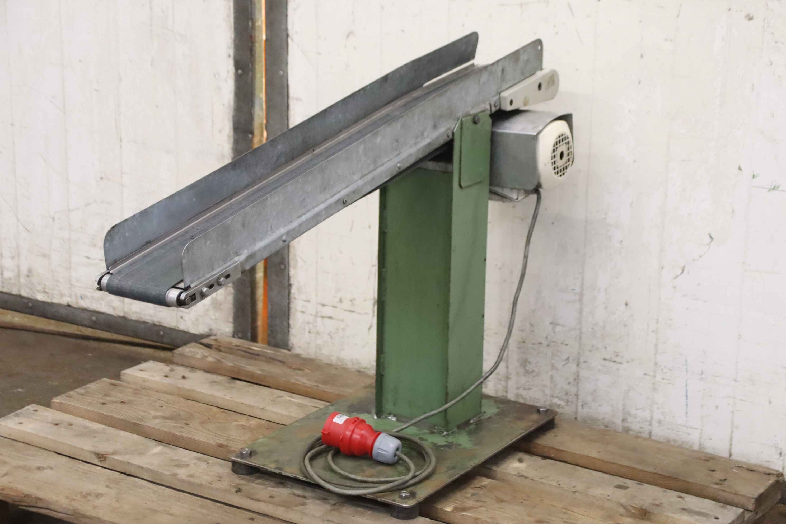conveyor belt, belt conveyor, transport belt, belt conveyor, steep conveyor, steep conveyor belt, chip conveyor, chip conveyor belt-Conveyor belt: conveyor belt with underframe-Speed: 23 m/min-Belt width: 100 mm-Conveyor length: 1040 mm-Total dimensions: 1040/350/H670 mm-Weight: 26 kg
