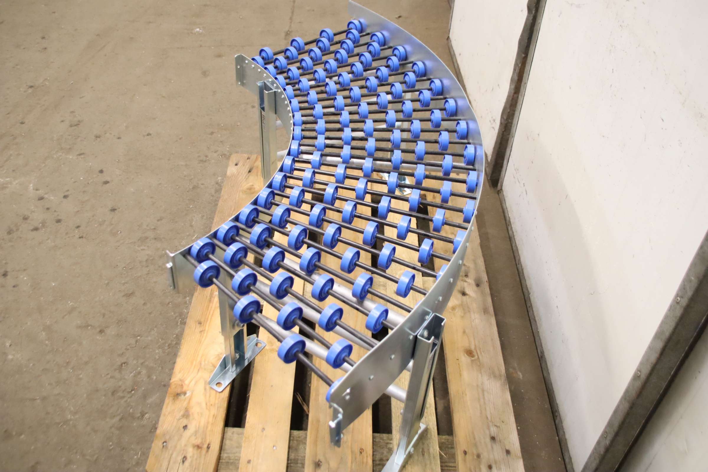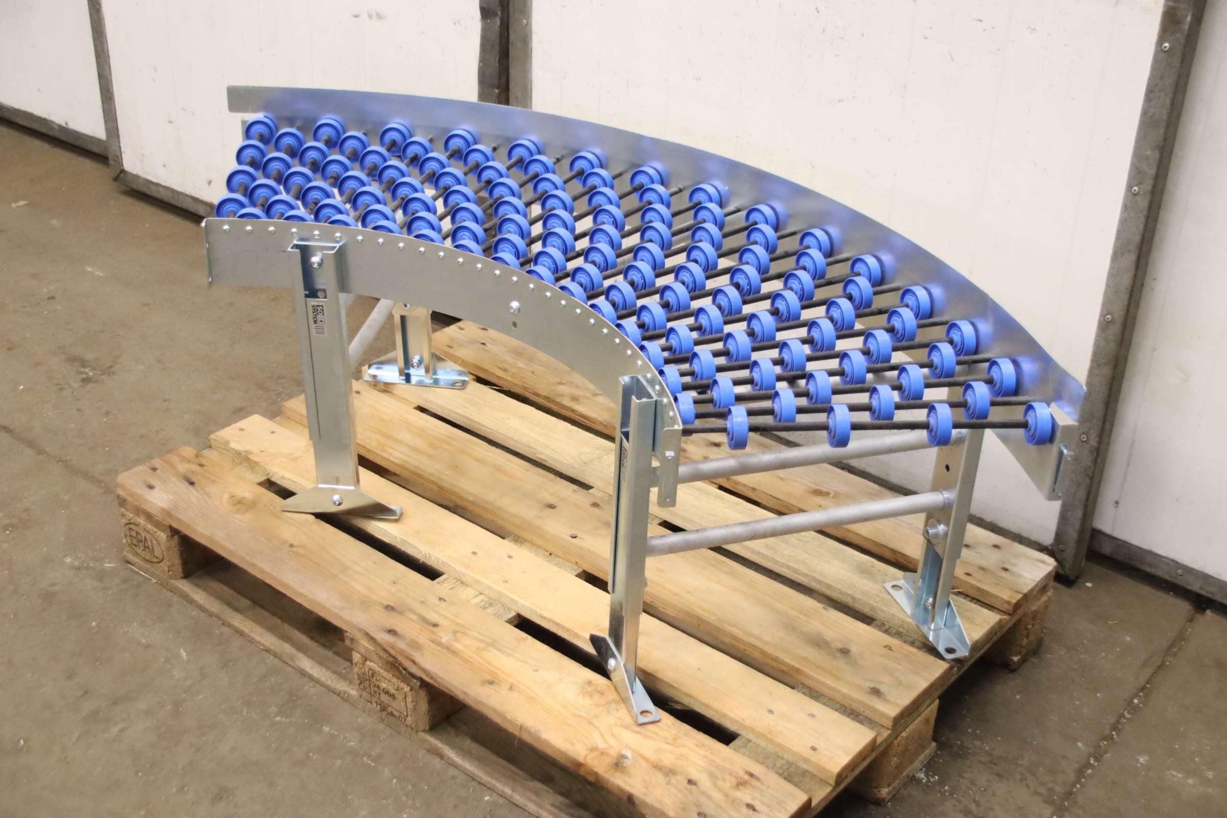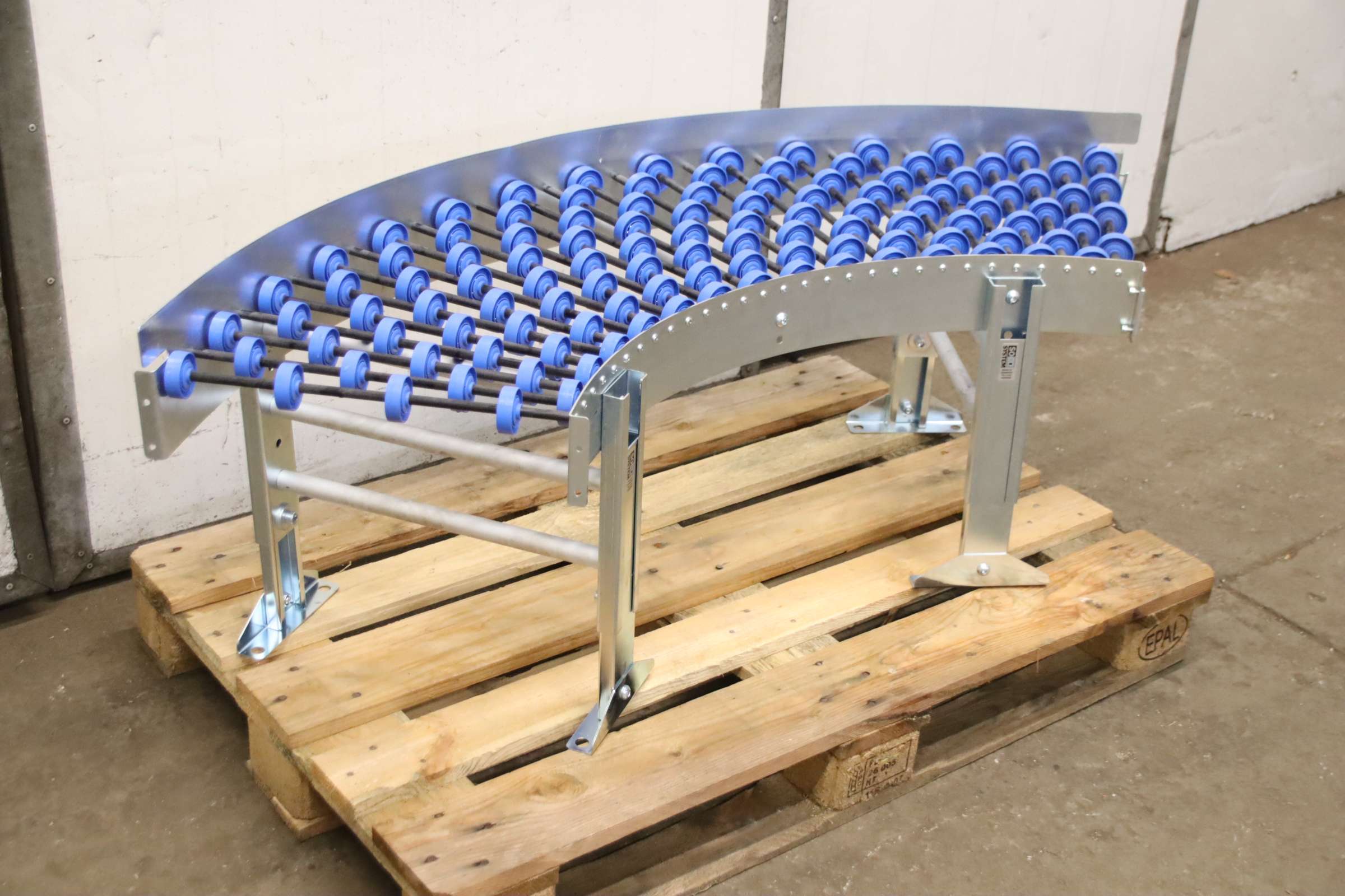 Curved roller conveyor, curved track, curved roller conveyor, curved roller conveyor, curved roller conveyor, roller curve, curved conveyor with drive, roller track, roller curve conveyor, roller track, conveyor track, lightweight roller conveyor -Manufacturer: Soco System, non-driven roller curve conveyor, height-adjustable -Height: max. 710 mm -Rollers: Ø 48 x 15 mm -Number: 2x roller conveyor available -Price: per piece -Transport dimensions: 1470/600/H510 mm -Weight: 23 kg/pc.