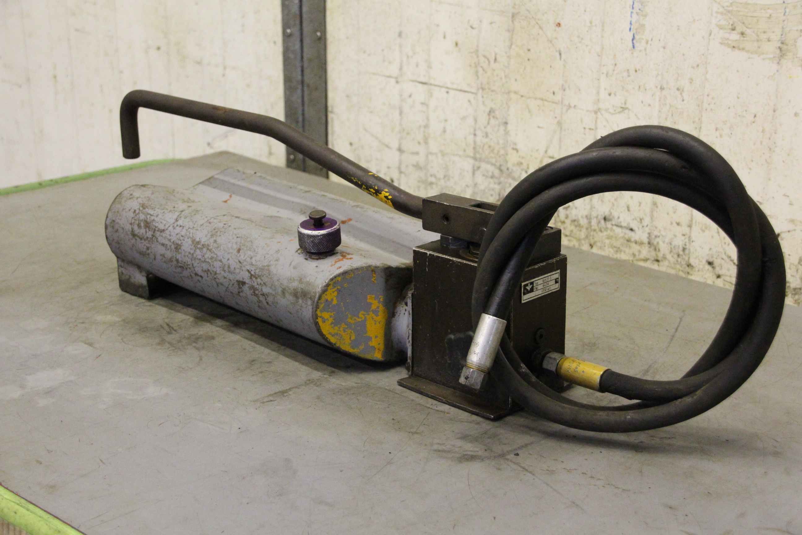 Hand hydraulic pump, hand pump, hydraulic cylinder, hydraulic hand pump, high pressure pump, high pressure hand pump, hydraulic hand pump, hydraulic pump-Manufacturer: FH / Frieseke and Hoepfner, hydraulic pump hand pump-Type: WKP 3-Pressure range: max. 450 bar-Quantity: 2x hand pump available-Price per piece-Dimension: 700/210 // H200 mm-Weight: 13.8 kg/pc.