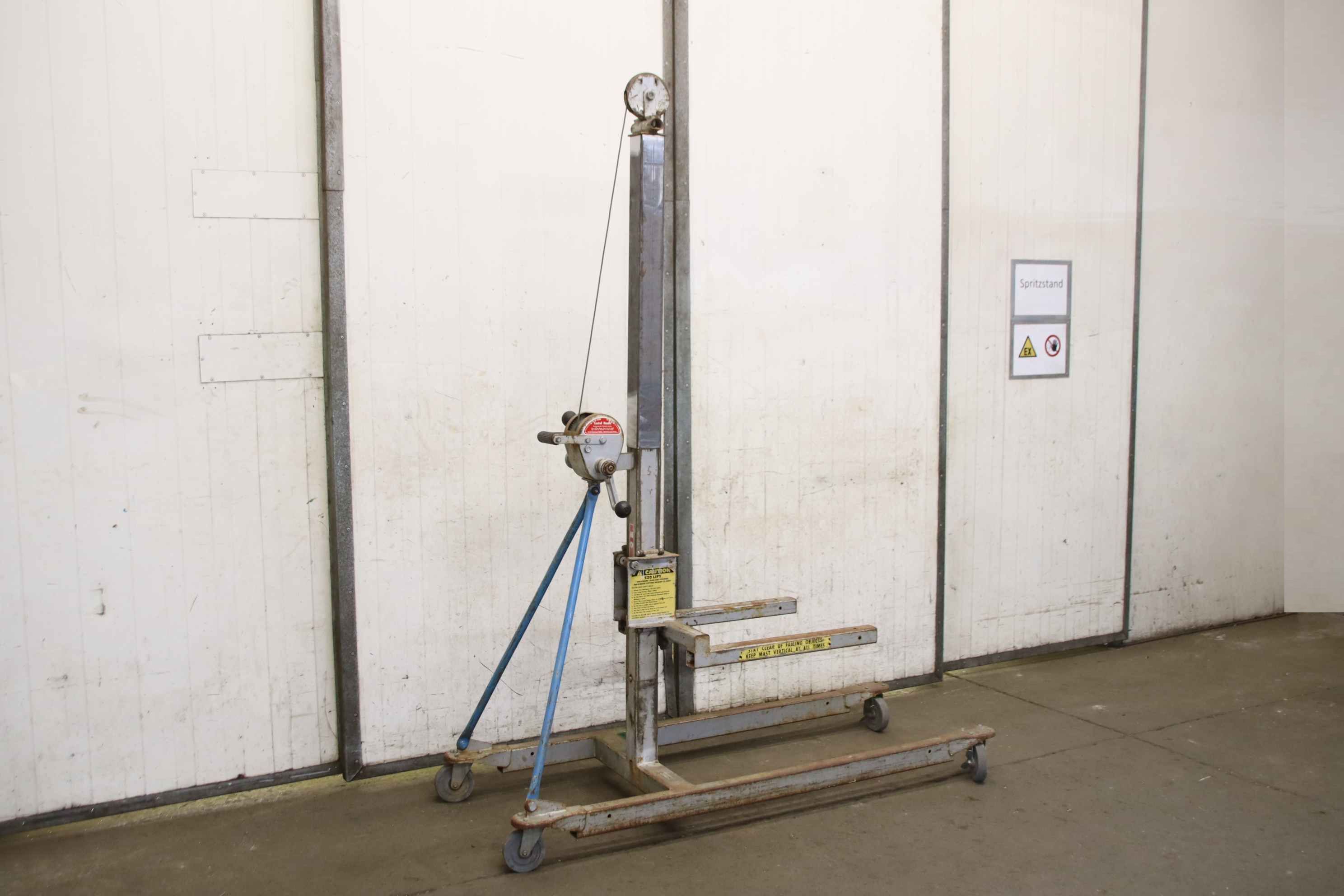 Material lift, pallet truck, lift truck, assembly lift, superlift contractor, lifting lift-Material lift: assembly lift lift with cable winch-Load capacity: max. 226 kg-Lifting height: max 1.77 m-Equipment: with winch, with standard fork-Dimensions: 1700/690/H2230 mm-Own weight: 73 kg