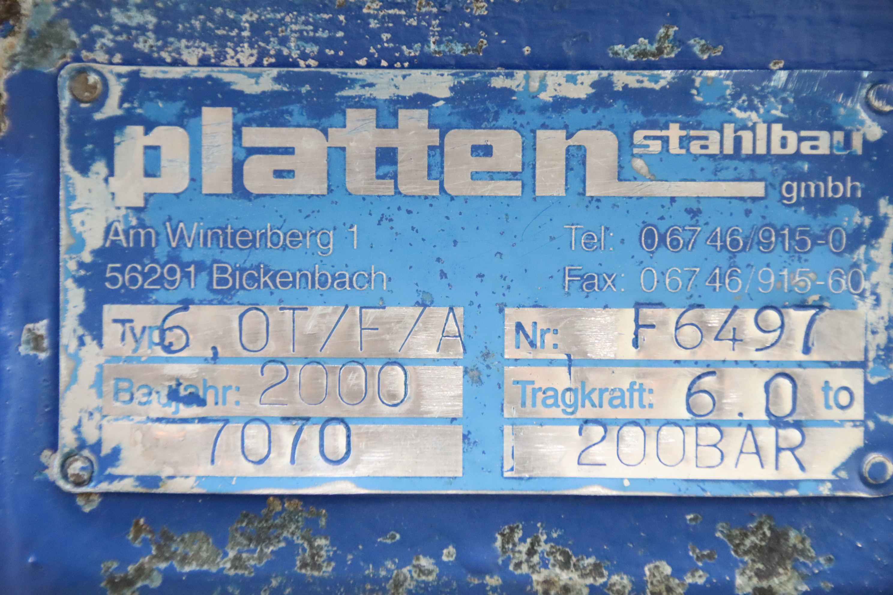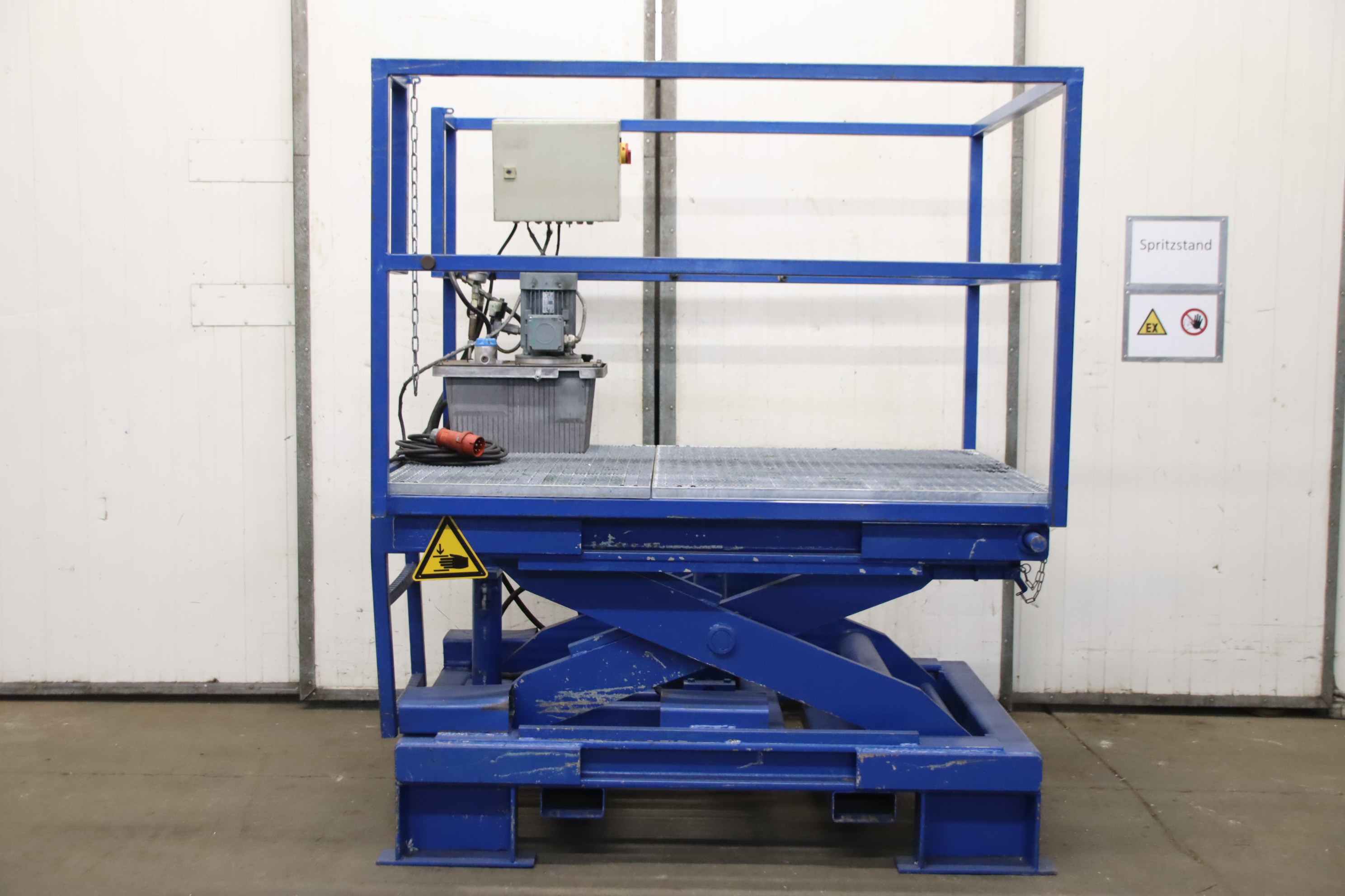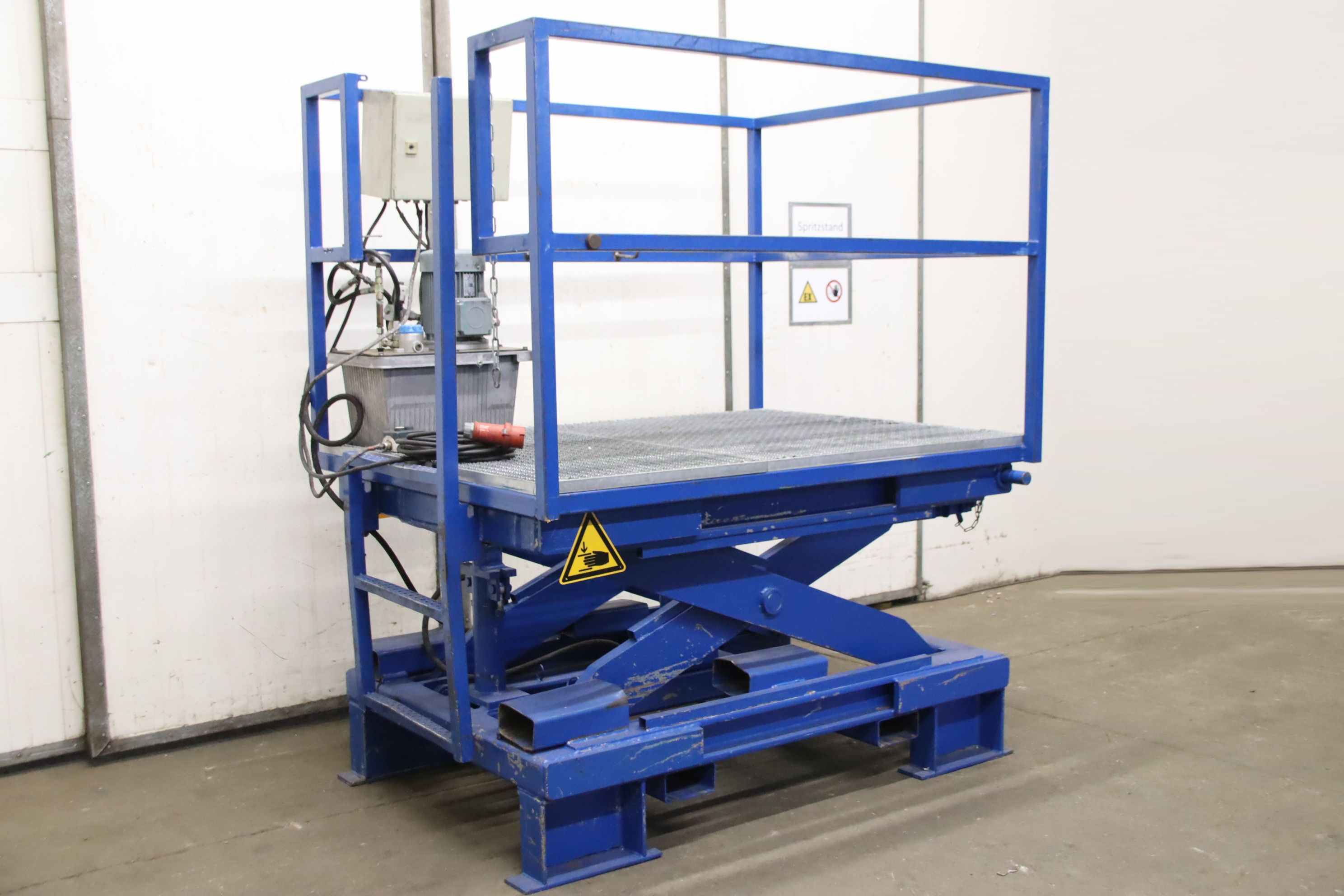 Scissor lift table, scissor lift table, scissor lift platform, scissor lifting platform, single scissor lift table -Manufacturer: Platten, scissor lift table type 6.0 T/F/A -Load capacity: 6000 kg -Platform: approx. 1740 x 1280 mm -Dimension when retracted: Height 975 mm -Extended dimension: Height 1390 mm -Hydraulic unit: Kunz/Elmot 1.5 kW / 180 bar -Transport dimensions: 1740/1280/H1985 mm -Empty weight: 1270 kg