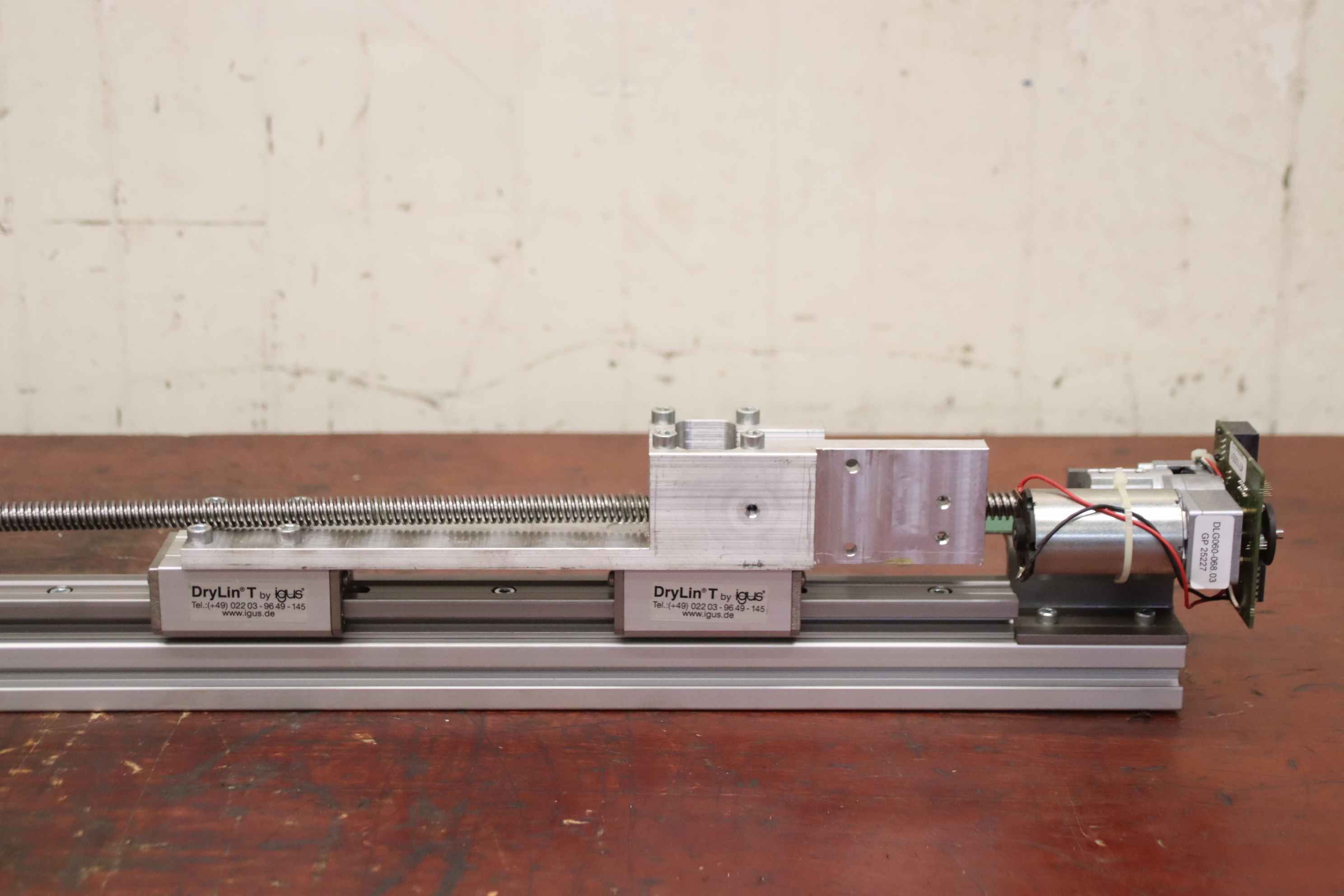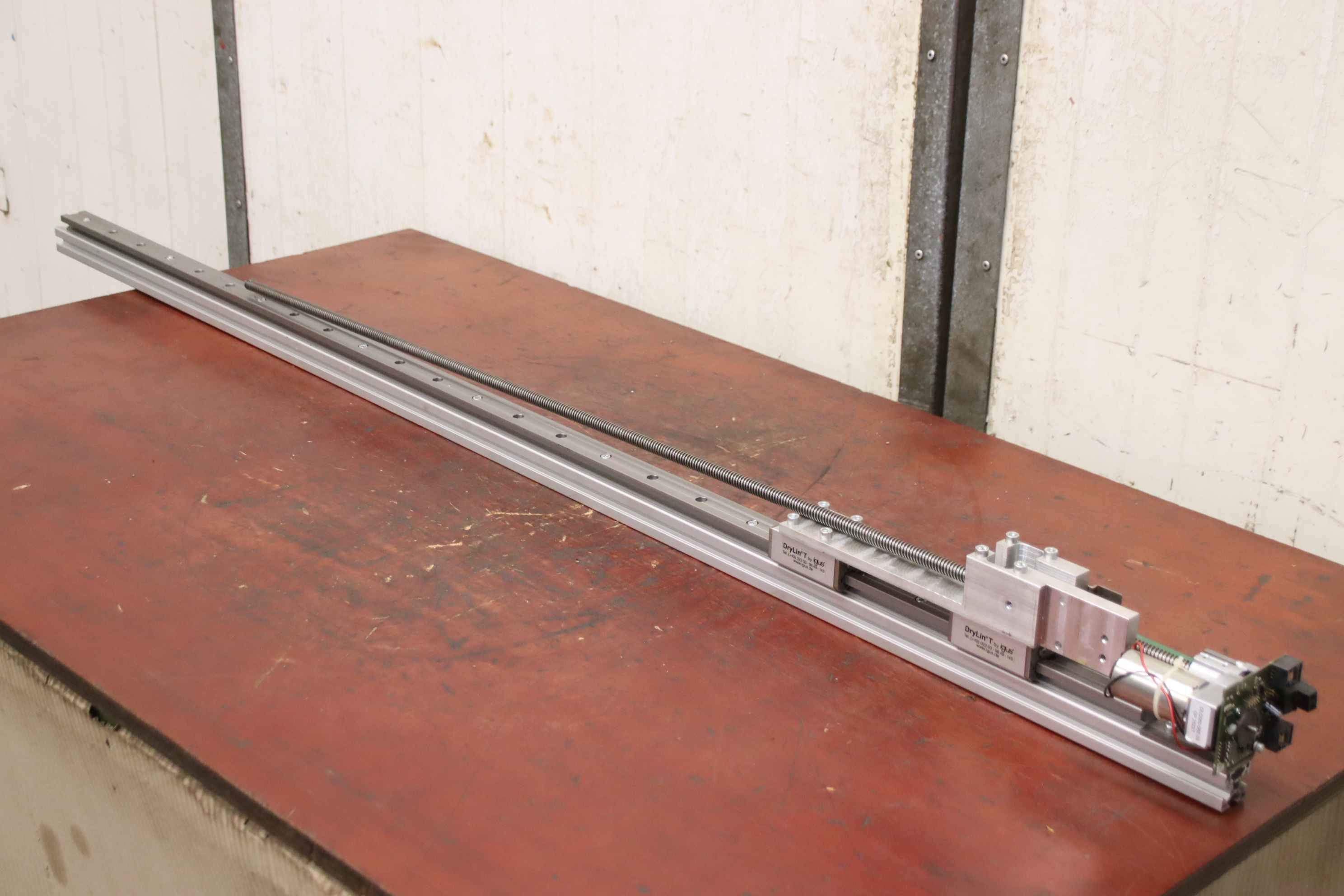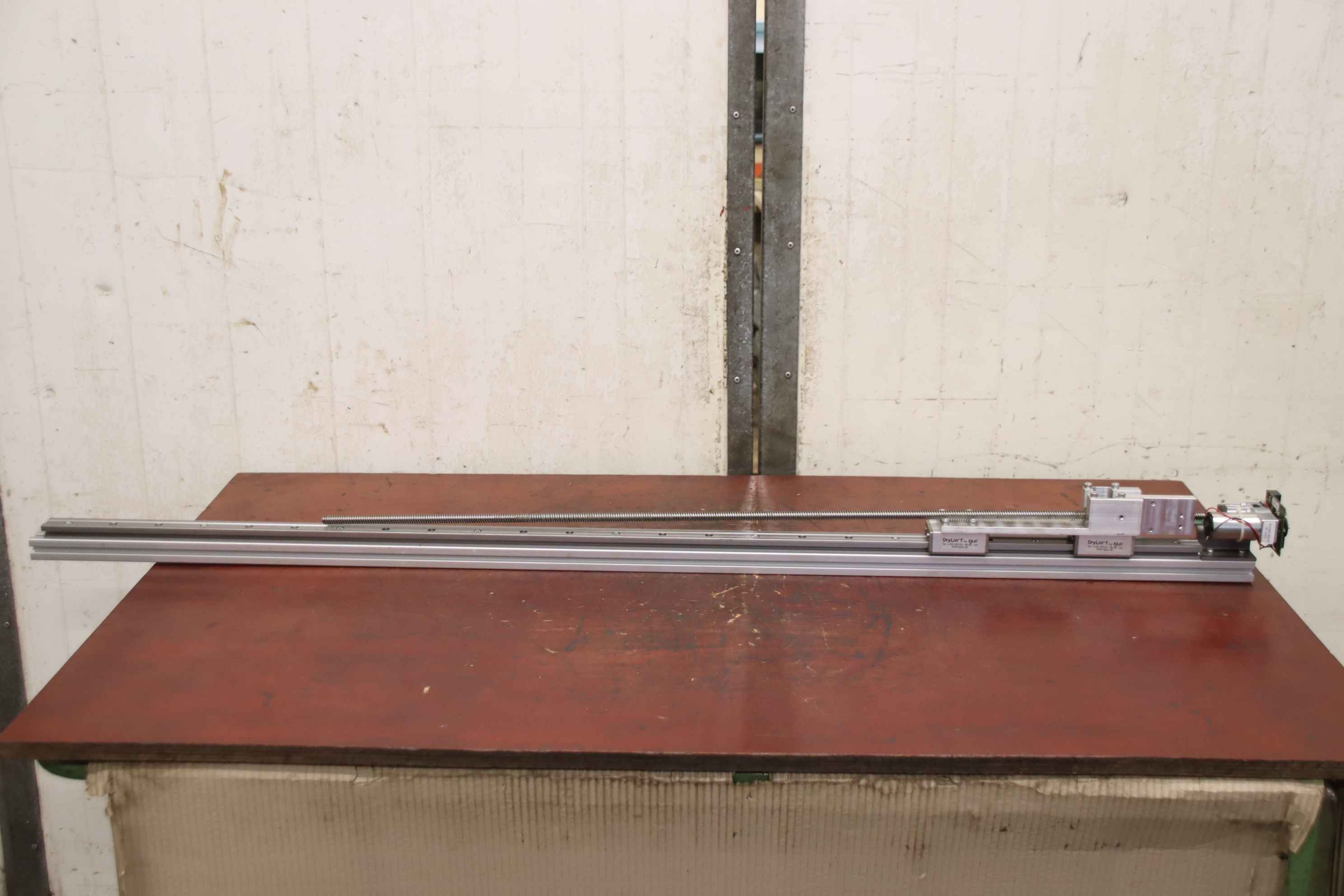 Linear drive, linear gear, lifting gear, spindle drive, linear axis, linear rail, linear guide, roller guide rail, guide carriage, guide rail, rail guide for tool dispensing systems -Manufacturer: igus, linear drive type DryLin T from Achterberg Toolbase AK -Actuator: DLG 060-068.03 -Threaded rod: Ø 12 x 980 mm -Number: 8x linear drive available -Price: per piece -Dimensions: 1615/110/H120 mm -Weight: 5.5 kg/piece