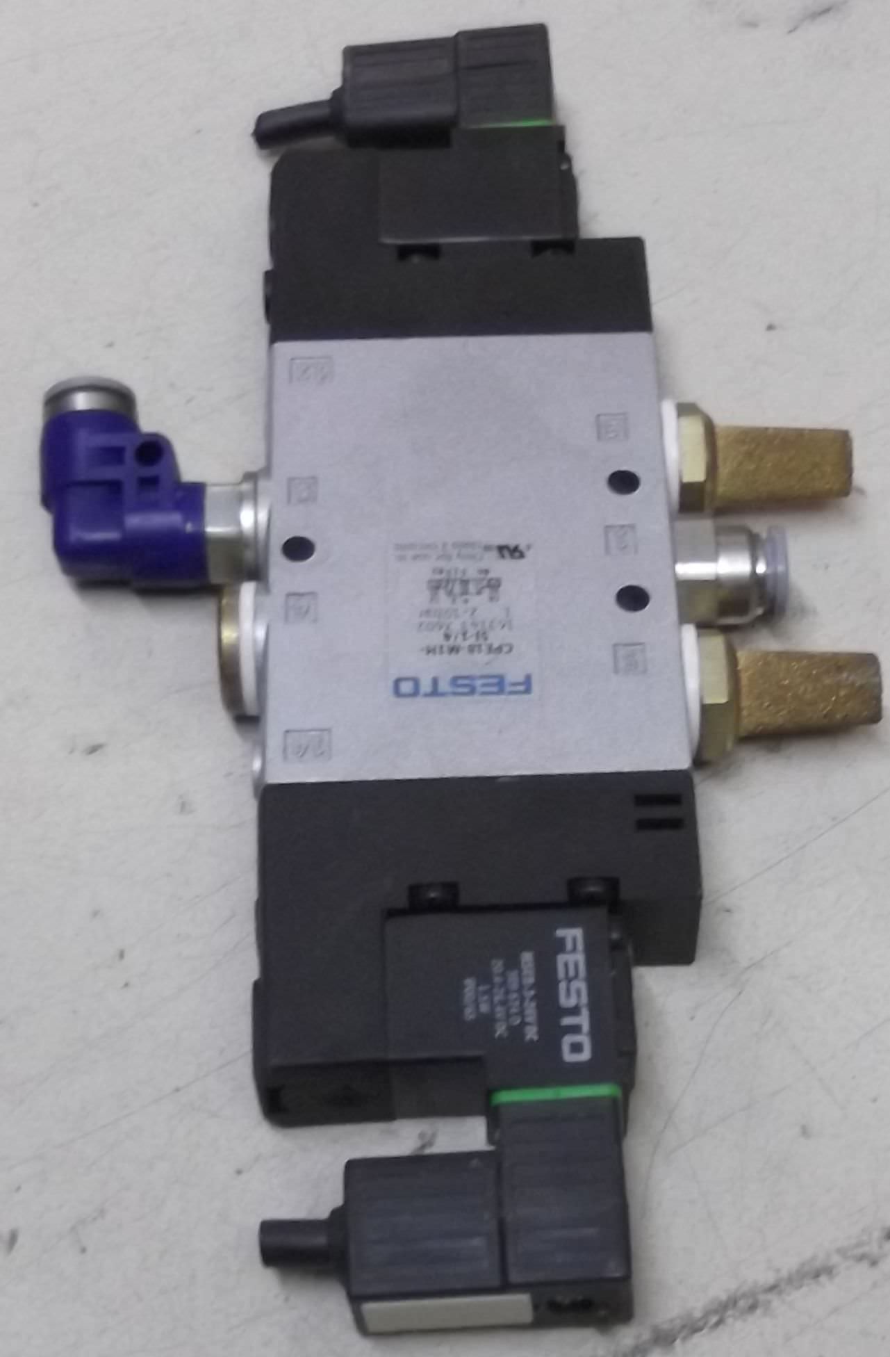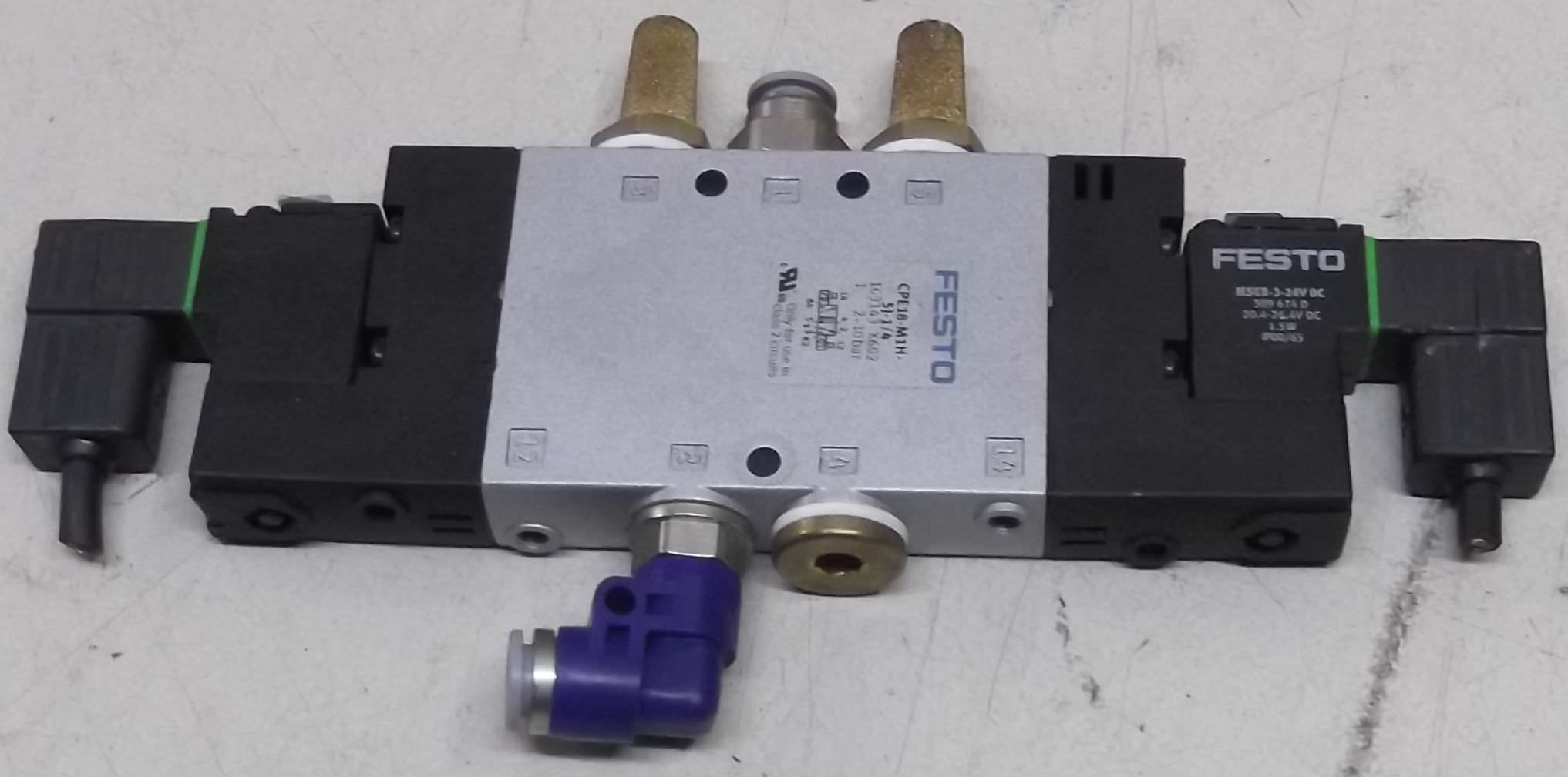 5/2 way valve, solenoid valve, pneumatic valve, air valve, pressure valve, valve block, control block, changeover directional valve -Solenoid valve -Type: CPE18-M1H-5J-1/4 -PN: 2-10 bar -Number: 28 valves available -Price: per piece -Weight: 0.1 kg/piece