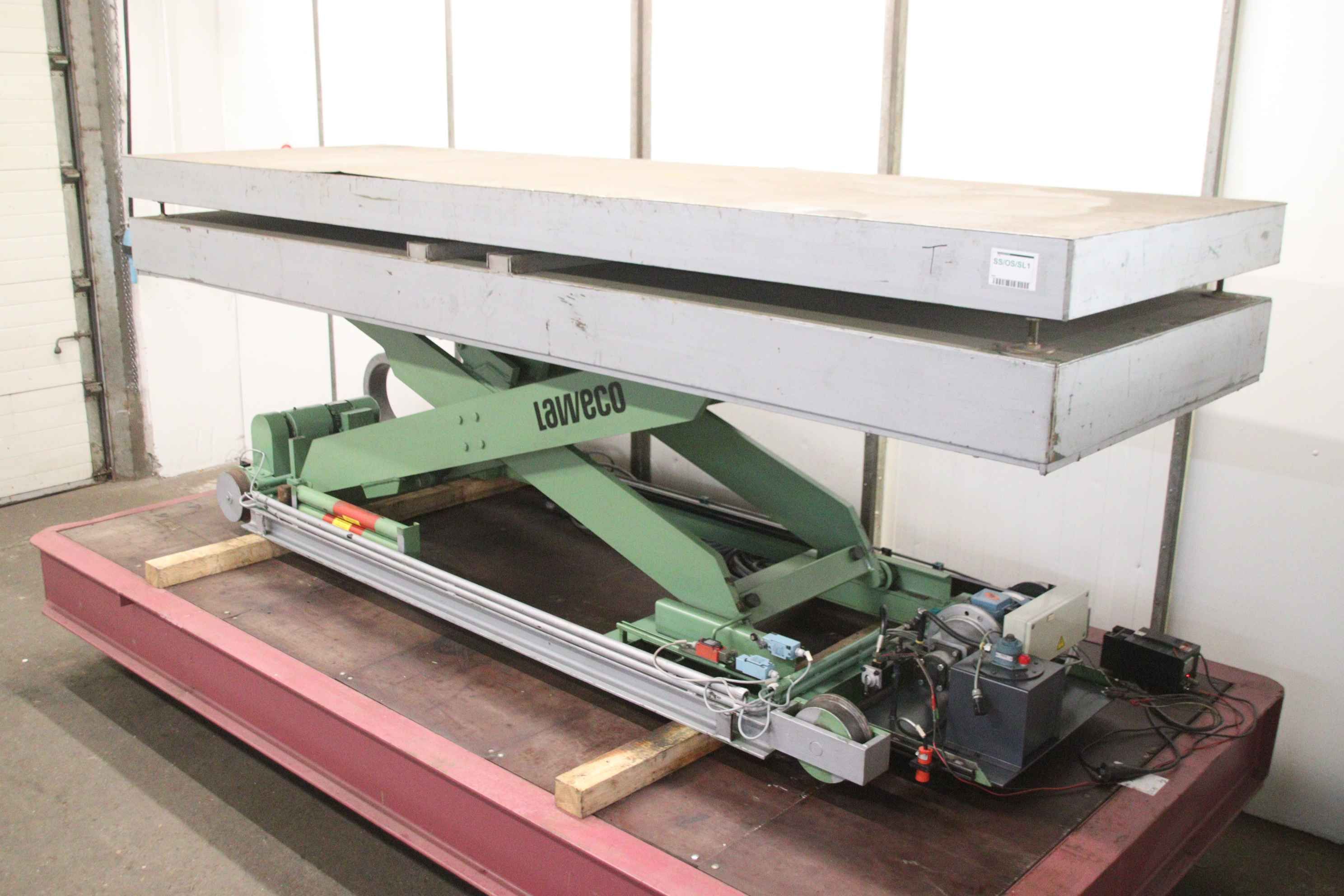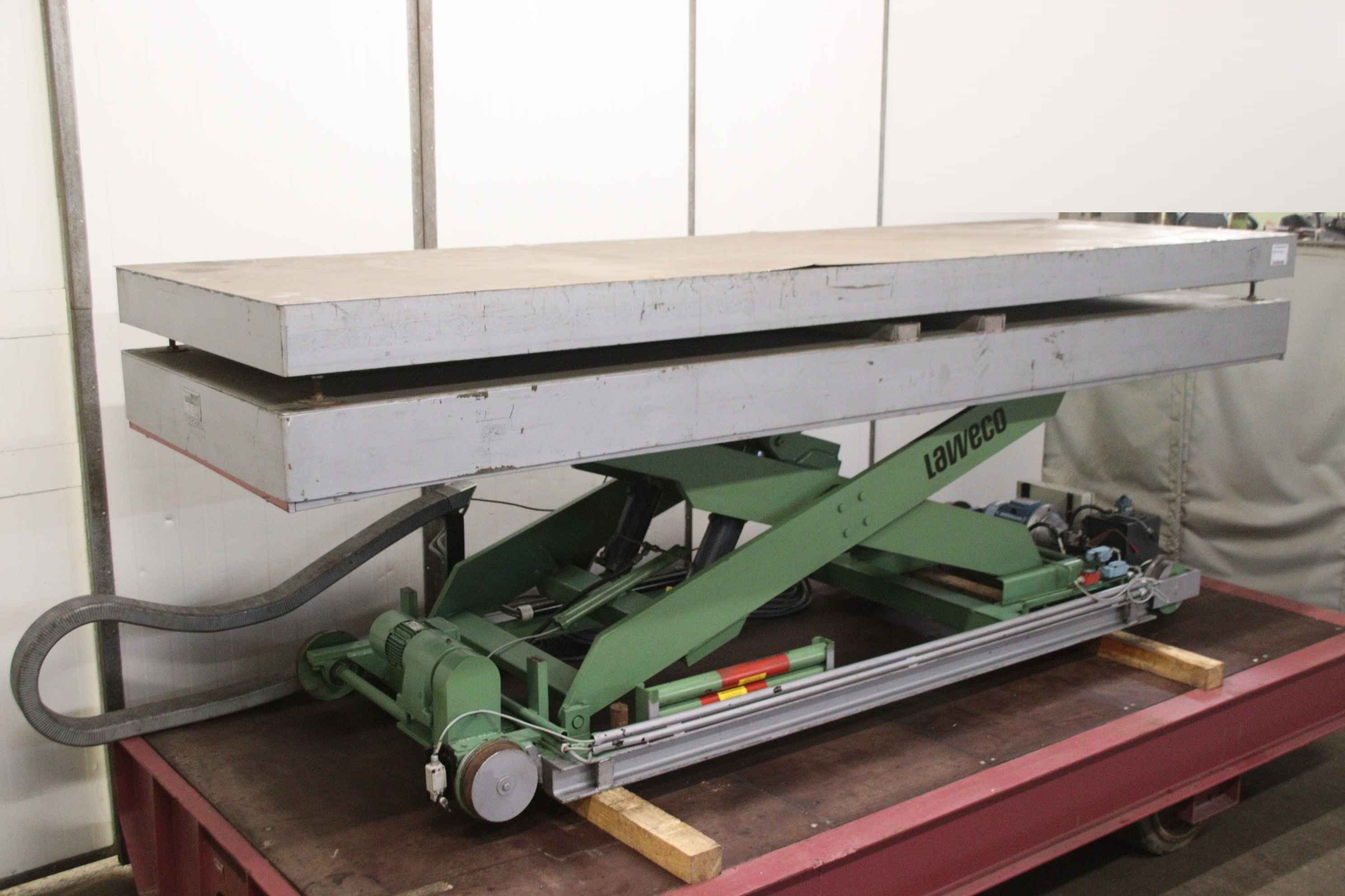 Scissor lift table, scissor lift table, scissor lift platform, scissor lifting platform, single scissor lift table, hydraulic lifting platform -Scissor lift table: with weighing unit and trolley, each without control, and weighing display -Load capacity: 2000 kg -Platform: 4000 x 1420 mm -Dimensions retracted: height 430/675 mm -Extended dimensions: height 1145/1390 mm -Rolling chassis: roller spacing for rail 1100 mm -Transport dimensions: 1420/4000/H675 mm -Weight: 2600 kg
