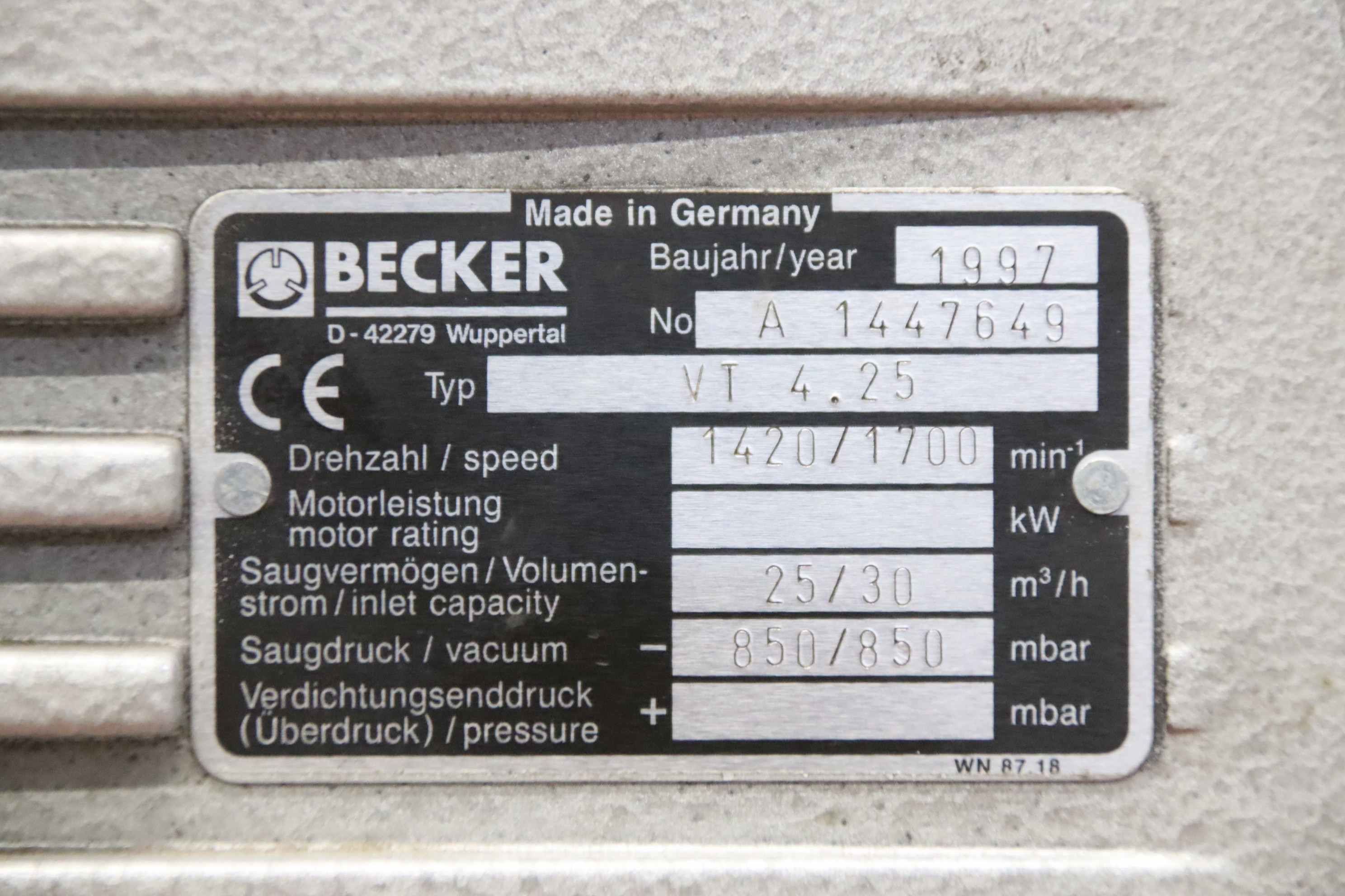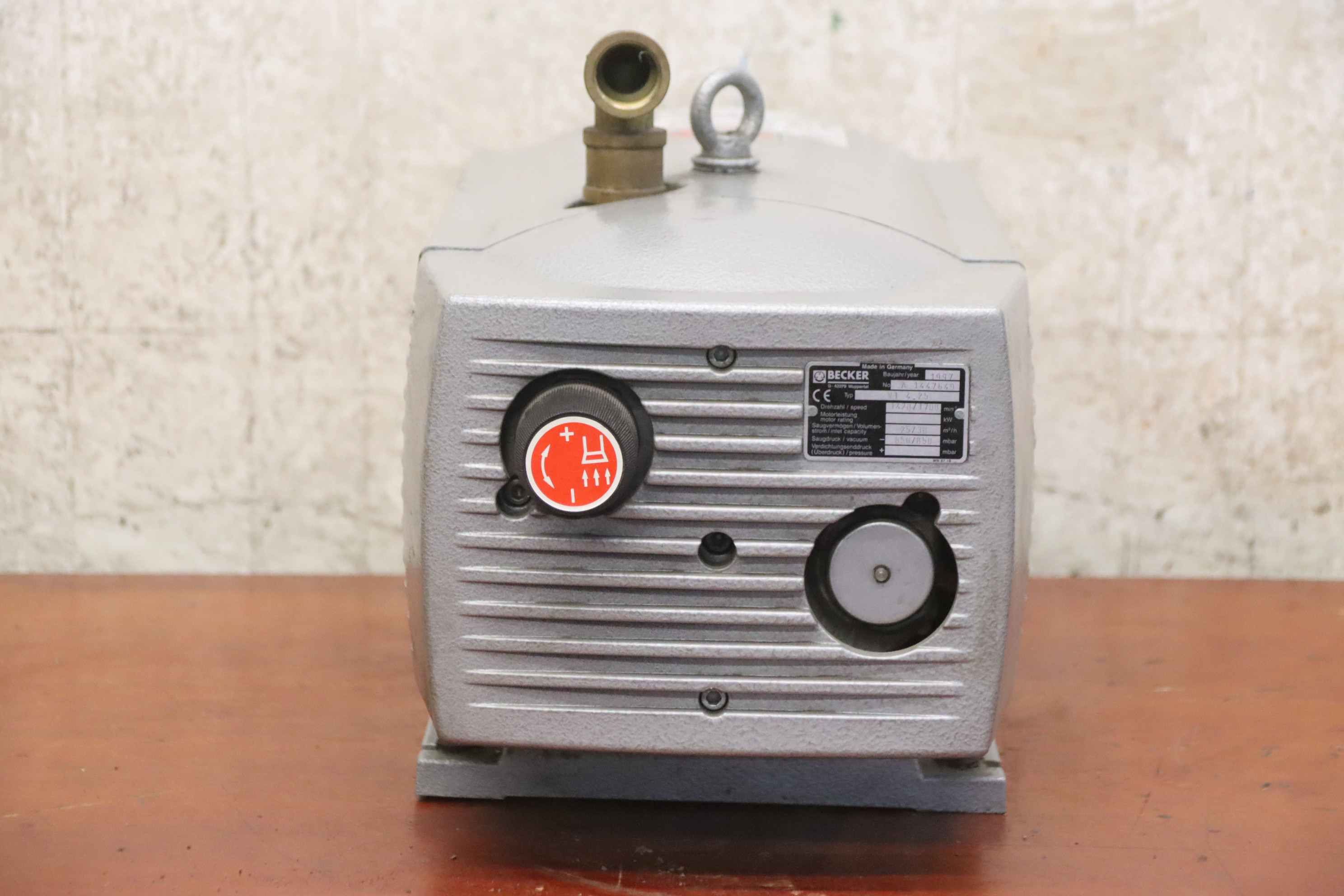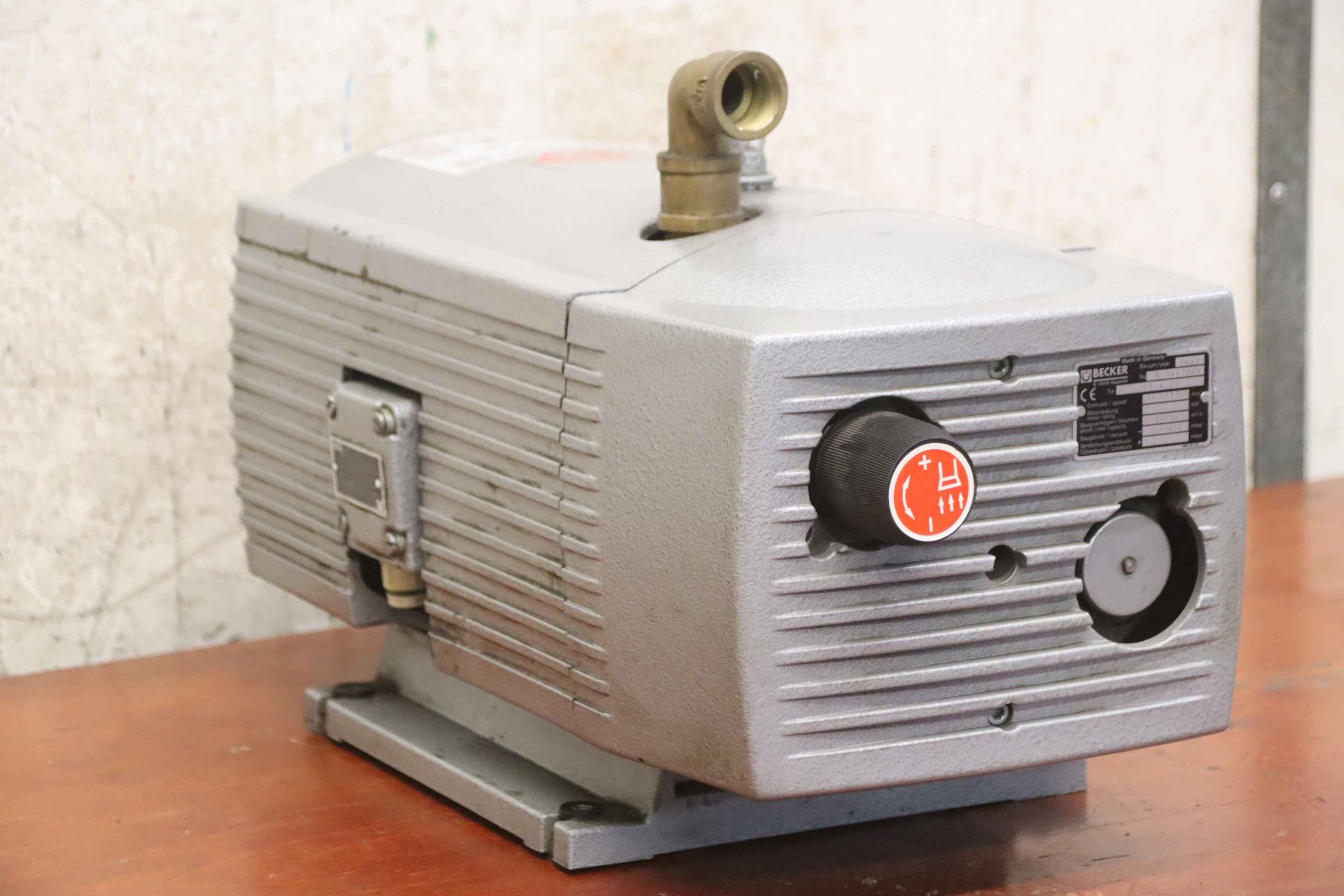 Vacuum pump, rotary vane pump, rotary vane vacuum pump, pressure/vacuum pump, rotary vane pressure/vacuum pump -Manufacturer: Becker, vacuum pump type VT 4.25 -Drive: AEG 0.75 kW / 1420 rpm -Volume flow rate: 25 m³/h -Suction pressure: -850 mbar -Quantity: 1 pump available -Dimensions: 490/250/H300 mm -Weight: 31 kg