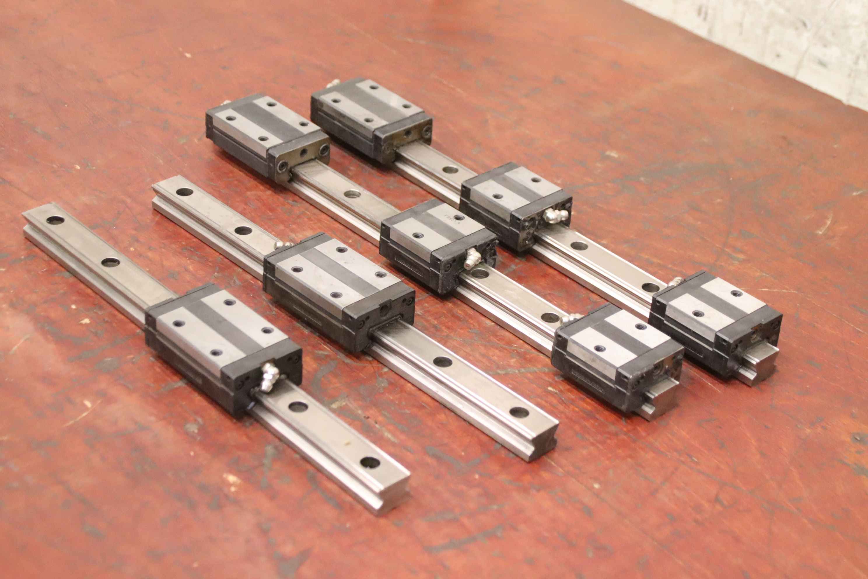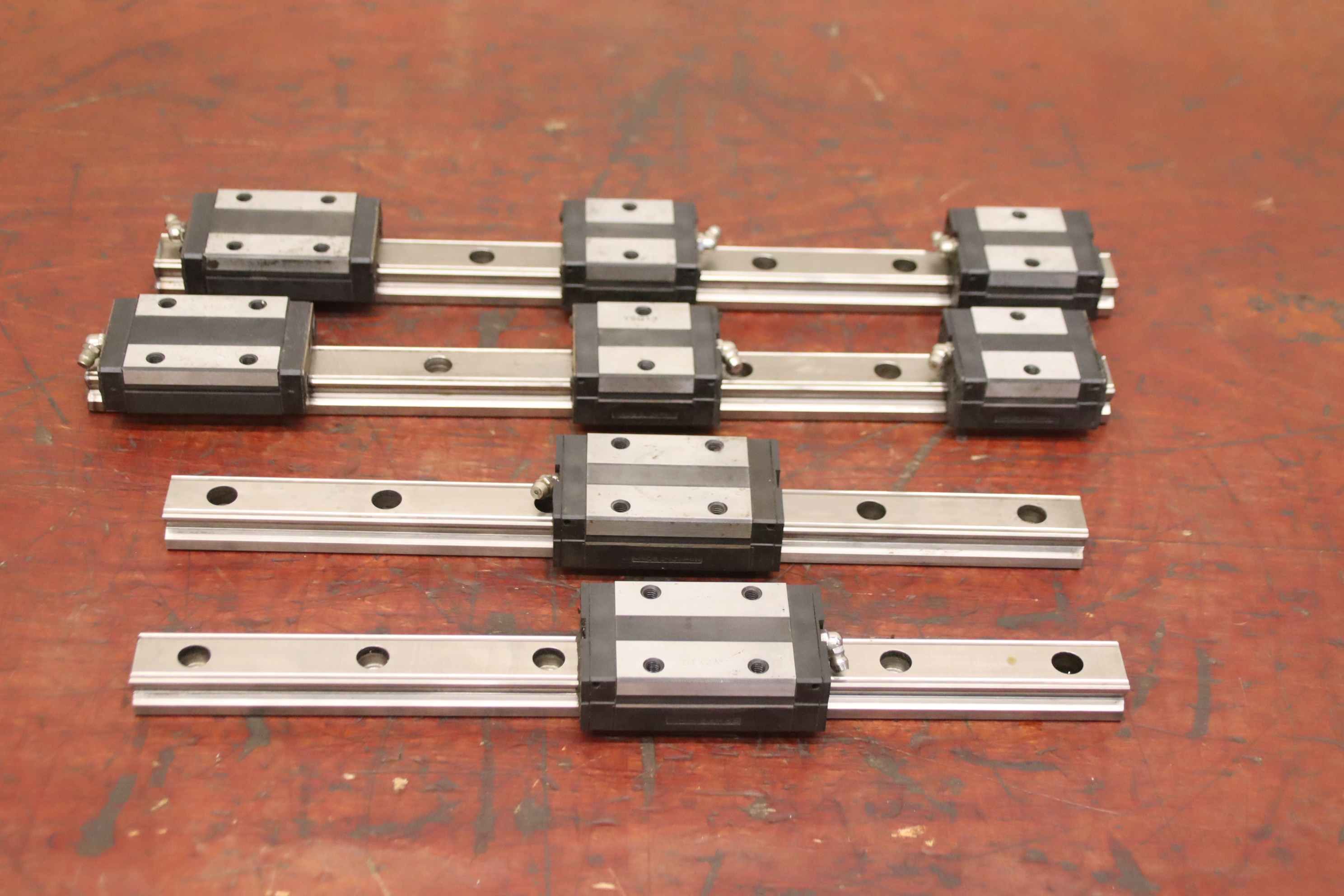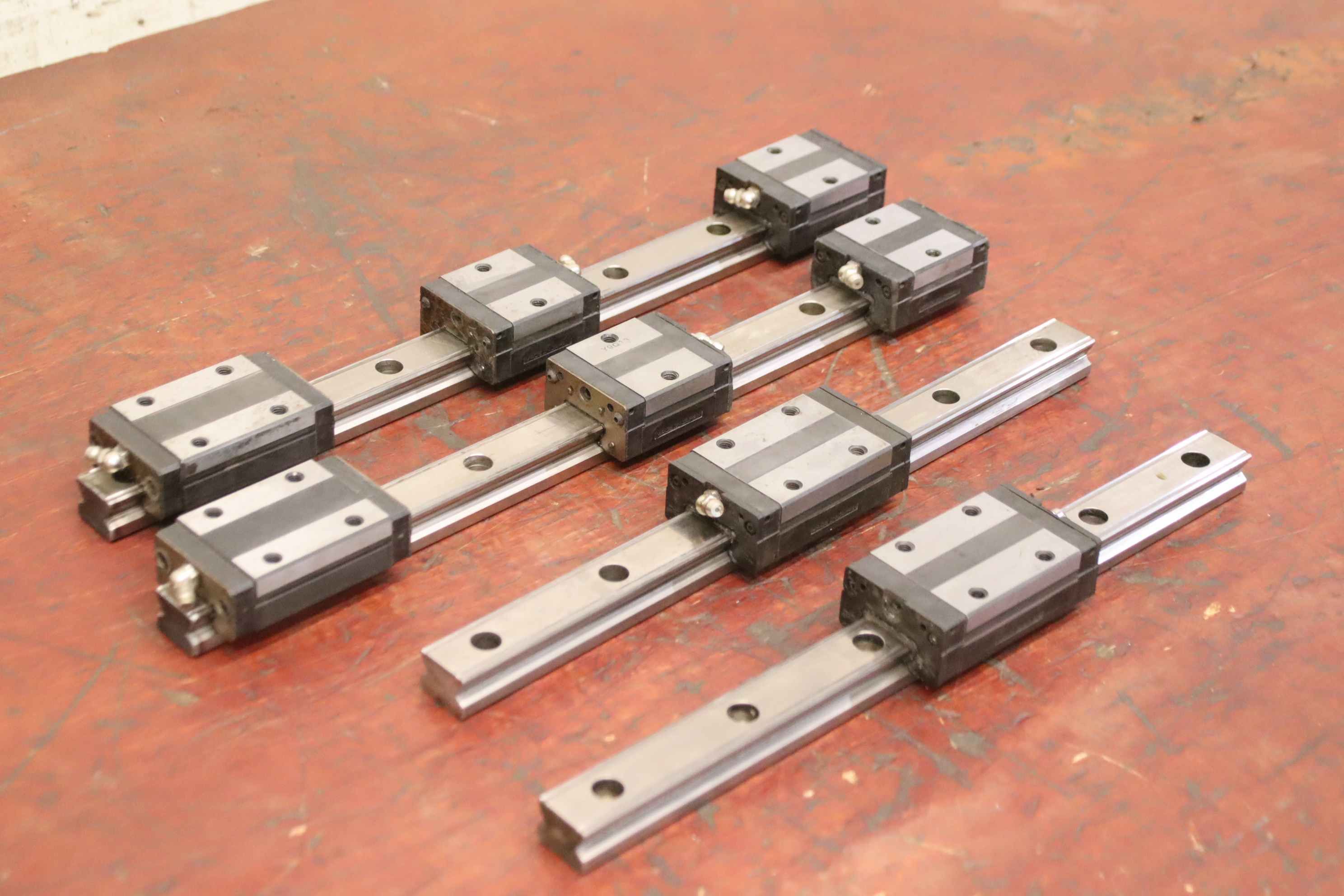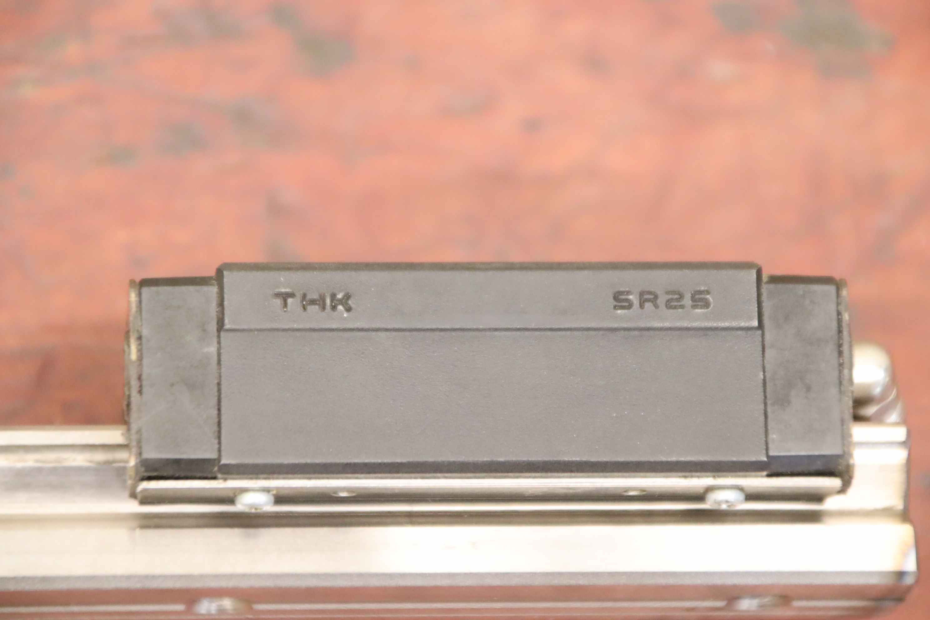 Linear bearing, linear rail, linear guide, roller guide rail, guide carriage, guide rail, roller carriage-Manufacturer: THK, 4 pieces guide rails with 8 pieces guide carriages/slides-Guide carriage: Type SR-Rail length: 410/340 mm-Rail width: 23 mm-Dimensions: in the pictures-Delivery/Price: complete-Transport dimensions: 410/100/50 mm-Weight: 6.7 kg
