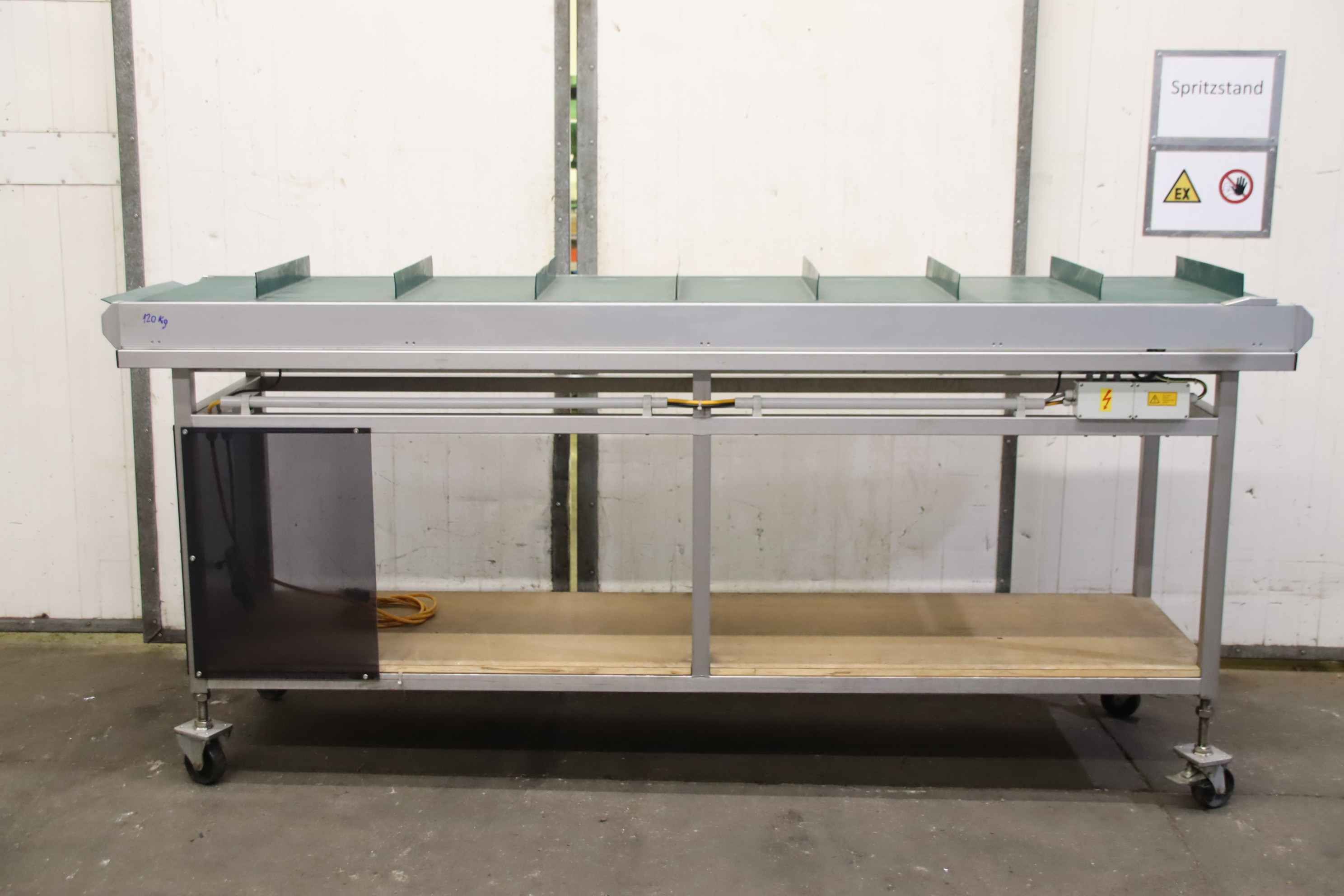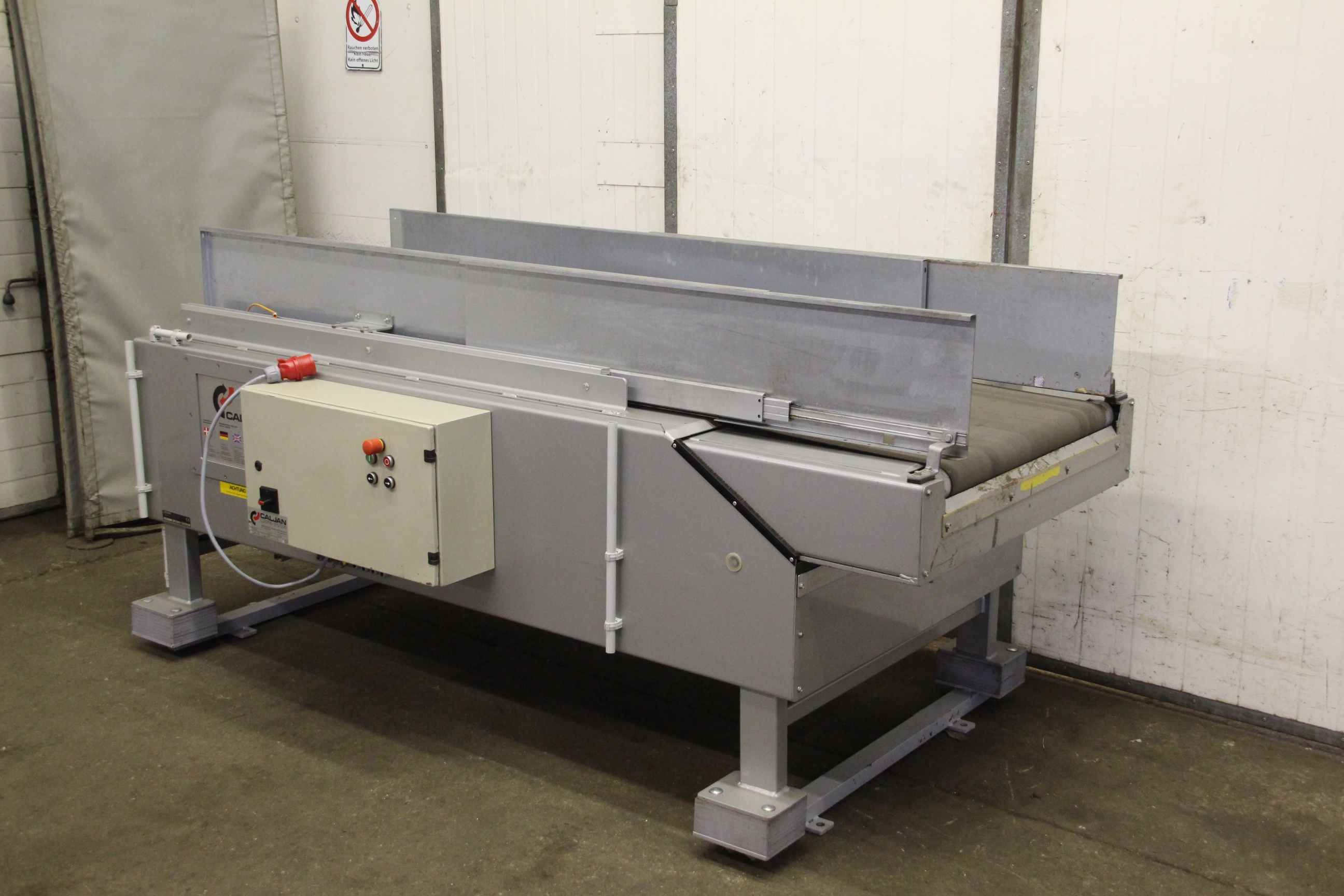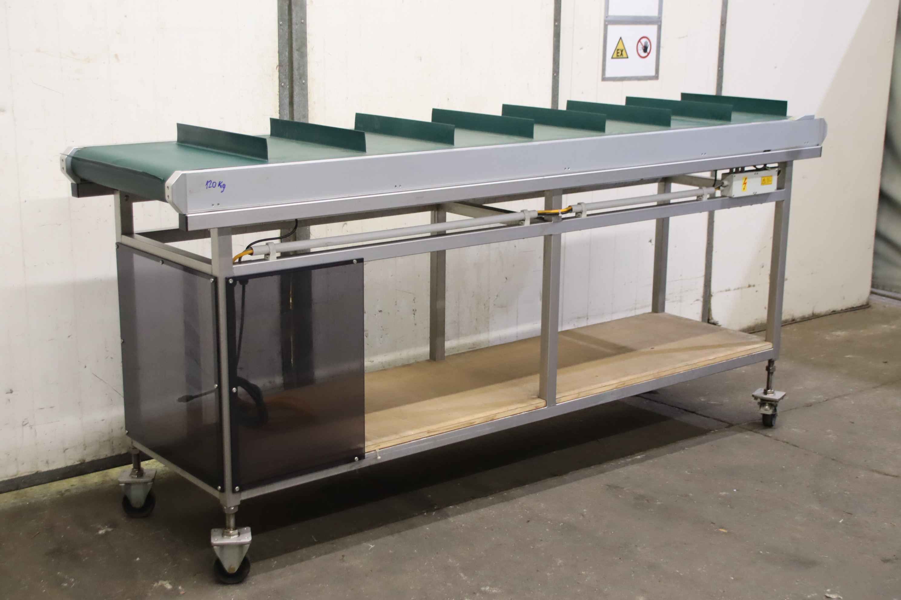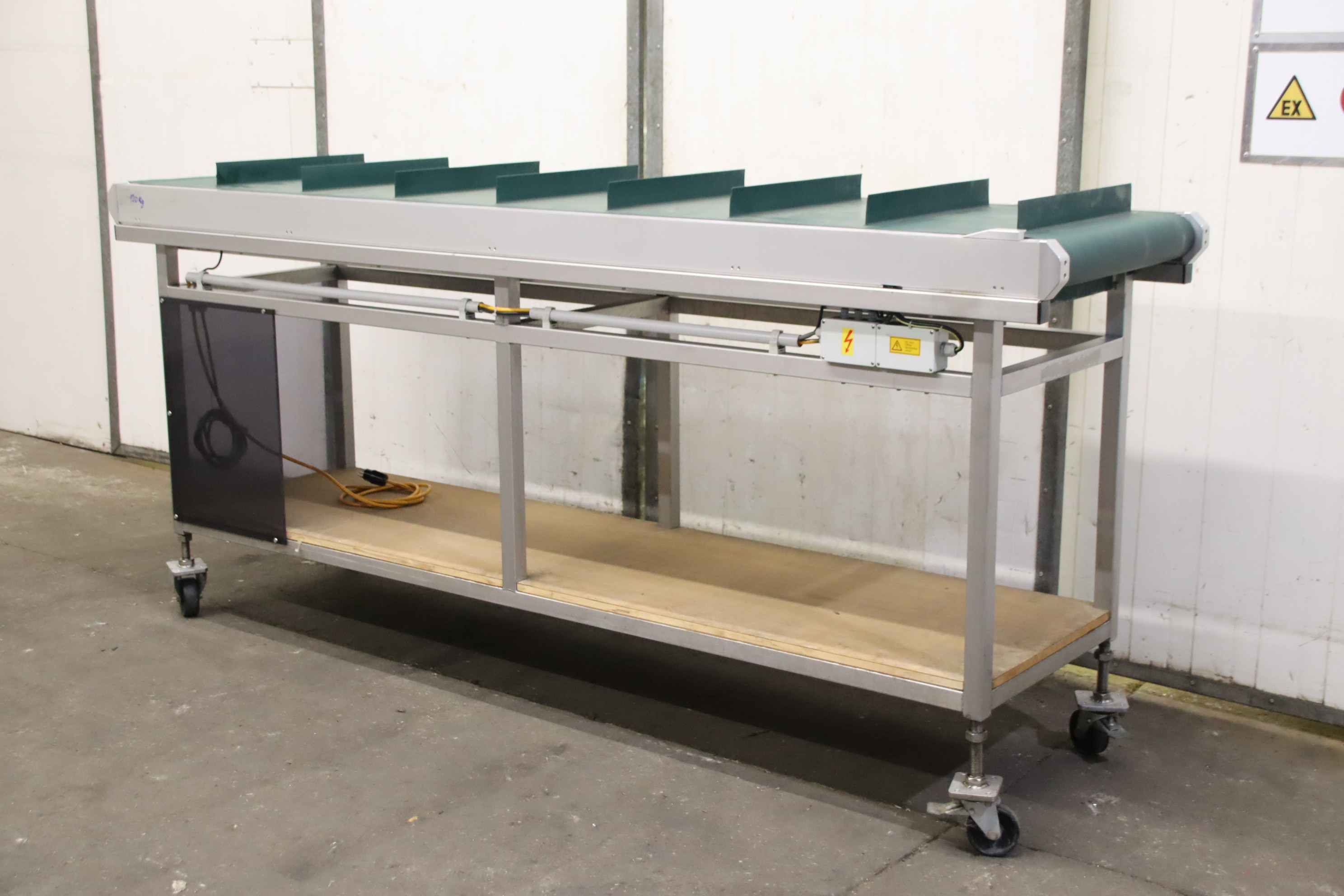 Conveyor belt, belt conveyor belt, conveyor belt, belt conveyor, sorting belt, sorting conveyor belt, readout conveyor belt-Side walls made of: stainless steel-Speed: 118 m/min-Drive: 0.75 kW-Belt width: 590 mm-Length: 2000 mm-Transport dimensions: 4360/1170/H1170 mm-Weight: 684 kg