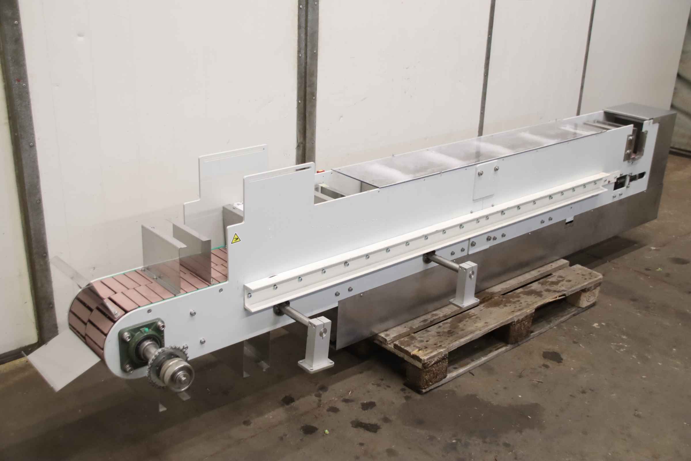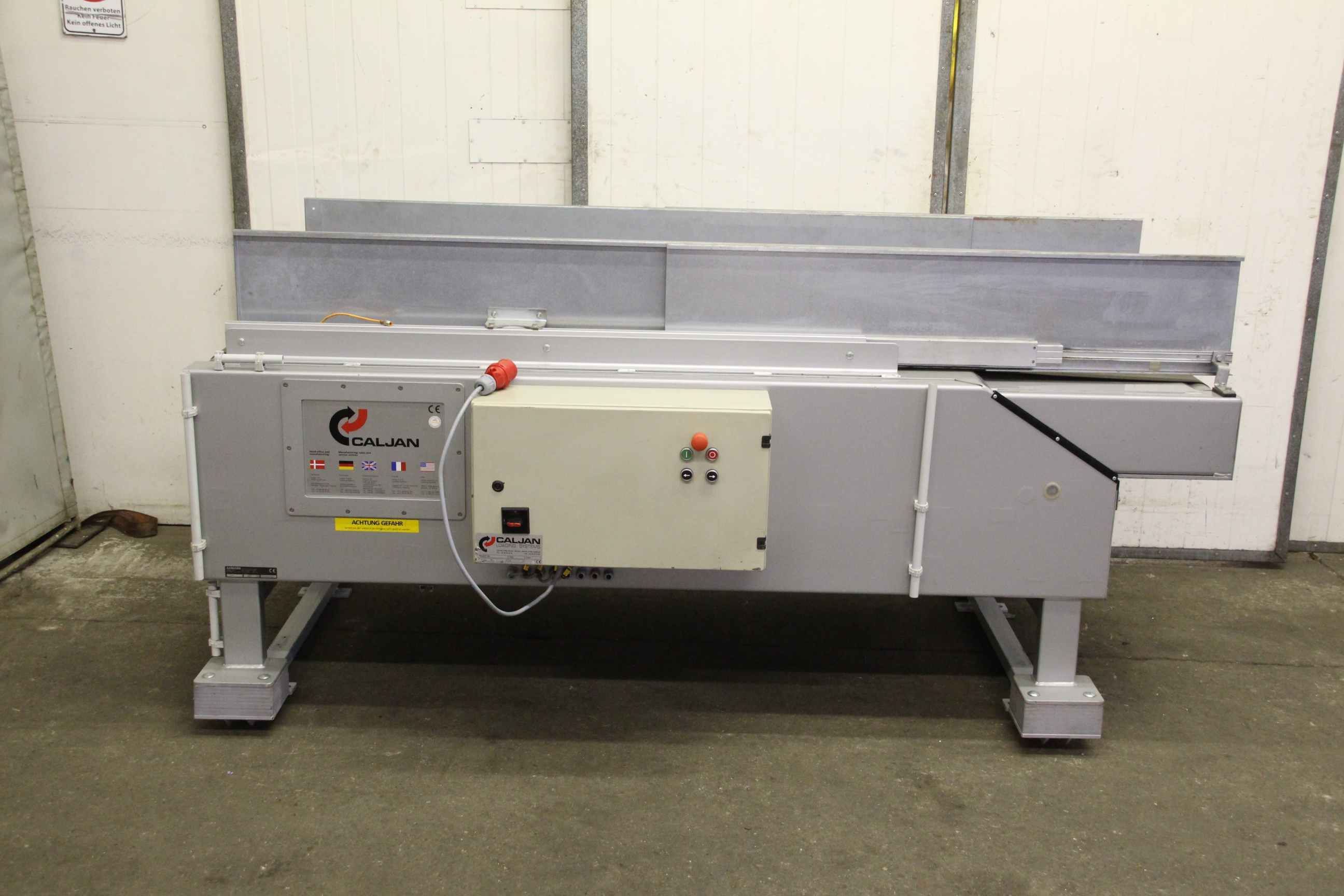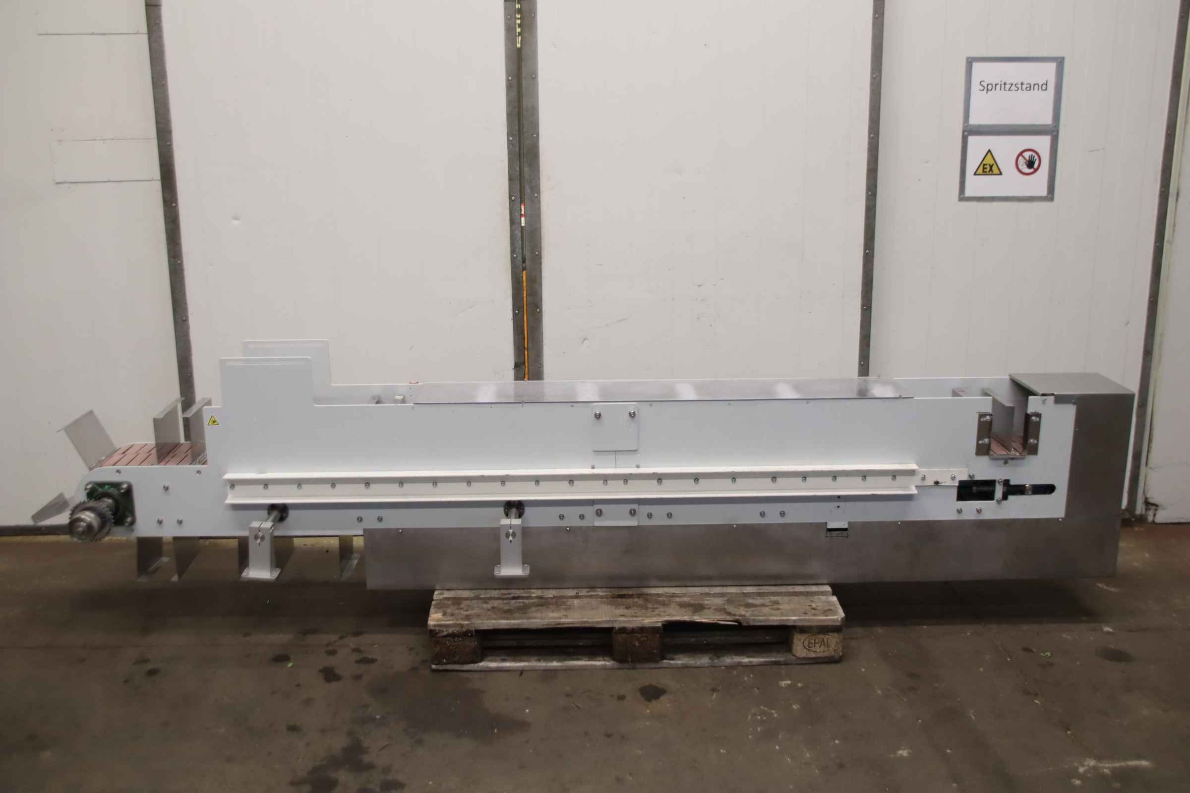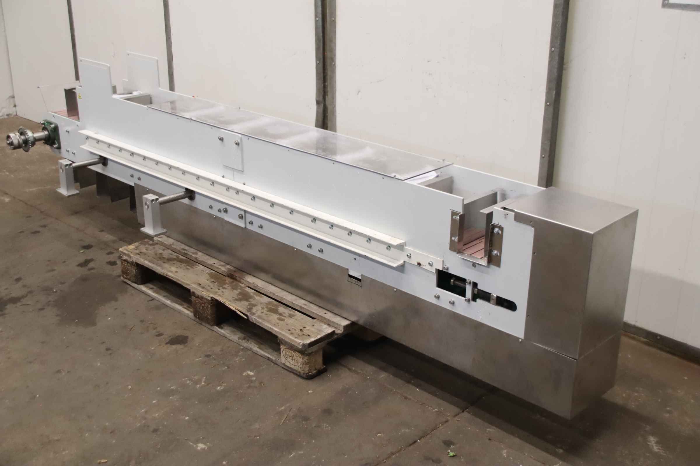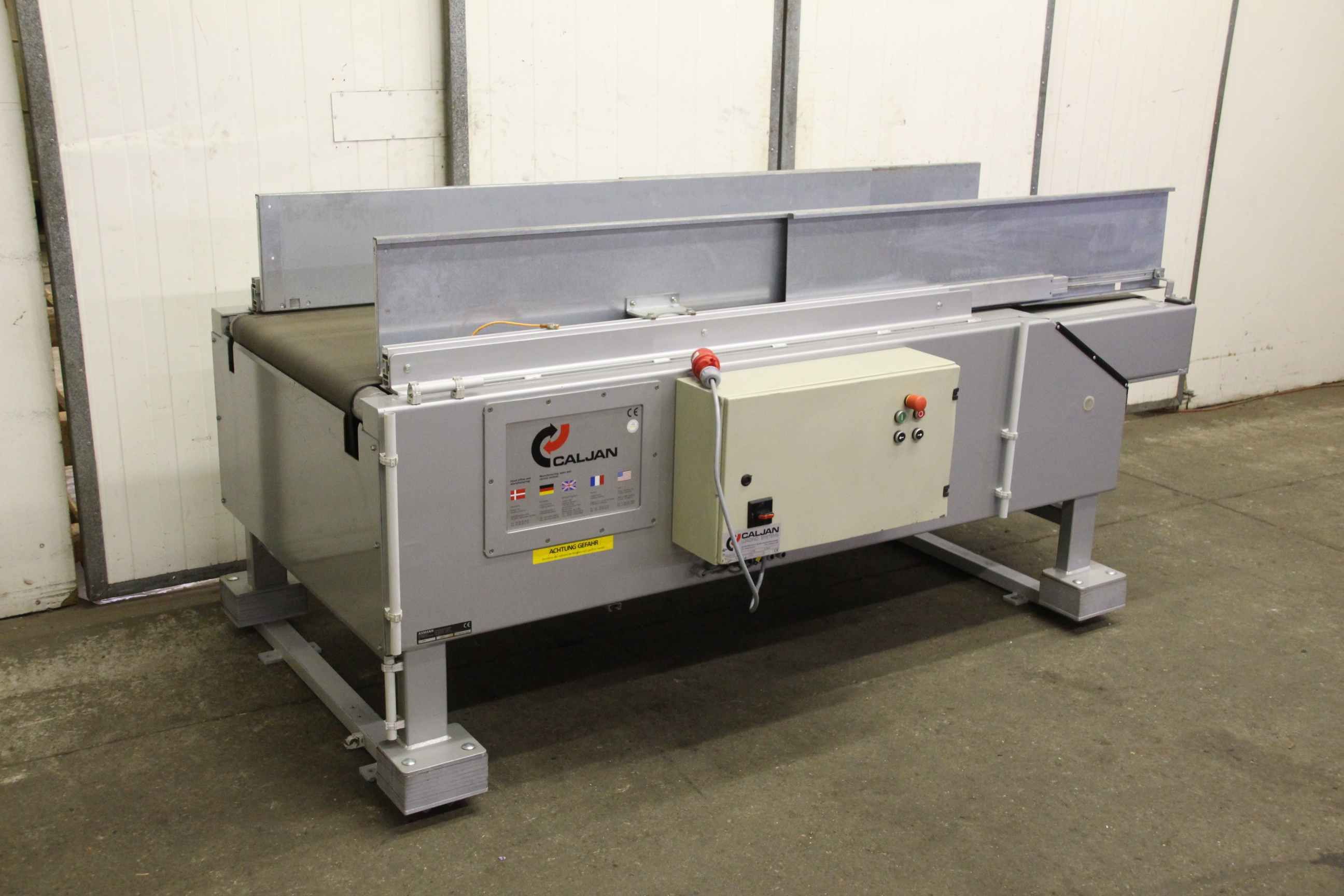 Conveyor belt, belt conveyor belt, conveyor belt, belt conveyor, sorting belt, sorting conveyor belt, readout conveyor belt-Side walls made of: stainless steel-Speed: 118 m/min-Drive: 0.75 kW-Belt width: 590 mm-Length: 2000 mm-Transport dimensions: 4360/1170/H1170 mm-Weight: 684 kg