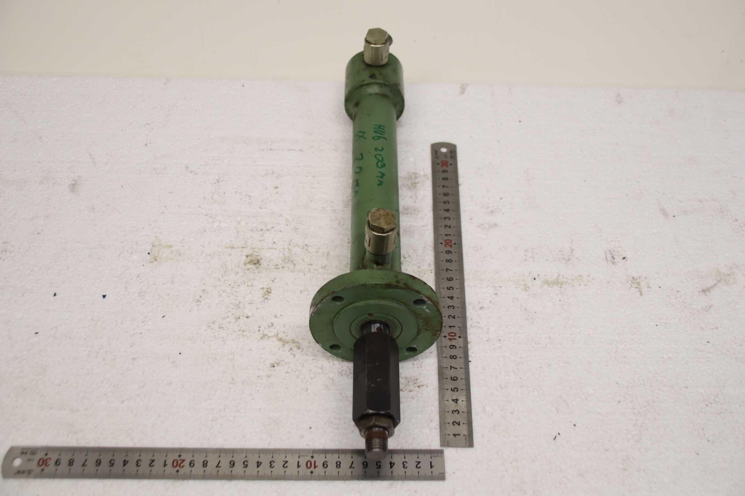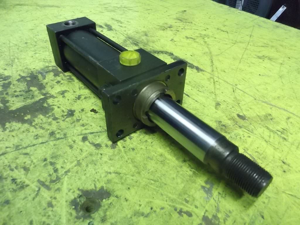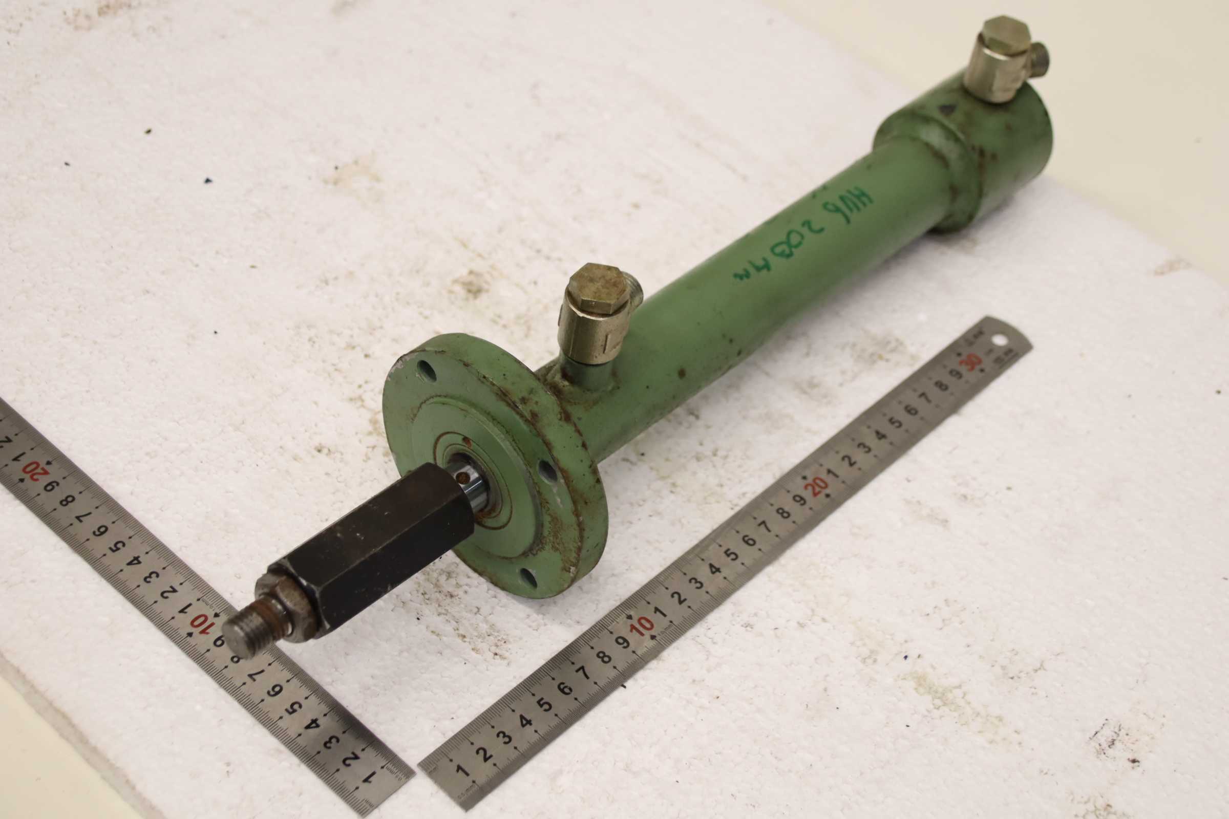 Hydraulic cylinder, support cylinder, hydraulic piston, pressure piston -Hydraulic cylinder: double-acting, stroke 200 mm -Piston rod: Ø 20 mm -Mounting: Bolt circle Ø 85 x 8 mm / see photos -Number: 4 cylinders available -Price: per piece -Dimensions: 440/104/H123 mm -Weight: 8.5 kg/pc.