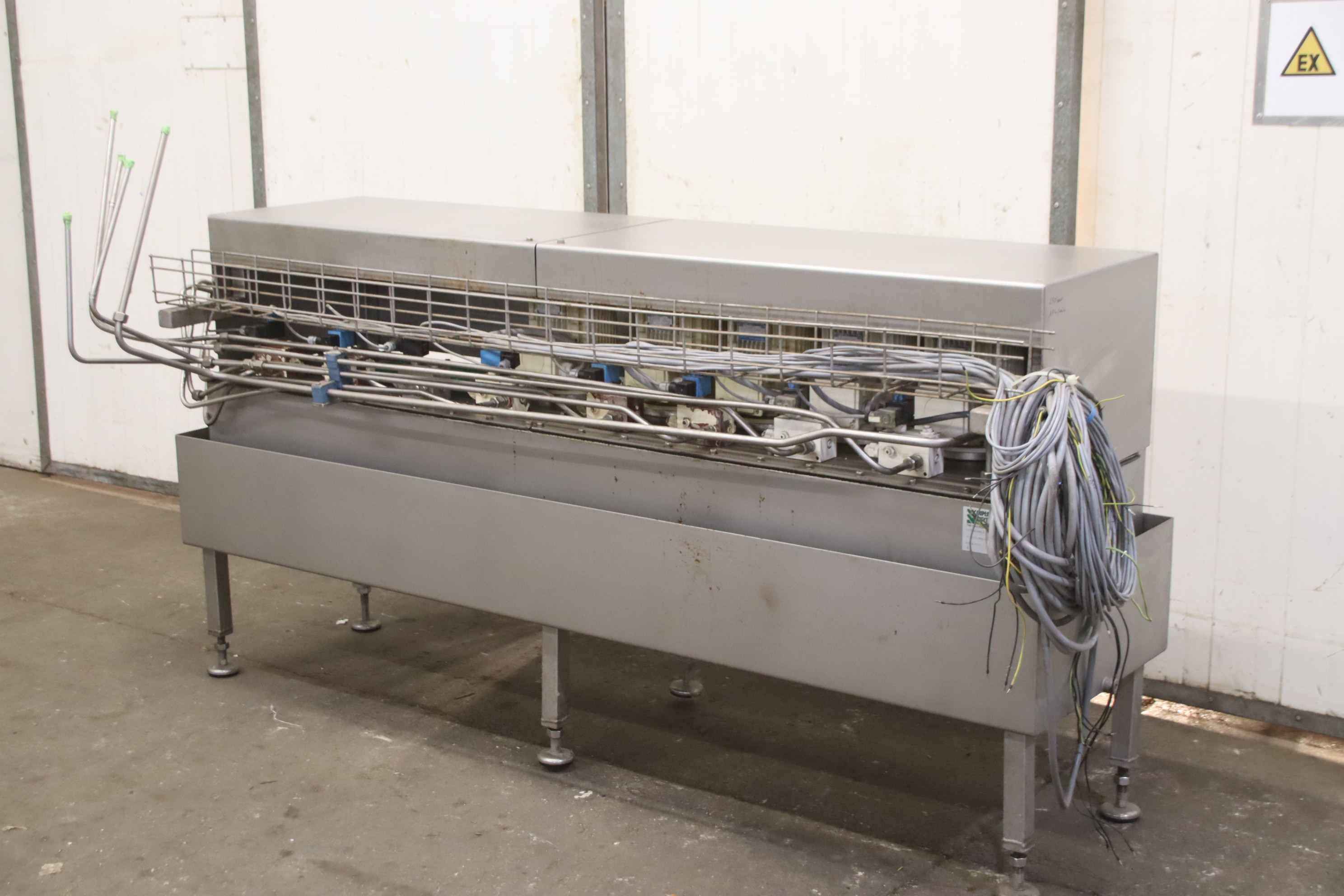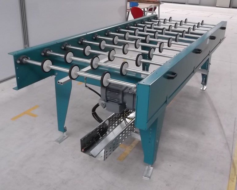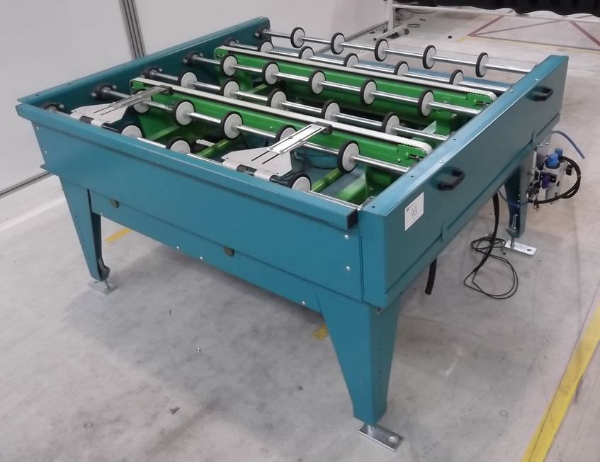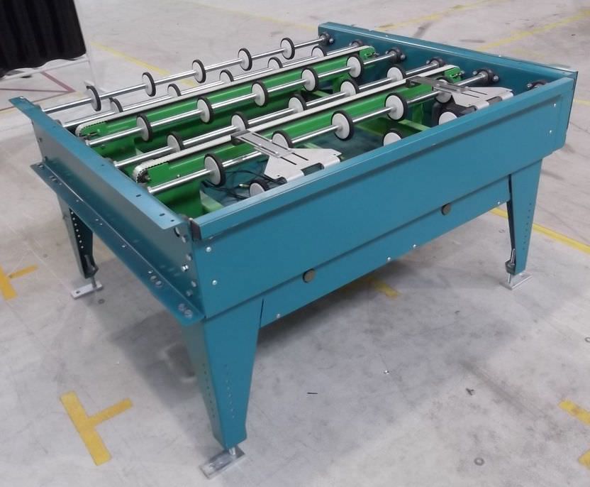 Corner transfer unit, roller conveyor, roller conveyor, powered roller conveyor, roller conveyor, roller conveyor with extraction conveyor -stable execution -electrically driven -Drive motor roller conveyor: 0.18 kW 71 rpm -Drive motor conveyor belt: 0.18 kW 88 rpm -Roll width: 1440 mm -Conveying length: 1550 mm -Transfer of conveyor belts: 1400 mm -pneumatic lifting -Diameter roller: 105 mm -Rollers: rubberized -Diameter shaft: 25 mm -Delivery height: 950 mm adjustable -driven: via toothed belt -Number: 1x roller conveyors available -Price: per piece -Dimensions: 1550/1650/H950 mm -Weight: 420 kg