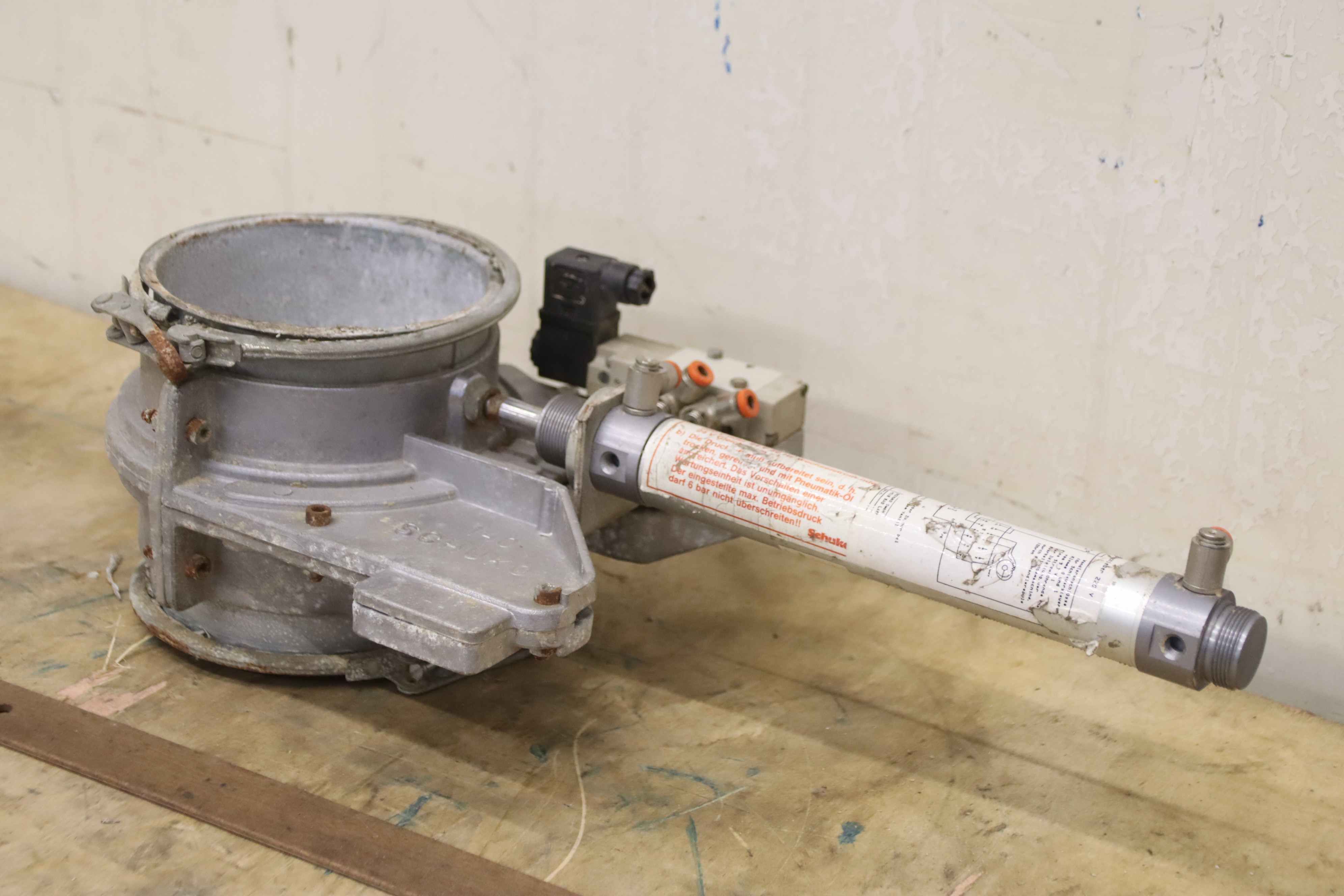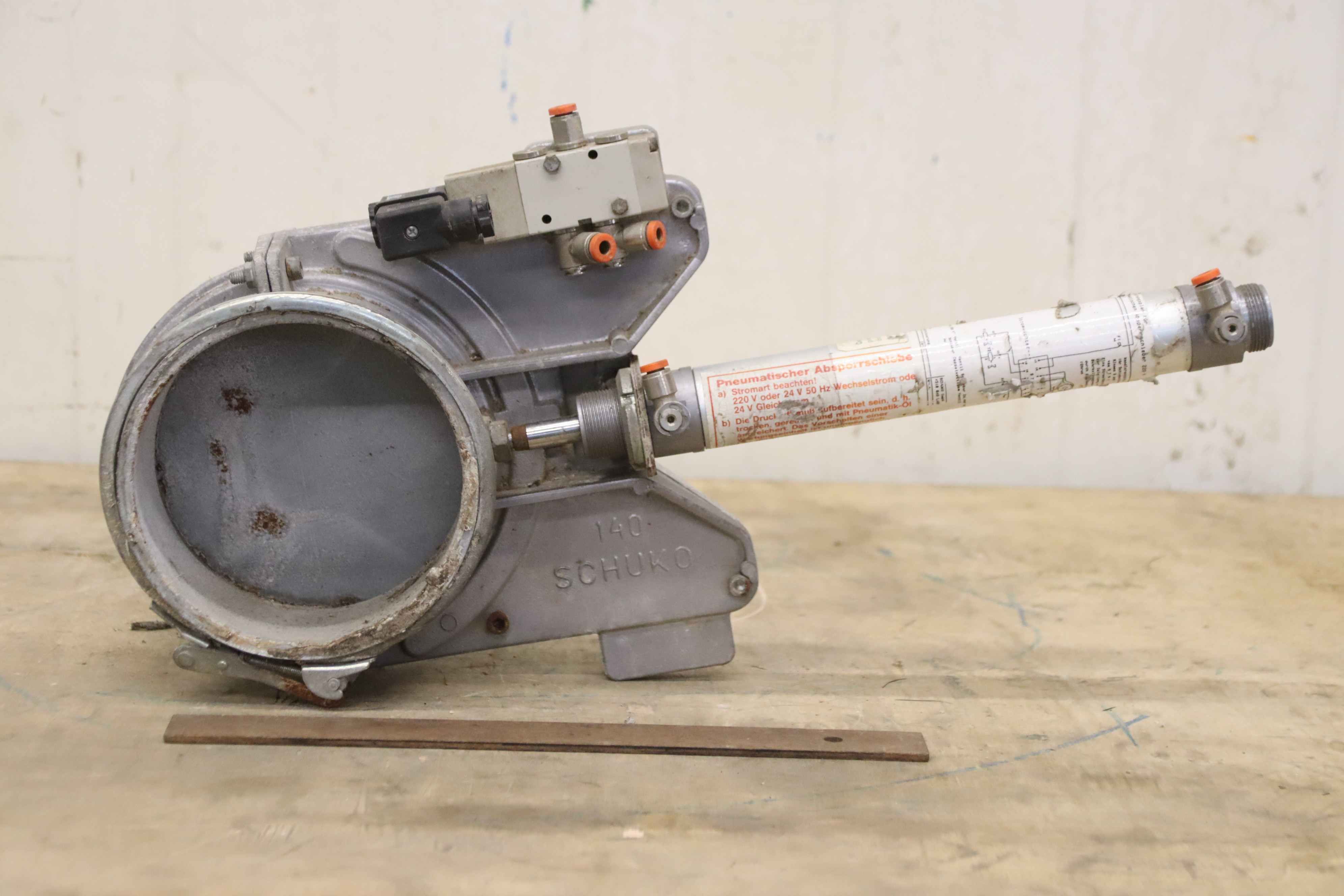 Butterfly valve, flap valve, ball valve, butterfly valve, shut-off valve, gate valve, pneumatic energy saving gate valve-Manufacturer: Schuko, pneumatic gate valve type 140-Diameter: 140 mm-Valve drive: 220 V, convertible to 24 V-Nominal pressure: max. 6 bar-Number: 3x gate valve available-Price per piece-Dimensions: 520/260/H160 mm-Weight: 4,4 kg/pc.