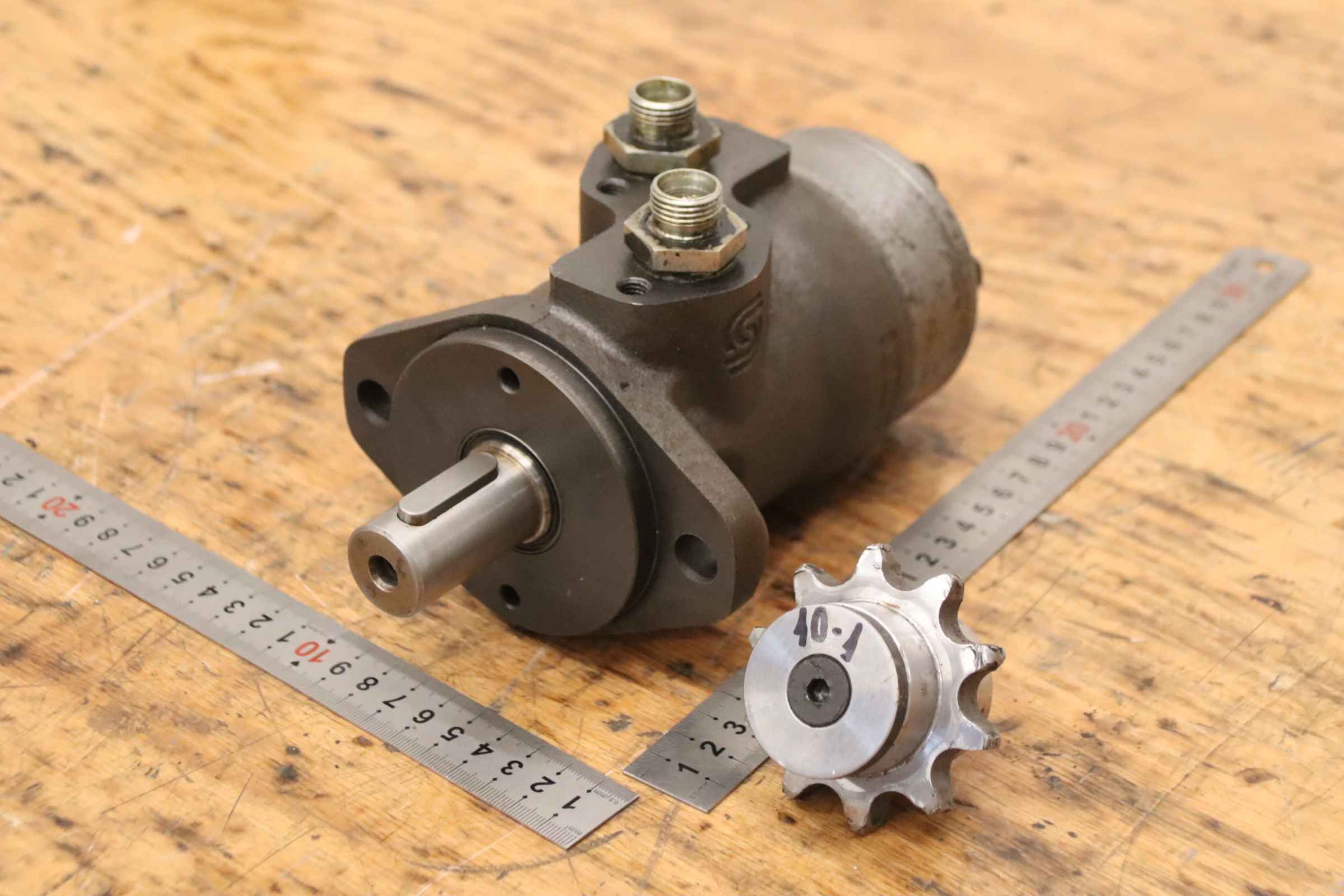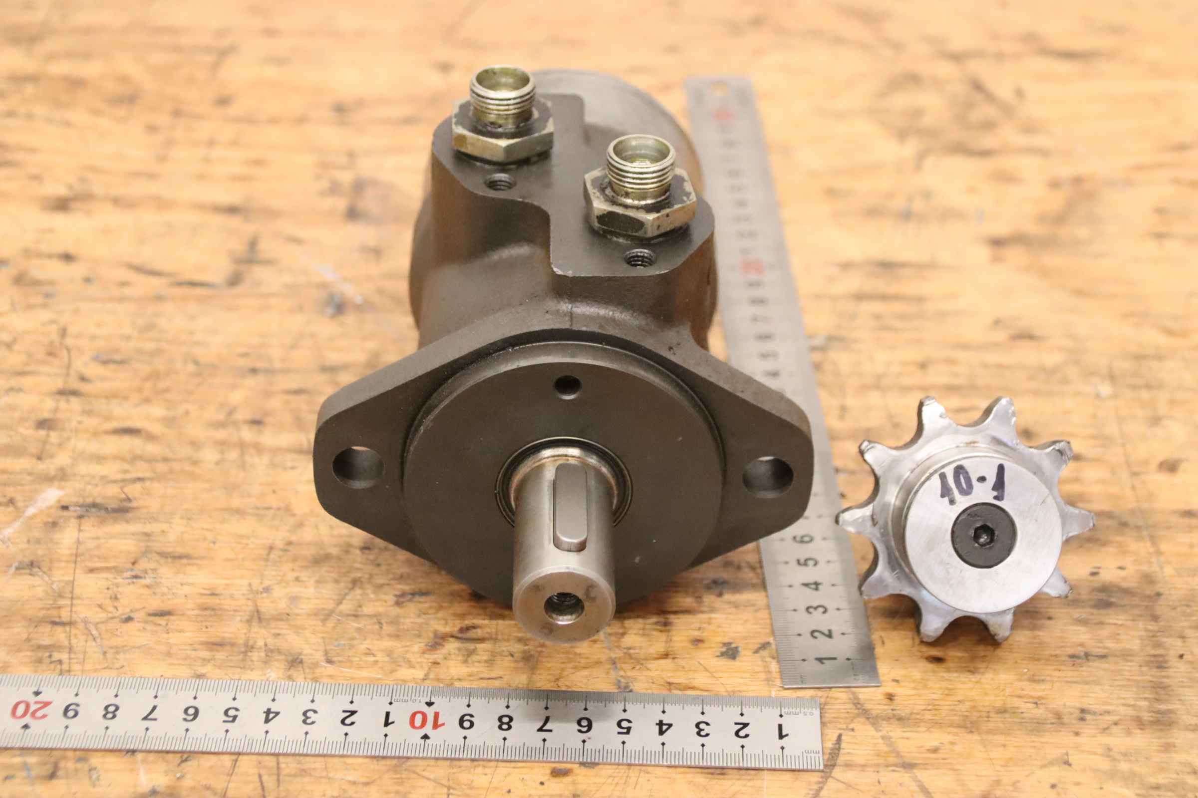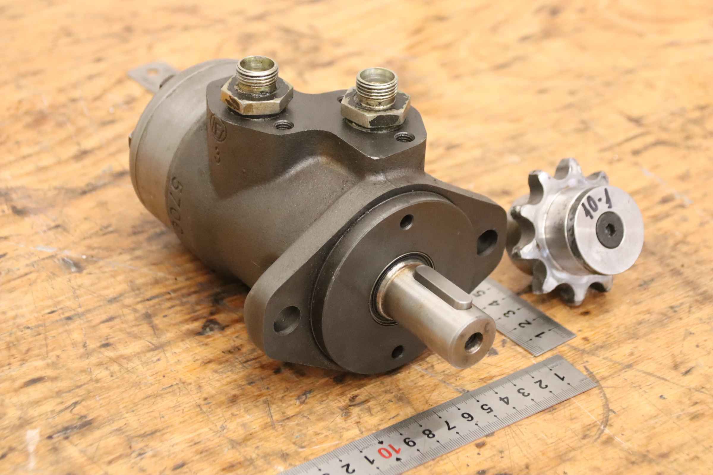 Hydraulic motor, oil motor, hydraulic pump, orbital motor, gerotor motor -Manufacturer: Sauer Danfoss, hydraulic motor -Type: N365 OMP 200 151-0615 -Hole spacing: 106 x Ø13 mm -Shaft: Ø25 x 45 mm -Number: 2x aggregate available -Price: per piece -Dimensions: 210/130/H120 mm -Weight: 7.1 kg/piece