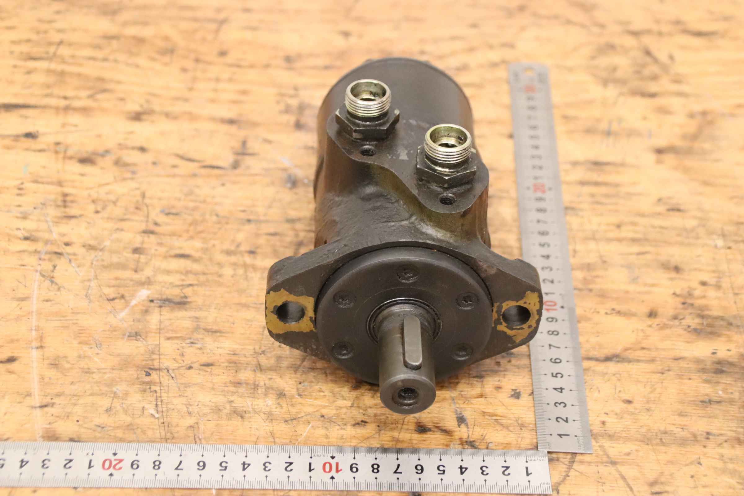 Hydraulic motor, oil motor, hydraulic pump-Manufacturer: Danfoss, hydraulic motor -Type: OMP 50 151-0020 6-Hole spacing: 106 x Ø13 mm-Shaft: Ø25 x 45 mm-Number: 12x aggregate available-Price: per piece-Dimensions: 190/130/H125 mm-Weight: 5.9 kg