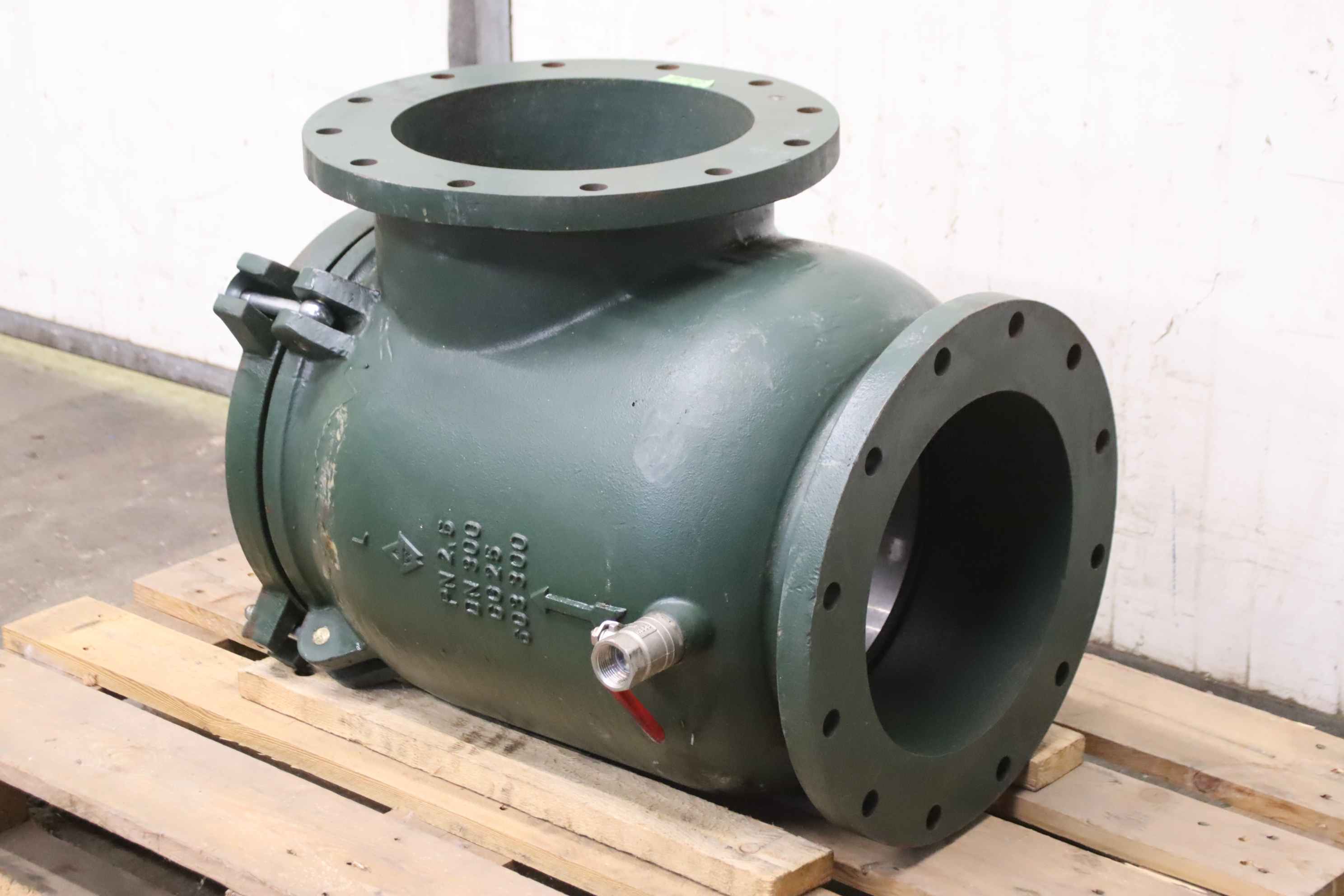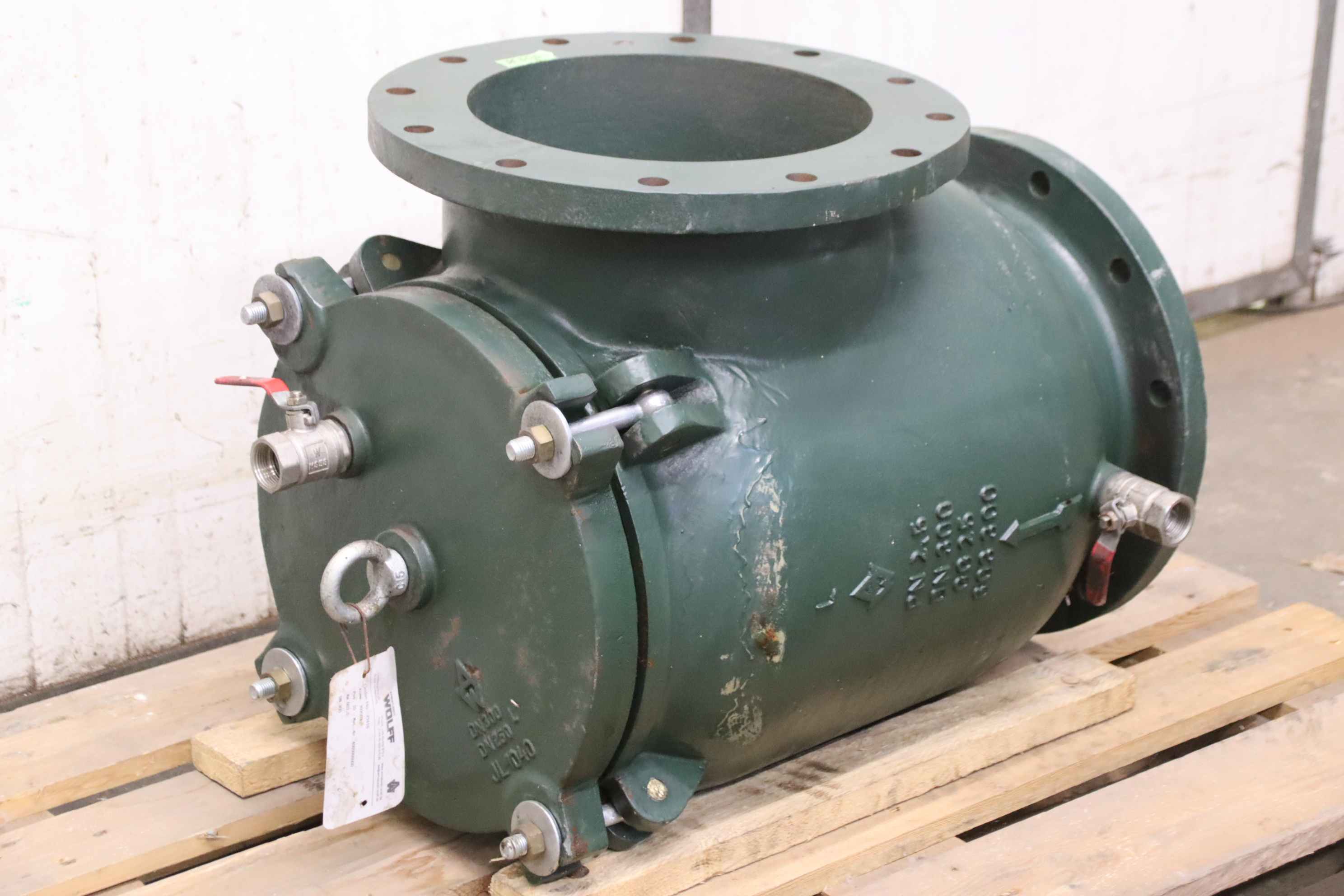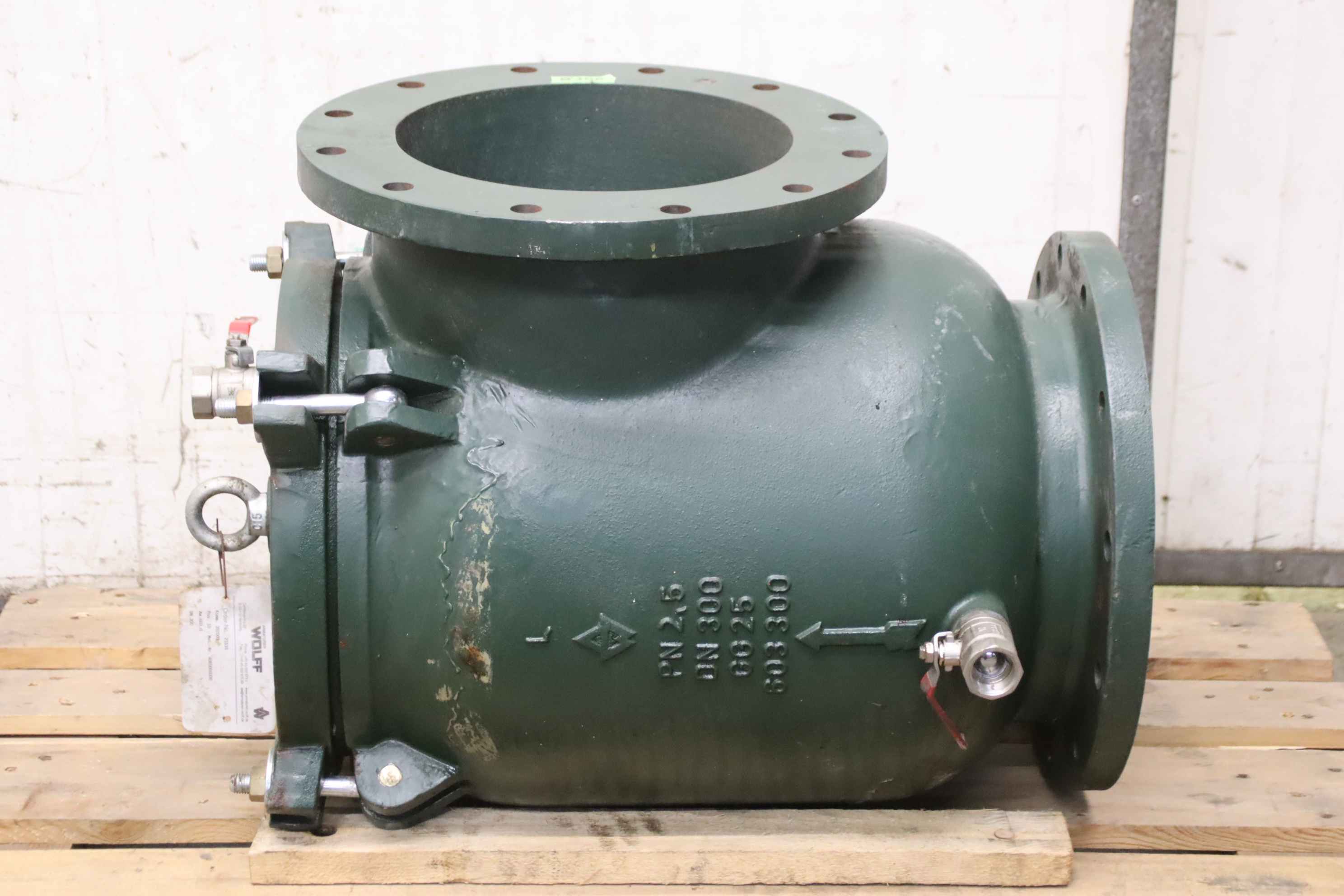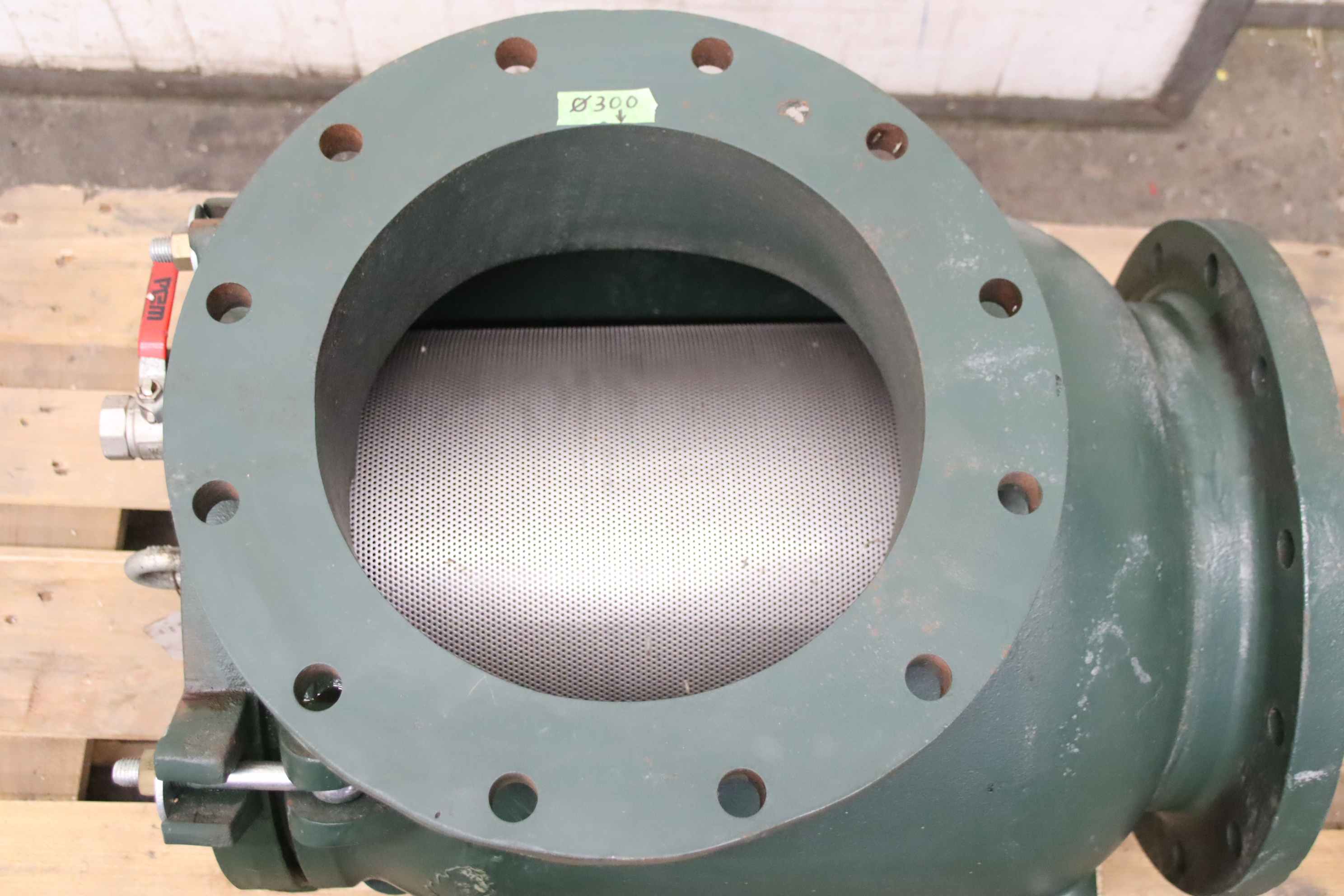 Dirt traps, flanged dirt traps, filters, coarse or fine sieves, coarse filters, water filters -Manufacturer: AW Armaturen Wolff, Coarse filter, corner shape -Type: AW 603.0 PN 2.5 DN 300 GG25 603300 -Sieve plate, mesh size: Ø 2mm, material: stainless steel -Dimensions: 700/50/H533 mm -Weight: 163 kg