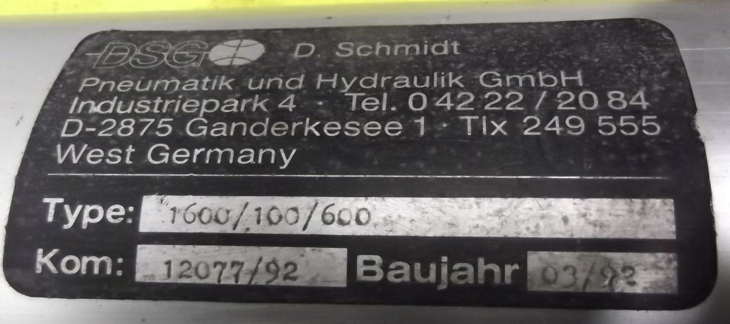 Pneumatic cylinders, air cylinders, standard cylinders, clamping cylinders-DSG type: 1600/100/600-Piston: Ø 100 mm-Piston rod: Ø 32 mm-Stroke: 587 mm-Number: 2x cylinders available-Price: per piece-Dimensions: 115/115/880 mm-Weight: 13.6 kg