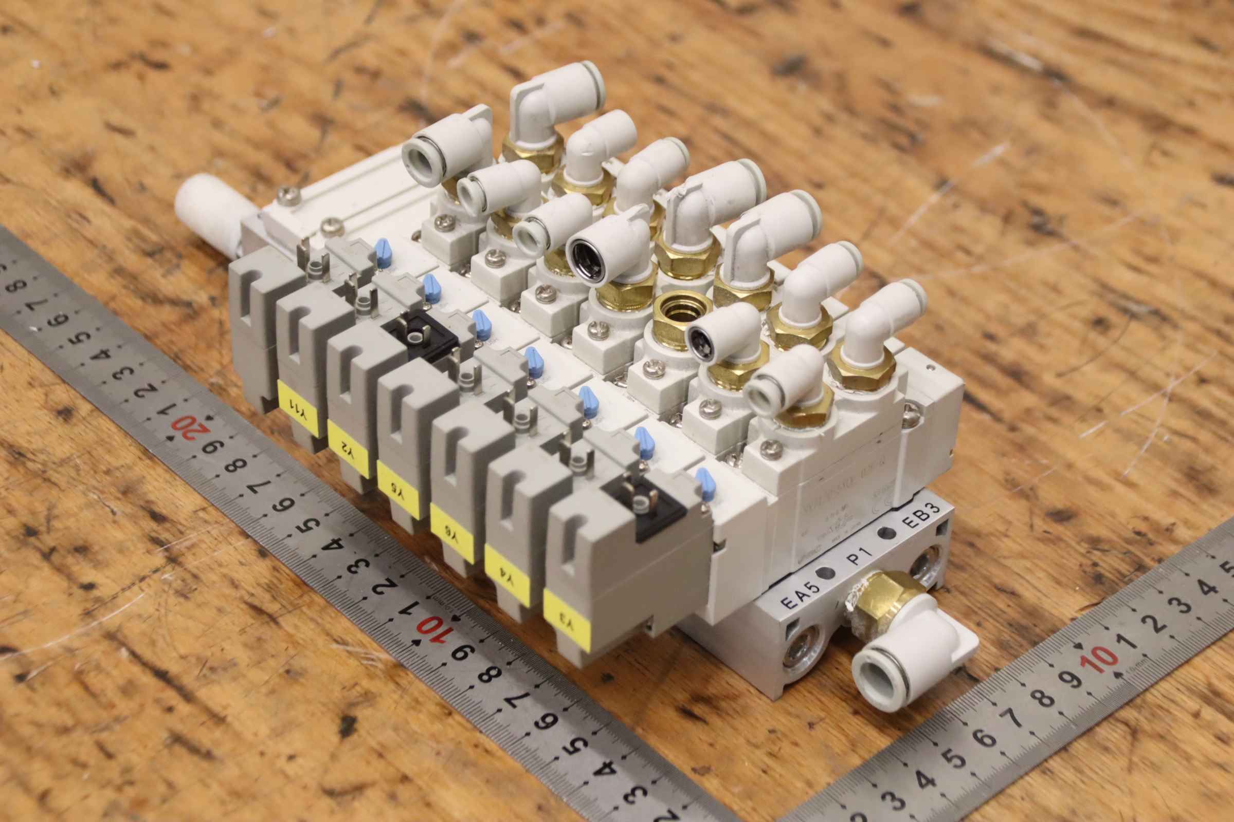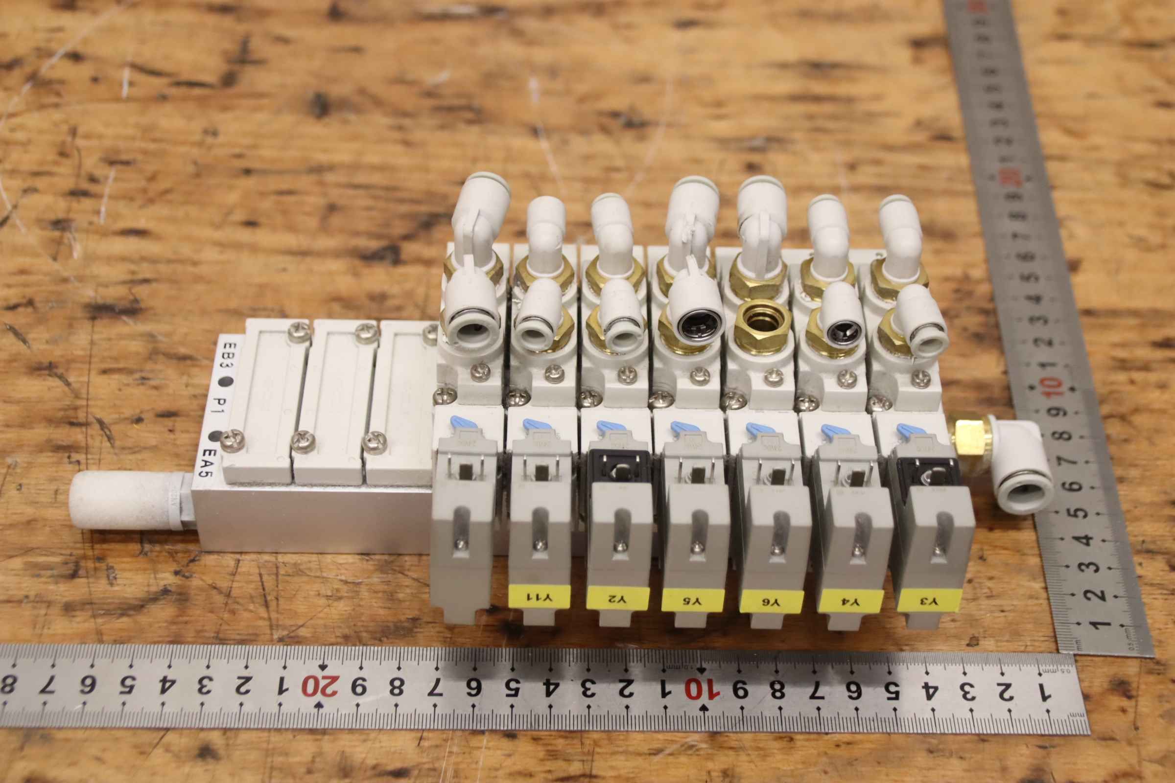 Valve manifolds, multipole connection, directional control valve, solenoid valve, pneumatic valve, air valve, pressure valve -Manufacturer: SMC, Valve manifold SX7000 / SY7000 -Solenoid valves: SY7120-5YOE-02F-Q 7 pieces -Individual components: see photos -Price/Fee: complete -Dimensions: 270/120/H90 mm -Weight: 1.7 kg