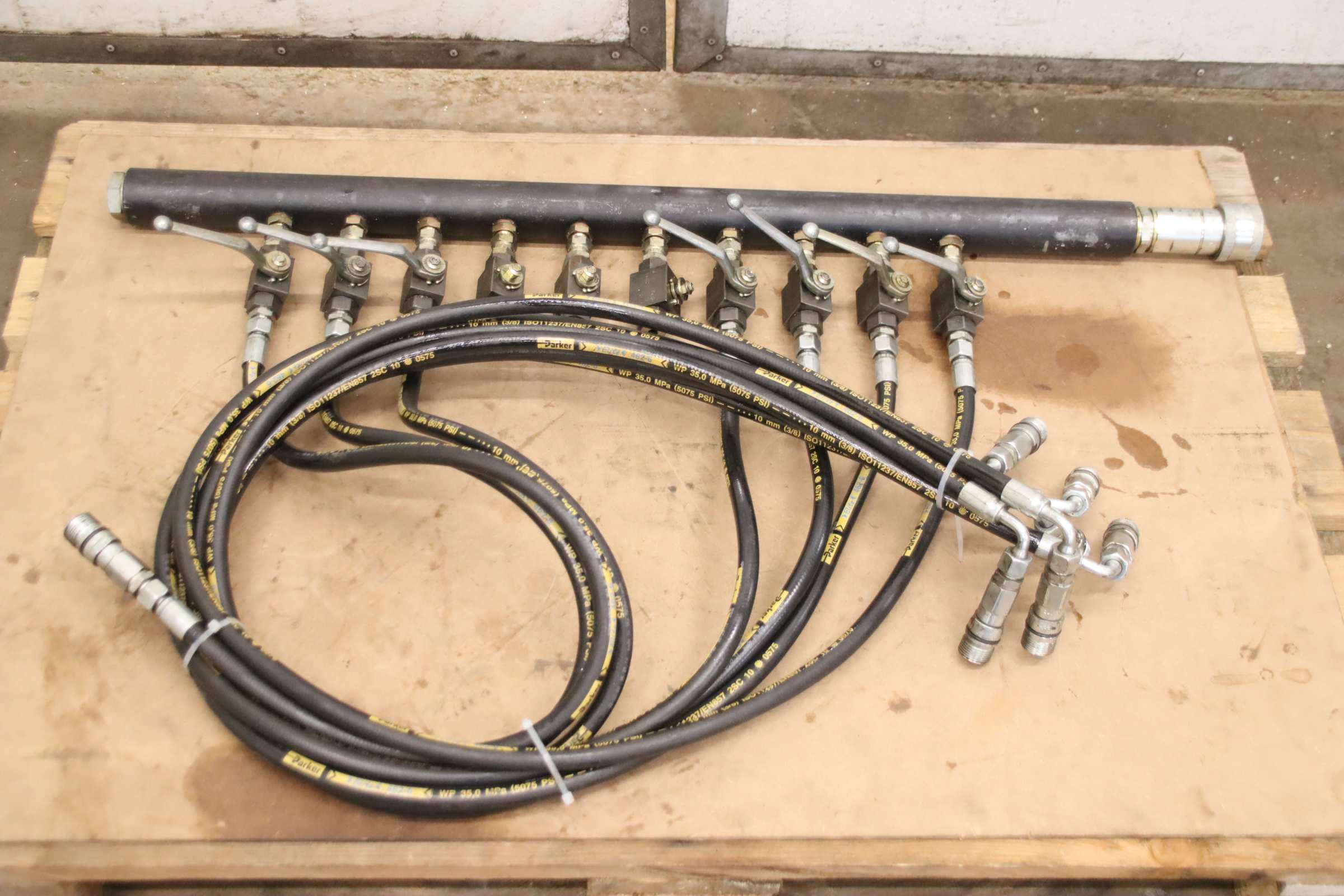 Hydraulic manifold block, hydraulic fitting, hydraulic T-manifold, hydraulic distributor, e metro fitting -Hydraulic distributor: Hydraulic distributor with 10 stations -Type: 3000-2 1/2-76.1 A3L -Configuration: 7x shut-off valve with hose -Pressure: up to 350 bar -Dimensions: 1085/660/H140 mm -Weight: 28 kg