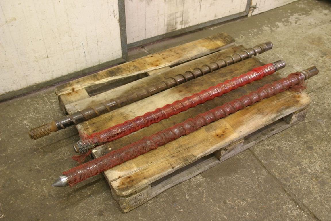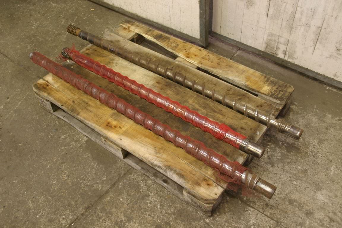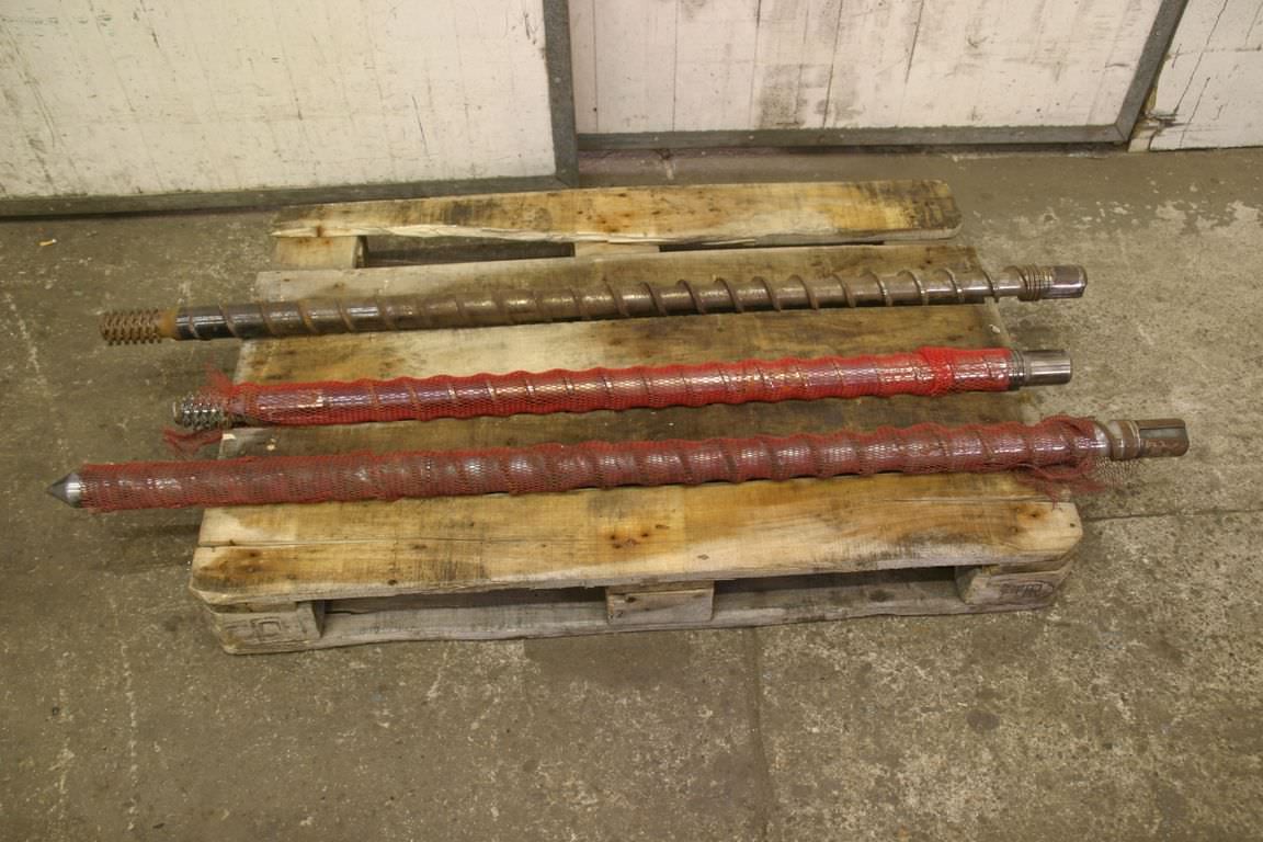 Screw conveyor, screw conveyor, screw conveyor, conveyor technology, trough screw conveyor-Number: 3x replacement screws for injection molding machines-Price: complete-Execution: stable-Screw lengths: 1600/1560/1320 mm-Screw diameter: 60 mm-Screw pitch: mm-Pipe diameter: mm-Holder: Ø 55 x 75 mm-Transport dimensions: 1600/120/H100 mm-Weight: 90 kg