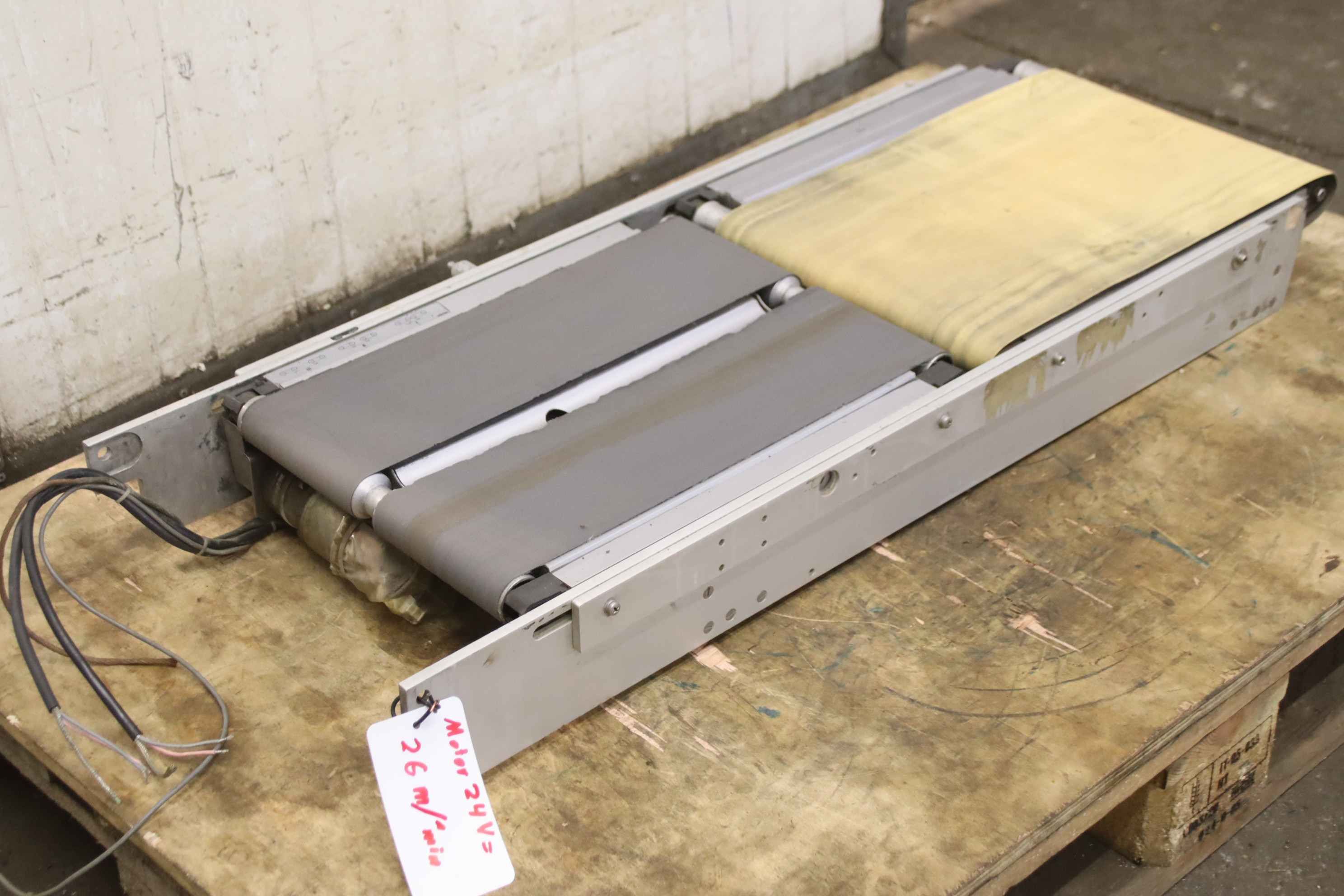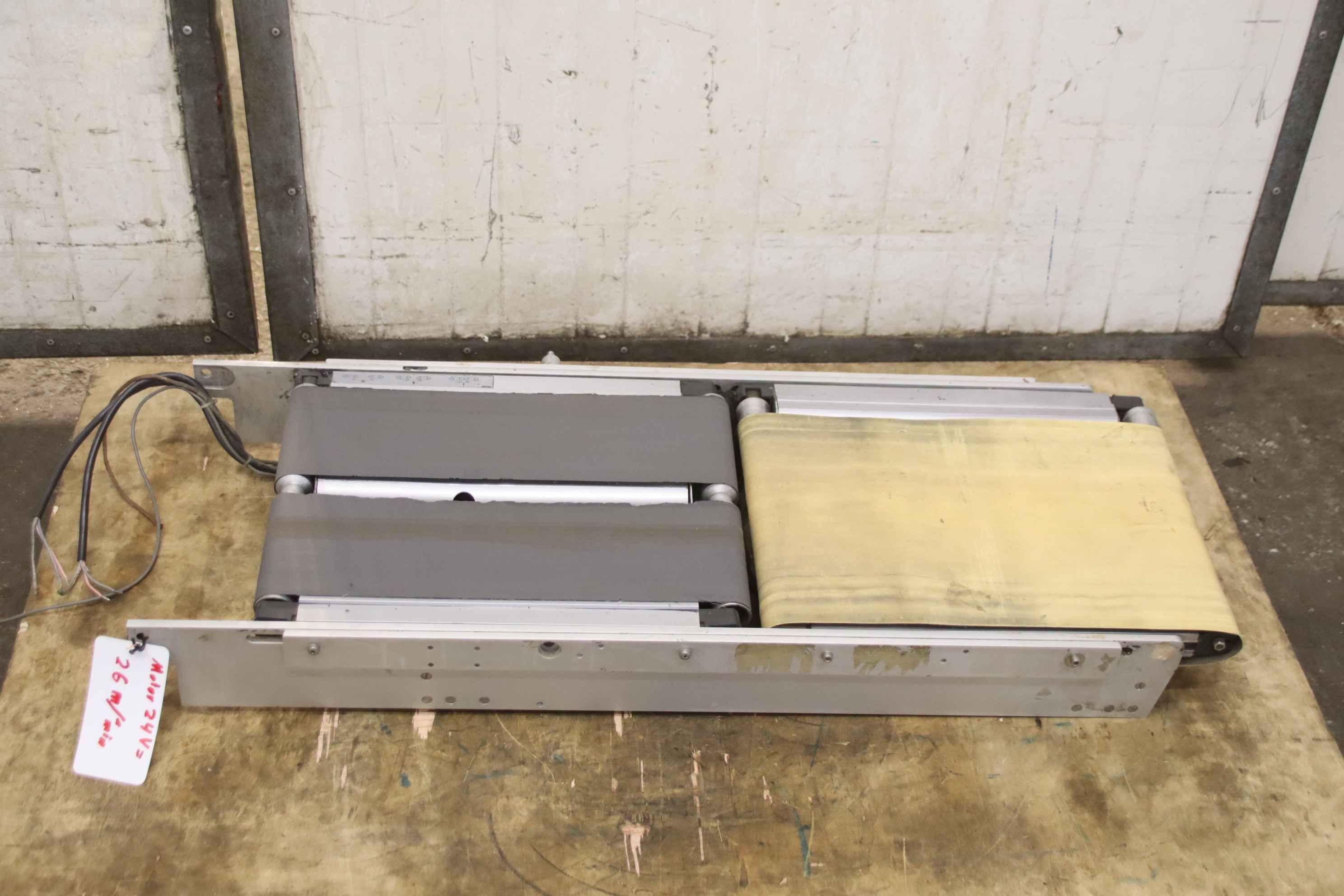 Conveyor belt, belt conveyor belt, conveyor belt, belt conveyor, conveyor belt for counting scale, scale, parcel scale, checkweigher, checkweigher conveyor belt -Manufacturer: Sartorius, conveyor belt for checkweighers -Speed: 26 m/min -Conveyor belt width: 295 mm / 2x 135 mm -Conveyor belt length: 430mm/440mm -Intermediate size: adjustable, see photos -Drive: Voltage 24 V -Dimensions: 980/390/H105 mm -Town weight: 18 kg
