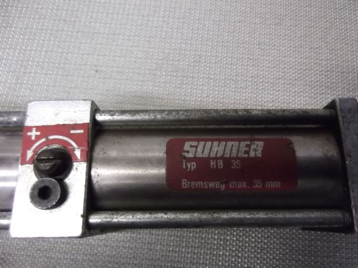 Pneumatic cylinders, air cylinders, pneumatic rams, air rams-Brake cylinder Suhner: HB 35-Braking distance: max. 35 mm-Shaft diameter: 10 mm-Dimensions: 194/32/H32 mm-Weight: 0.45 kg