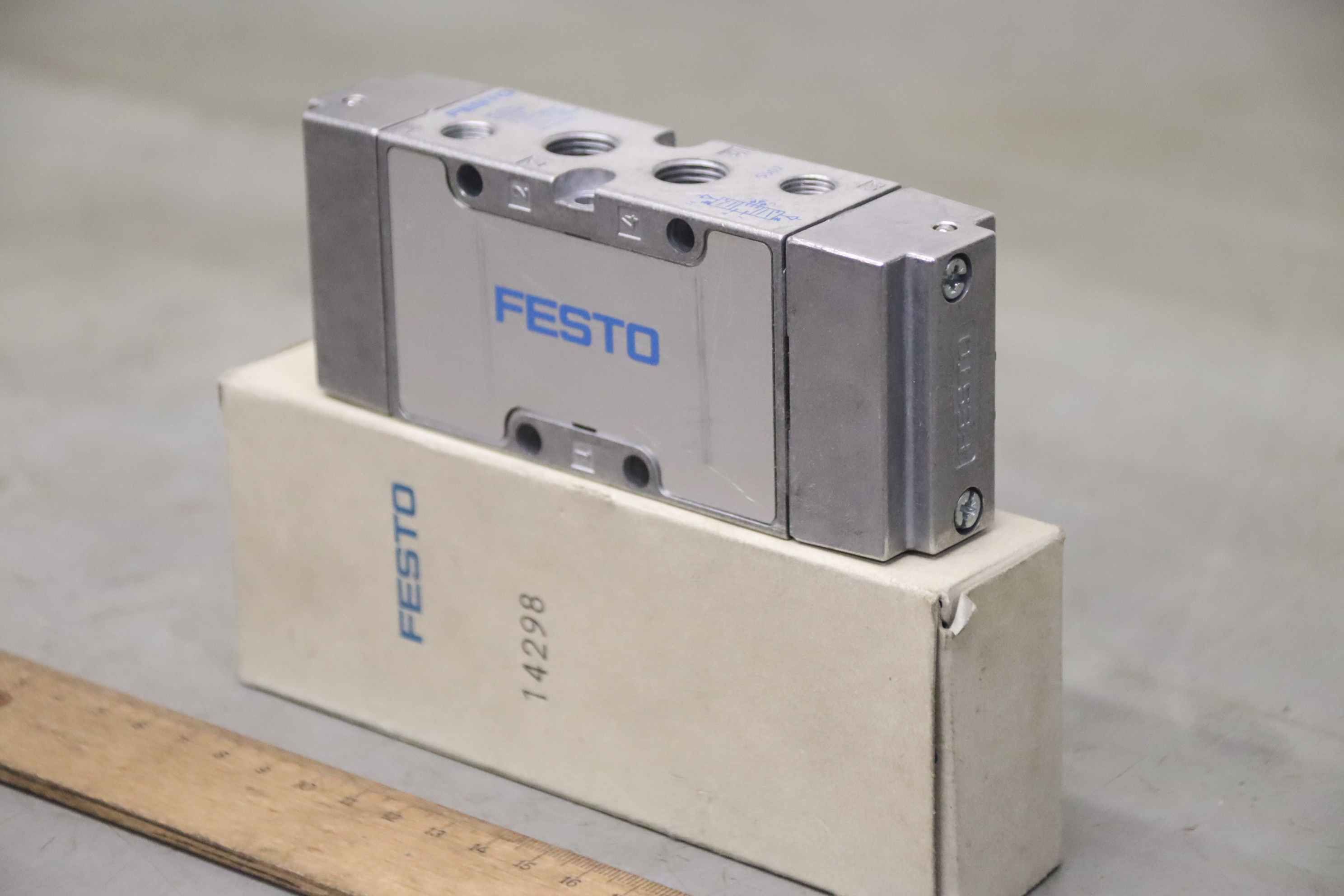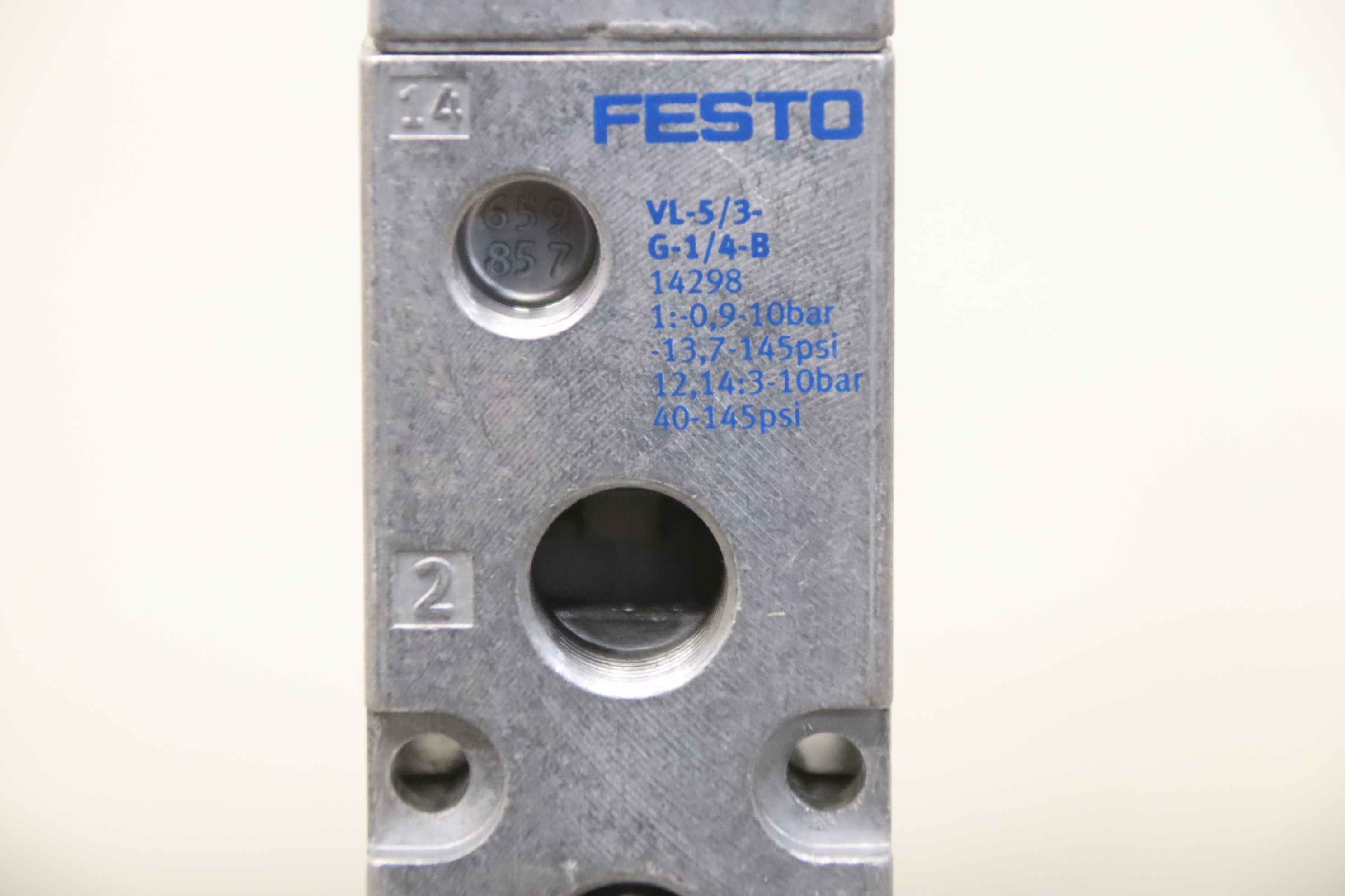 Solenoid valve, pneumatic valve, air valve, pressure valve, valve block, control block, on-off valve, pressure build-up valve-Manufacturer: Festo, pneumatic valve orig-Type: VL-5/3-G-1/4-B Mat. no. 14298-Working pressure: 0.9 - 10 bar-Number: 2x valve available-Price per piece-Dimensions cardboard: 135/30/H50 mm-Weight: 0.4 kg/pc.