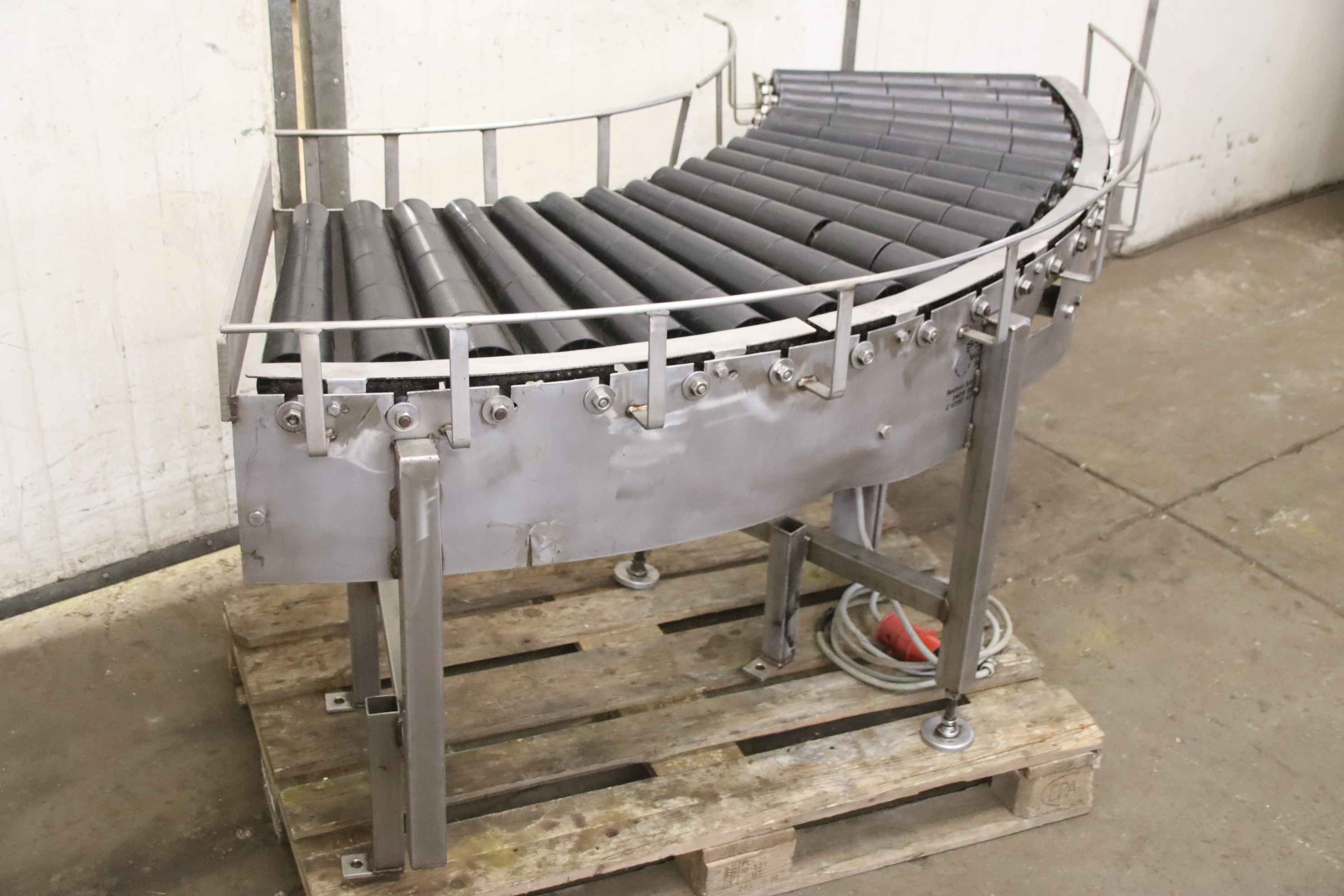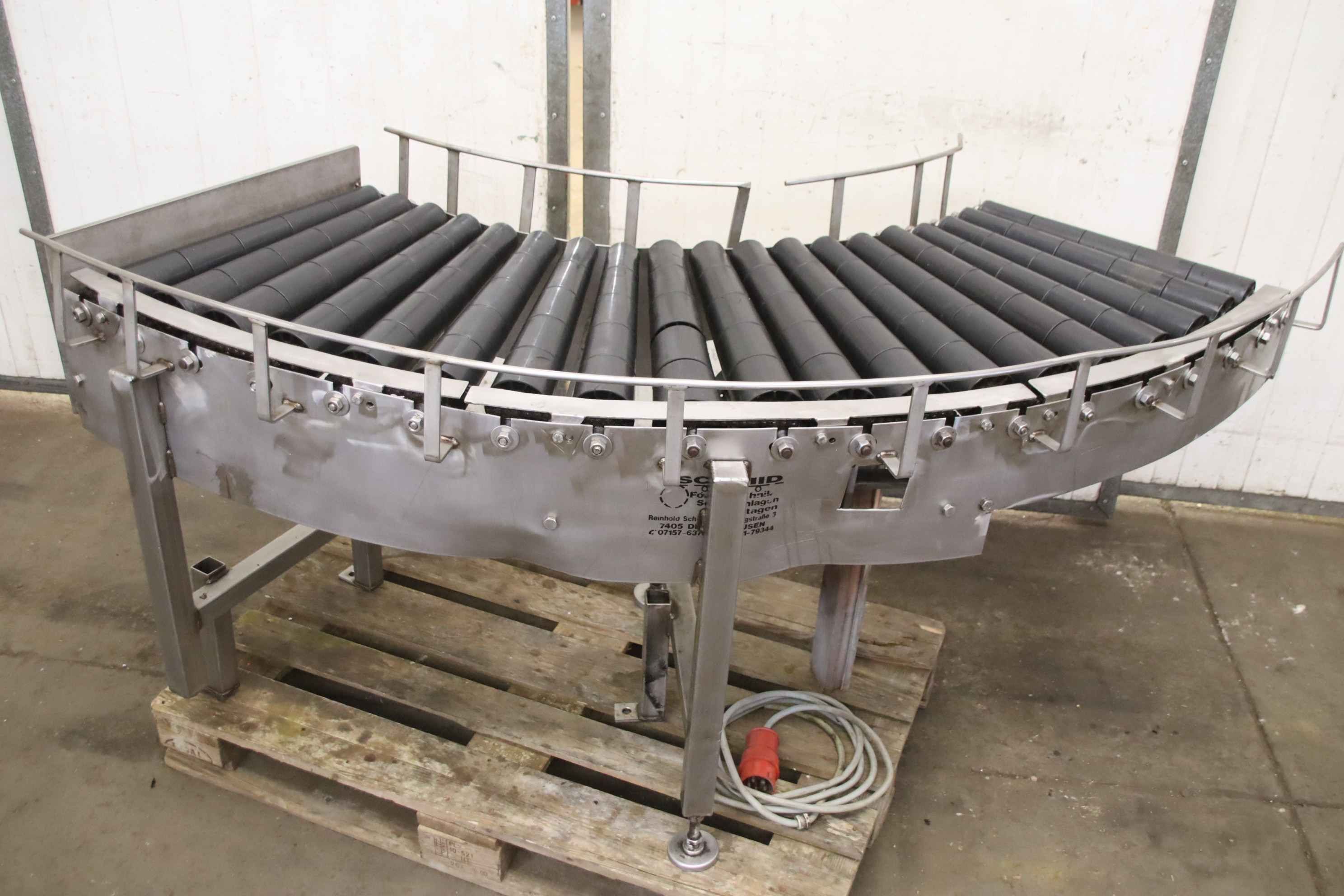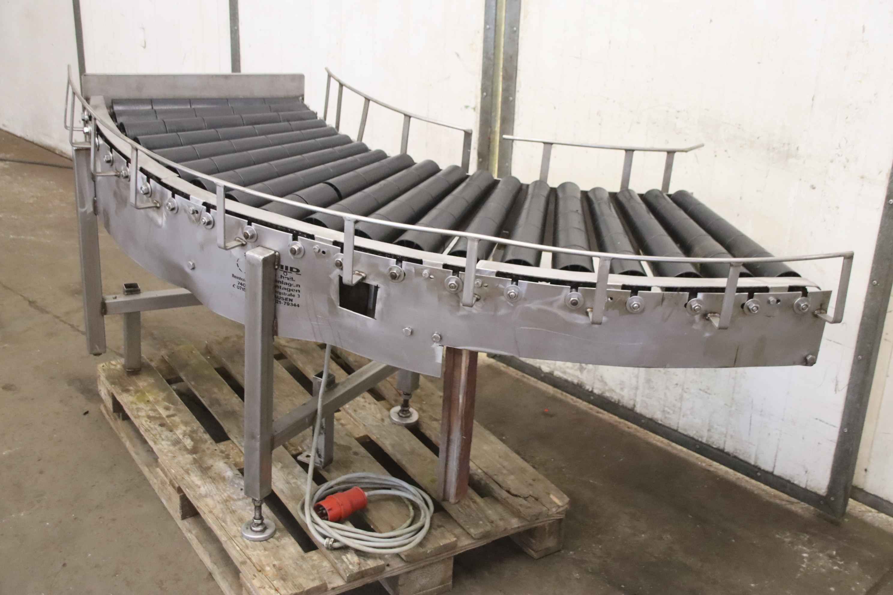 Curved roller conveyor, curved track, curved roller conveyor, curved roller conveyor, curved roller conveyor, roller curve, curved conveyor with drive, roller conveyor, roller curve conveyor-Manufacturer: Schmid Fördertechnik, roller curve conveyor 90° with drive-Case: stainless steel-Rolls: Ø 55-85 x 500 mm-Speed: 15 m/min-Drive: SEW-Eurodrive, see photo nameplate-Conveyor width: approx. 500 mm-Transport dimensions: 2000/1200/H830 mm-Weight: 141 kg with pallet