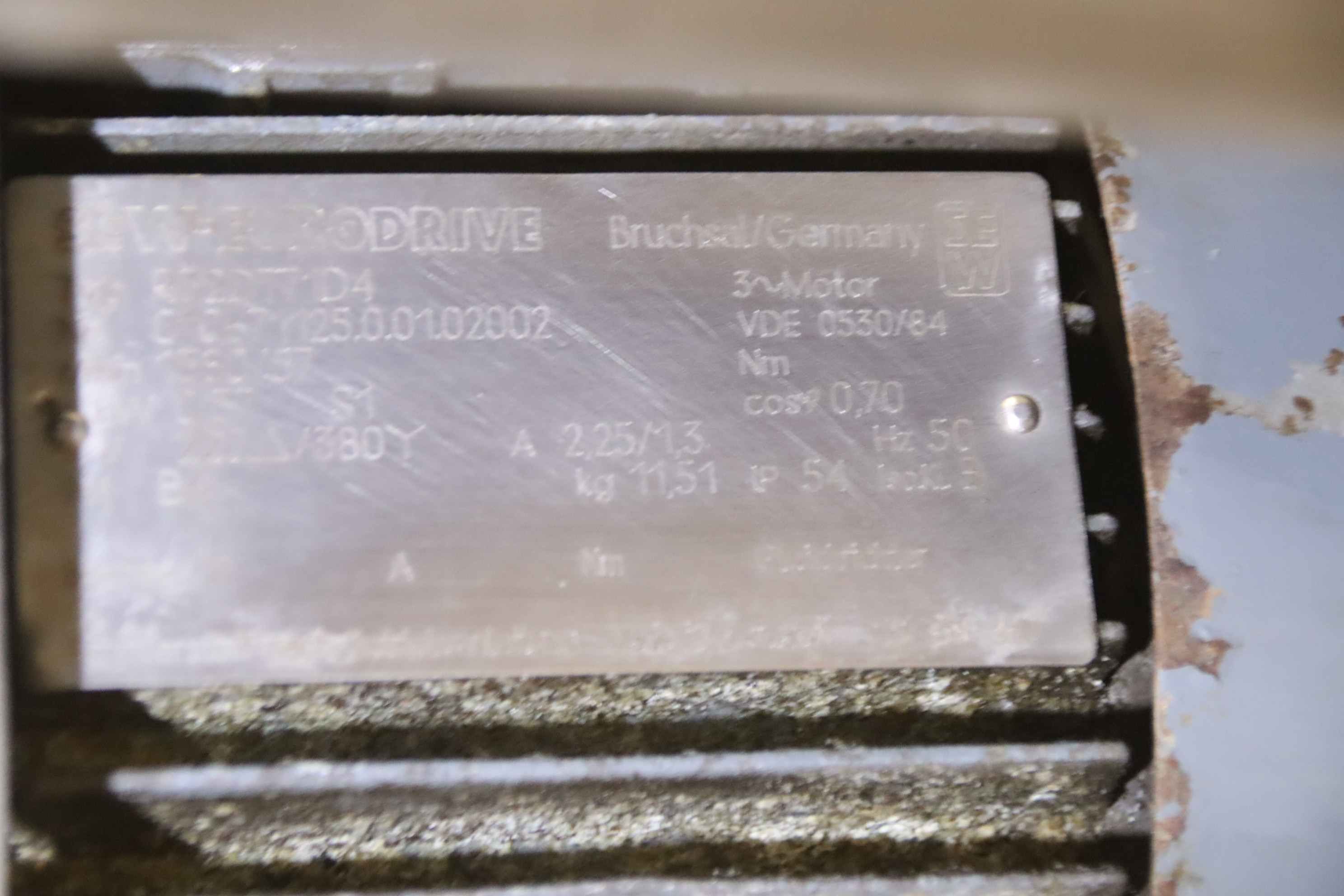Roller conveyor, conveyor belt, roller conveyor, packaging system, turning table, turning roller conveyor, roller conveyor -with folding device for laying or setting up goods -Folding drive: pneumatic -Roll width: 800 mm -Conveyor length: 3150 mm -Roll diameter: 60 mm -Axle distance: 100 mm -Height: mm -driven: via belt -Gear motor: 0.37 kW 60 rpm -Speed: 6 m/min -Dimensions: 3150/1300/H540 mm -Weight: 386 kg