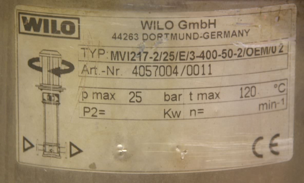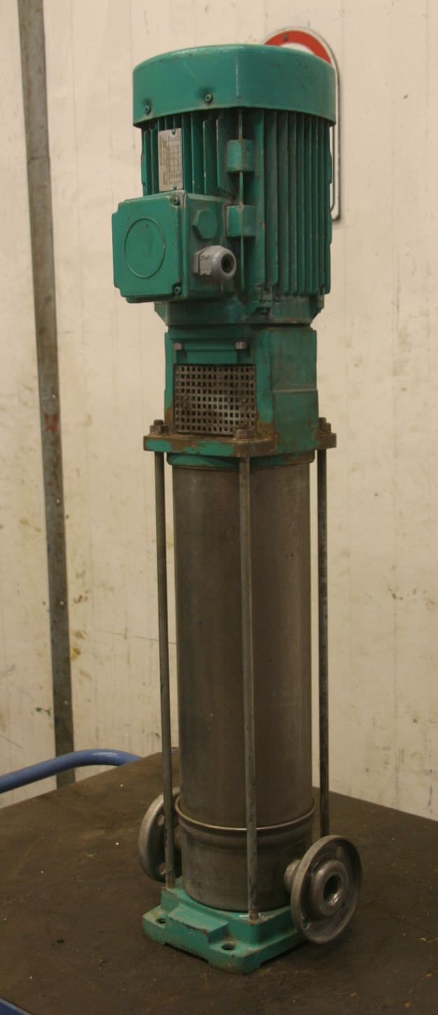 centrifugal pump, water pump, multi-stage vertical centrifugal pump -Max. flow rate: 5.0 m³/h -Pressure: max. 25 bar -Motor power: 3 kW -Speed: 2840 rpm -Housing and impeller made of: stainless steel -Weight: 45 kg