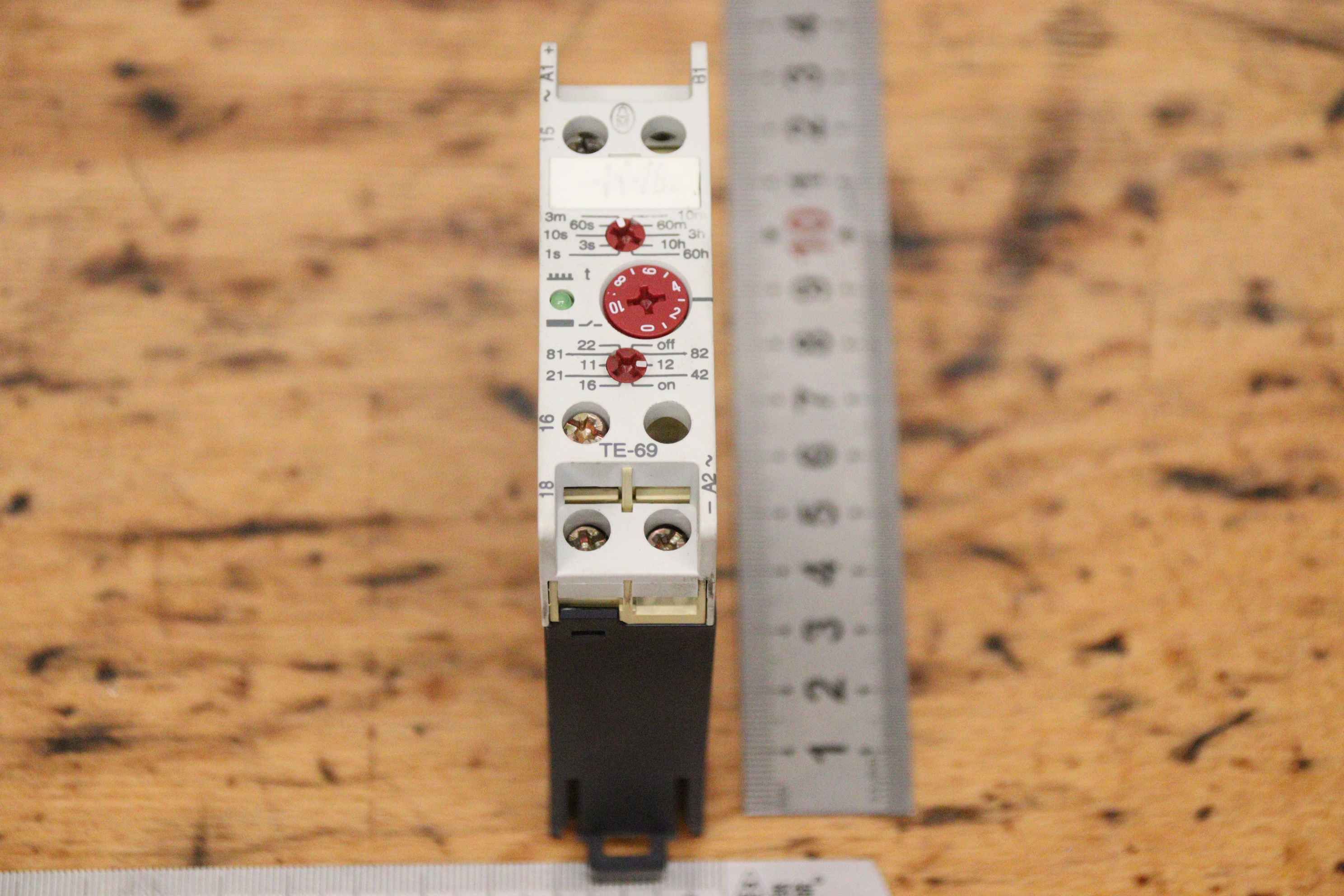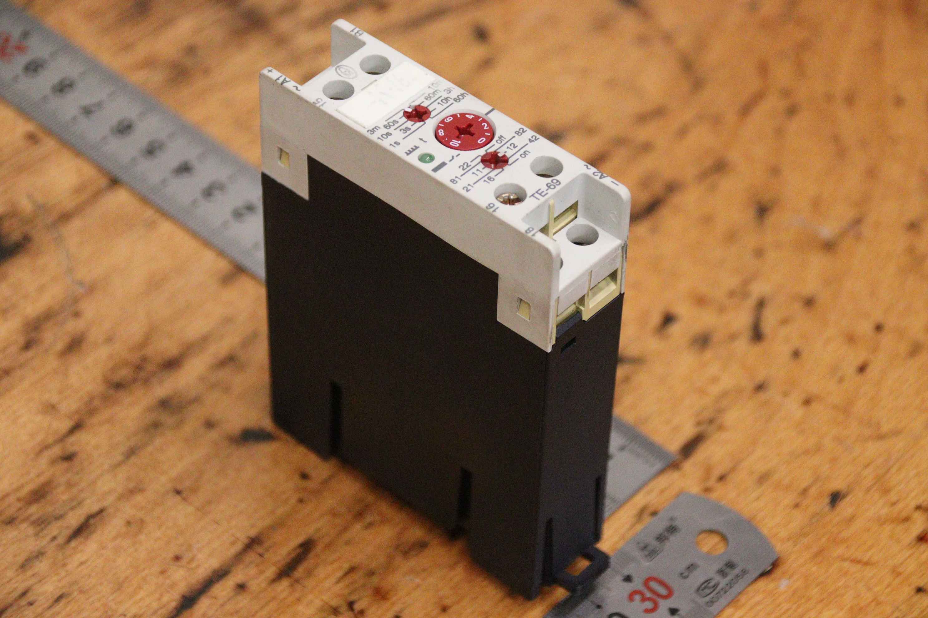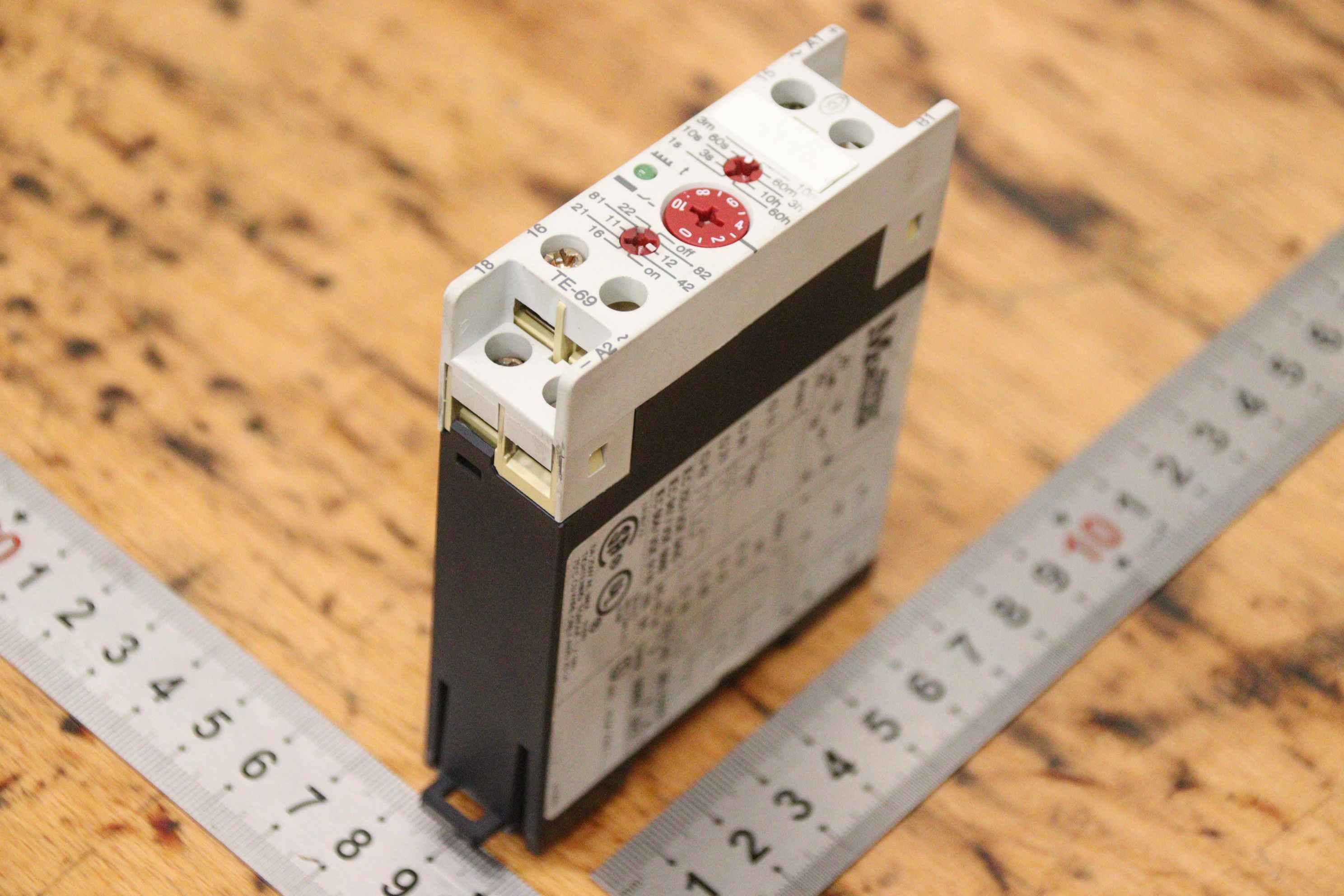 Safety relay, safety control, emergency stop switch, switching device, undervoltage relay, safety switching device, time relay, multifunction relay-Manufacturer: Klöckner Moeller, time relay multifunction relay-Type: TE 69-A-Number: 1x relay available-Dimensions: 80/25/H100 mm-Weight: 0.1 kg