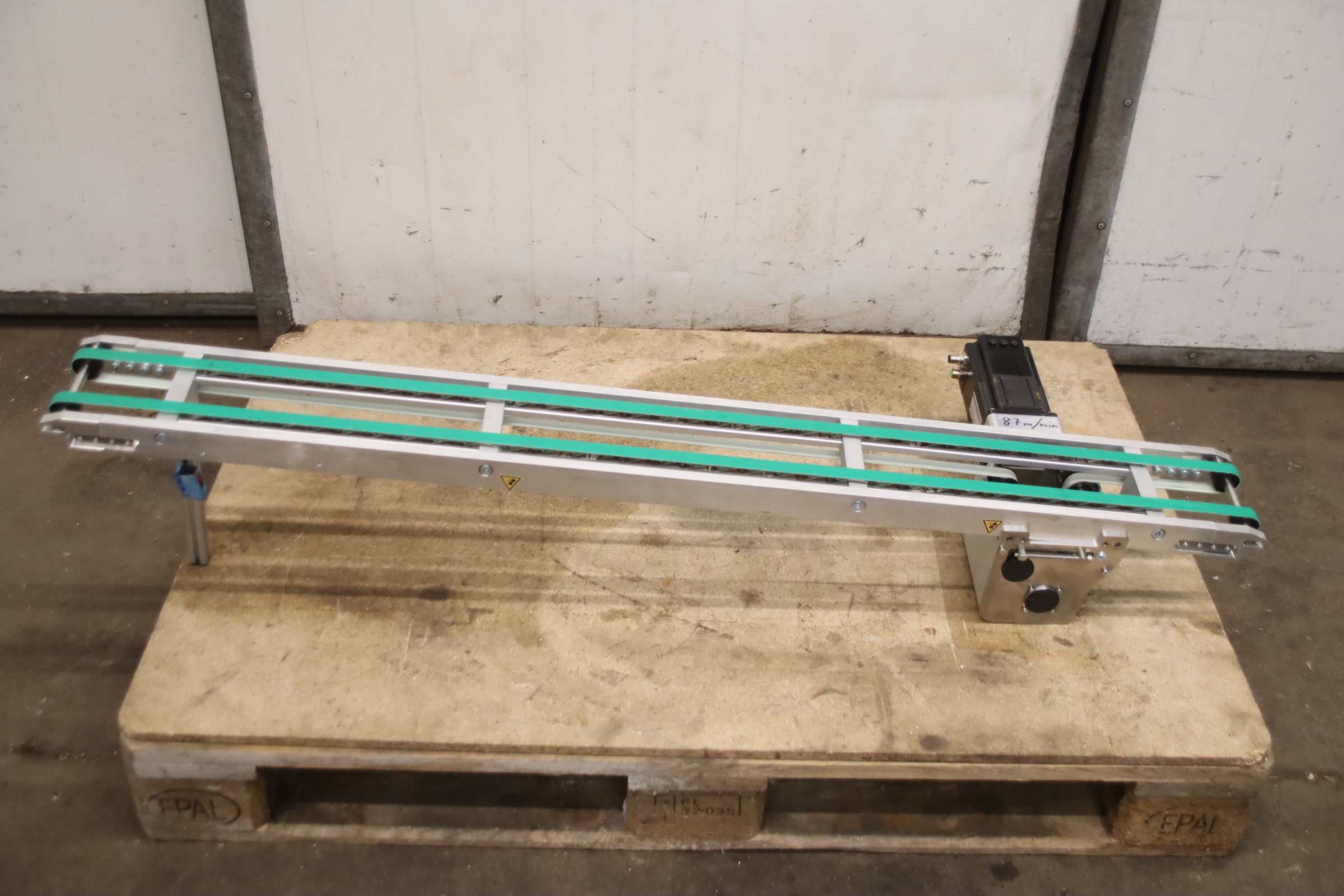 conveyor belt, belt conveyor, transport belt, belt conveyor, belt conveyor, flat belt conveyor -Manufacturer: Interroll, belt conveyor -Speed: frequency controlled, now set speed 3600 mm/min -Belt width: 455 mm -Conveyor length: 5685 mm -Drive: SEW-Eurodrive 0.55/0.055 kW, see photo nameplate -Number: 2x conveyor belt available -Price: per piece -Transport dimensions: 5720/830/H365 mm -Weight: 189 kg/pc.