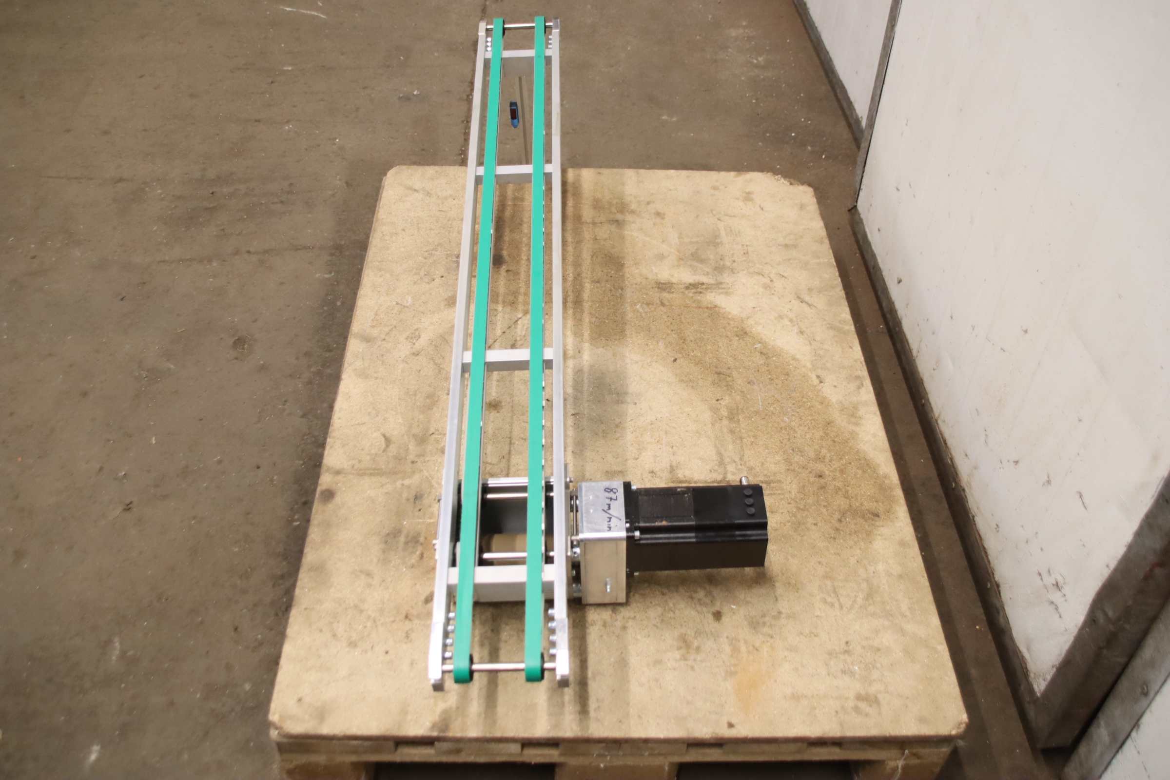 Conveyor belt, belt conveyor, transport belt, belt conveyor, belt conveyor, flat belt conveyor -Manufacturer: Montech, Belt conveyor type TB30 double belt with light switch -Speed: 87 m/min -Drive: Nucleus NUDrive MP85 10A Bgr2 R Rev2 IP64 -Strap width: 2x 15 mm -Conveyor length: 1290 mm -Light switch: Sick WTB9-3P2261, not connected -Transport dimensions: 1290/390/H260 mm -Weight: 14.5 kg