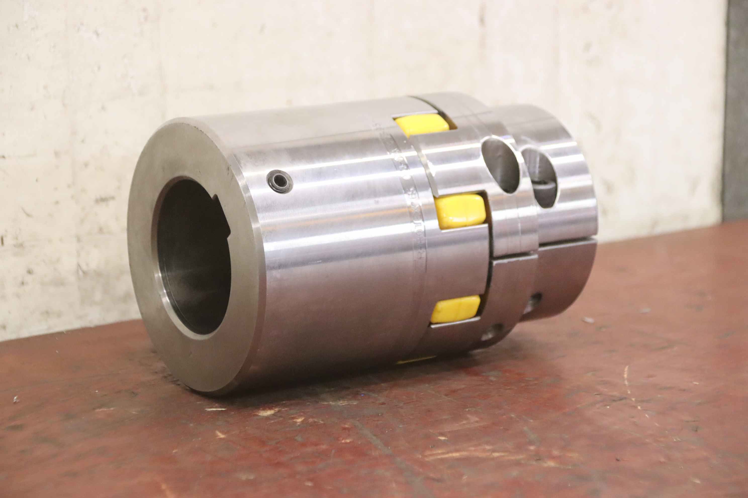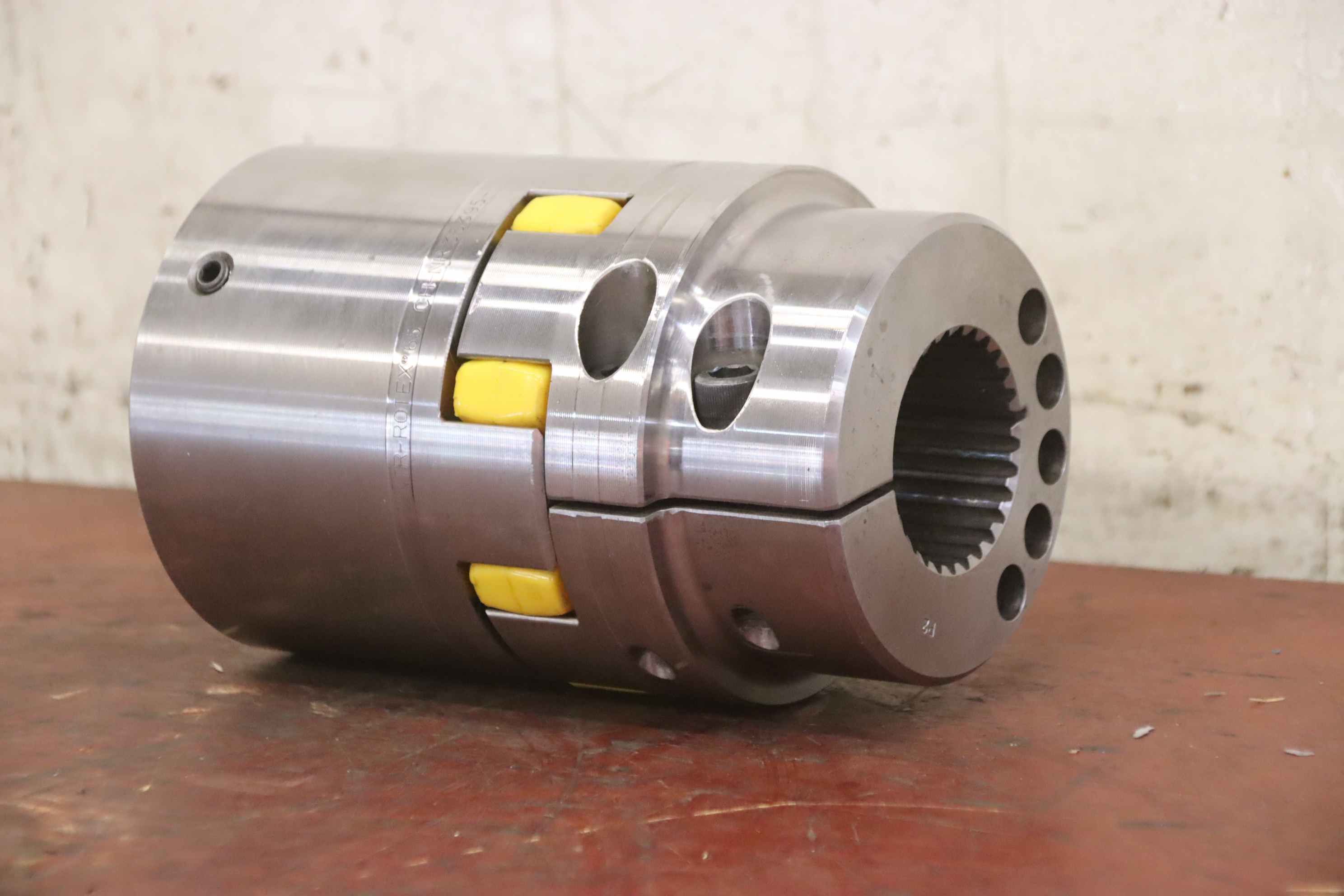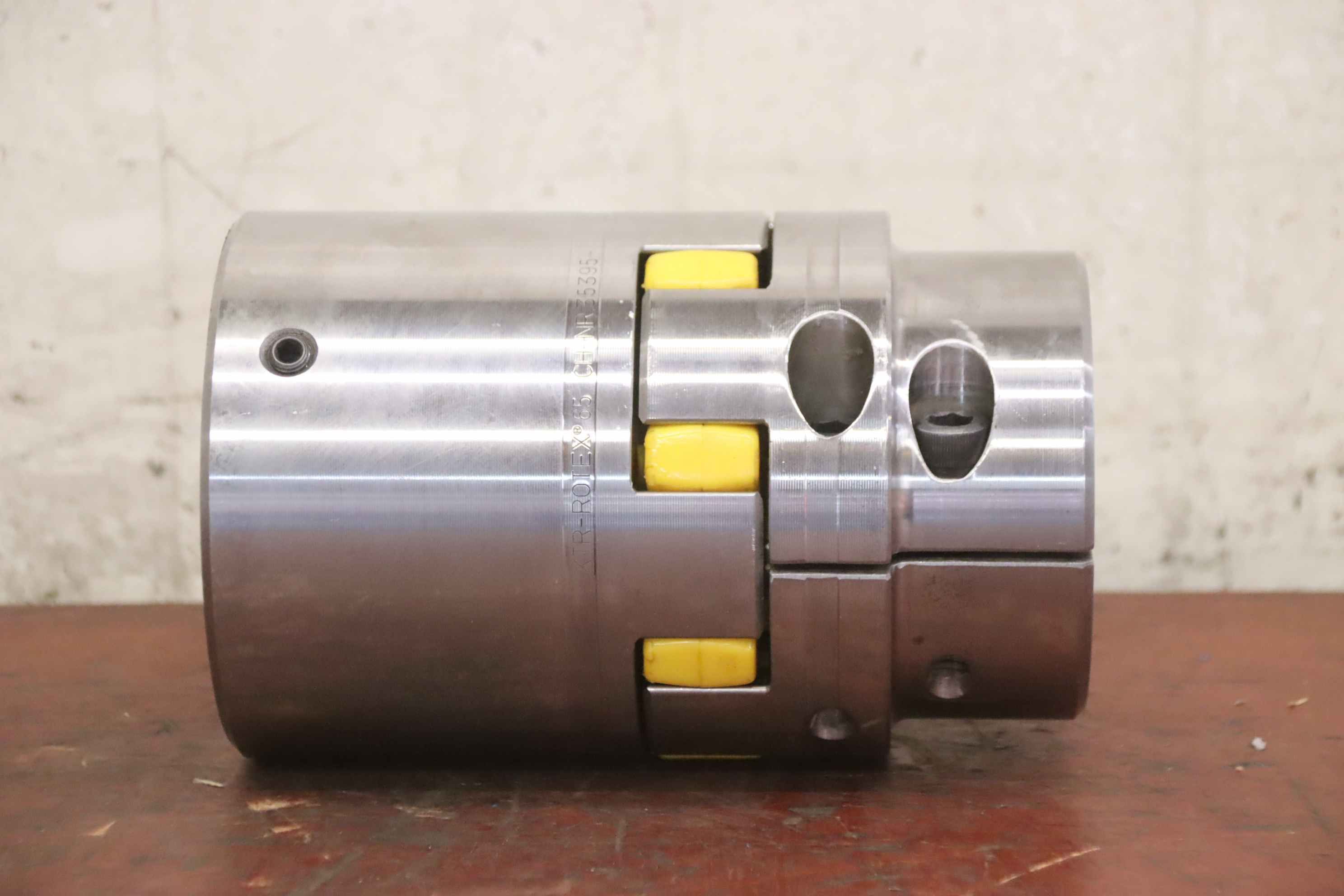 Metal bellows coupling, claw coupling, connecting coupling, torsionally flexible coupling, shaft coupling, bellows coupling-Manufacturer: KTR-Rotex, elastic claw coupling-Type: 65 CH-NR.145147 N-Bore hub: Ø 75 mm / Ø 60 mm see photo technical drawing-Number: 2x coupling available-Price per piece-Dimensions: Ø 135 x 210 mm-Weight: 13.9 kg