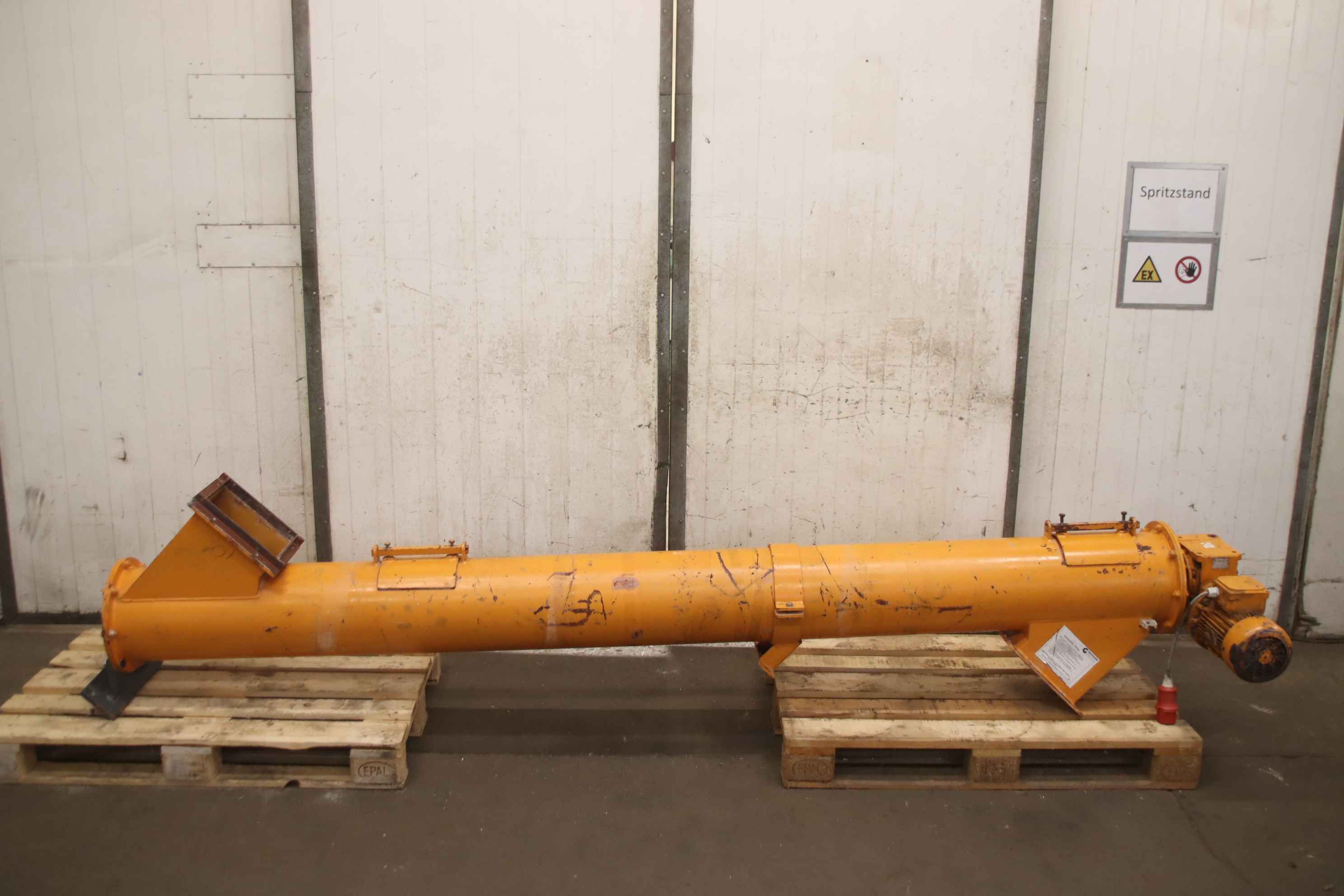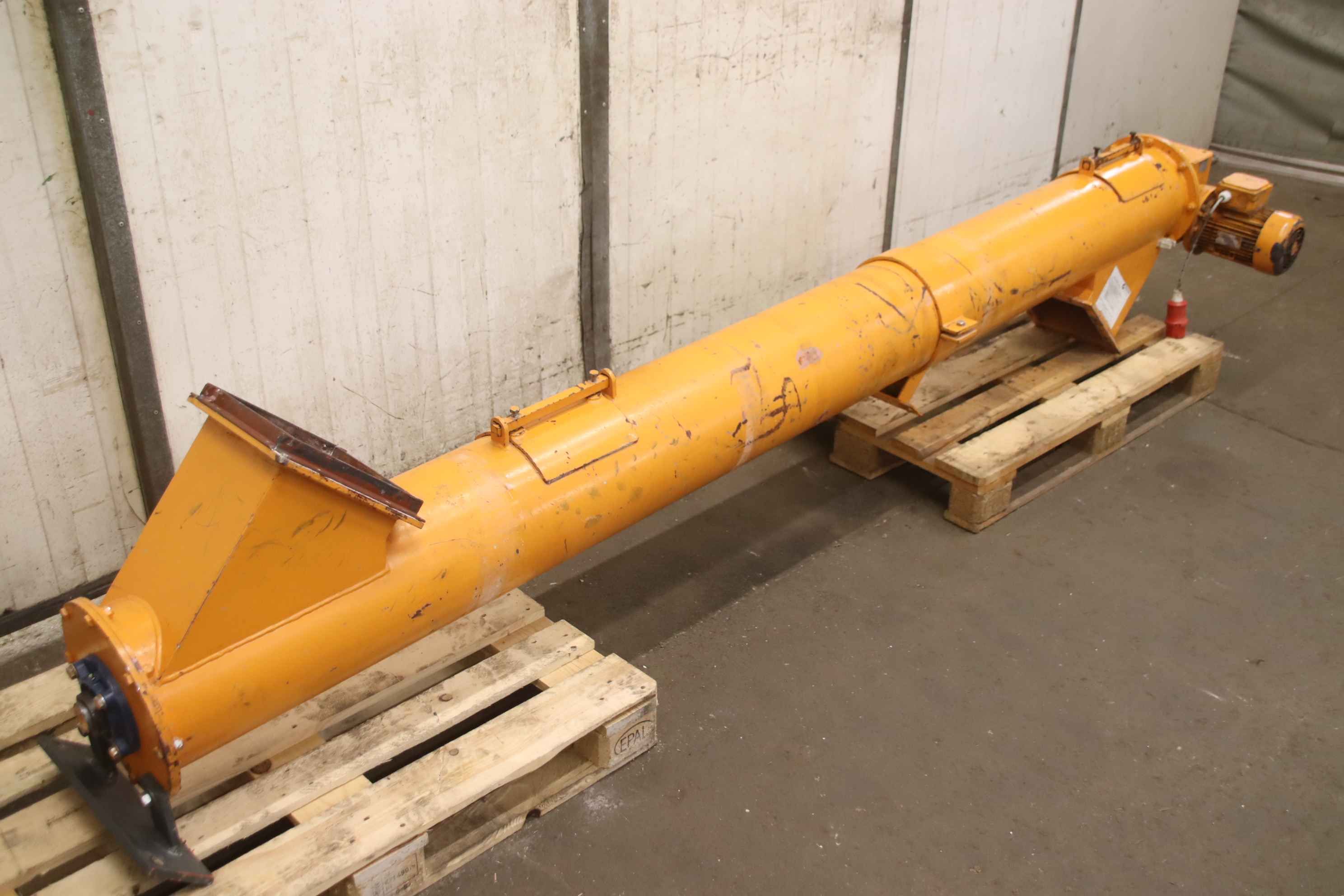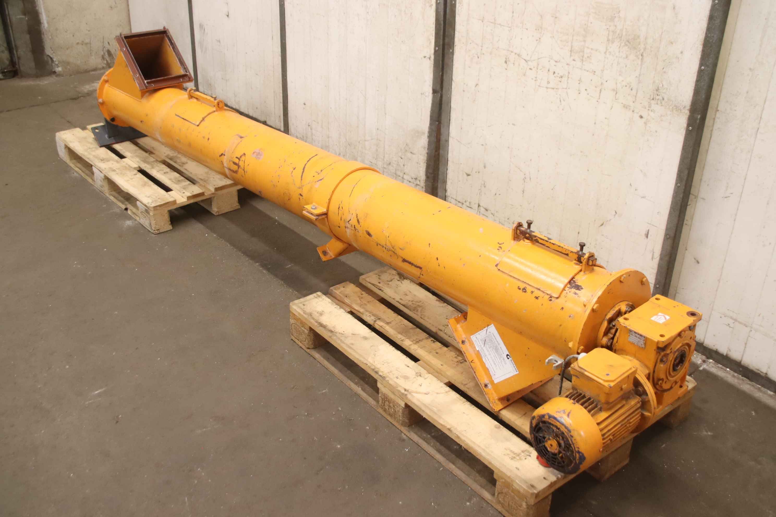 Screw conveyor, transport screw, screw conveyor, conveying technology, pipe screw conveyor, trough screw conveyor, trough screw conveyor -Auger conveyor: Conveying length: approx. 2500 mm -Design: stable -Drive motor: EM Marelli 1.5 kW -Transmission: Rossi -Speed: 35 rpm -Auger: Ø approx. 240 mm -Auger pitch: 230 mm -Inlet/Outlet: 255 x 225 mm -Dimensions: see technical drawing in the photos -Transport dimensions: 3380/600/H670 mm -Weight: 310 kg