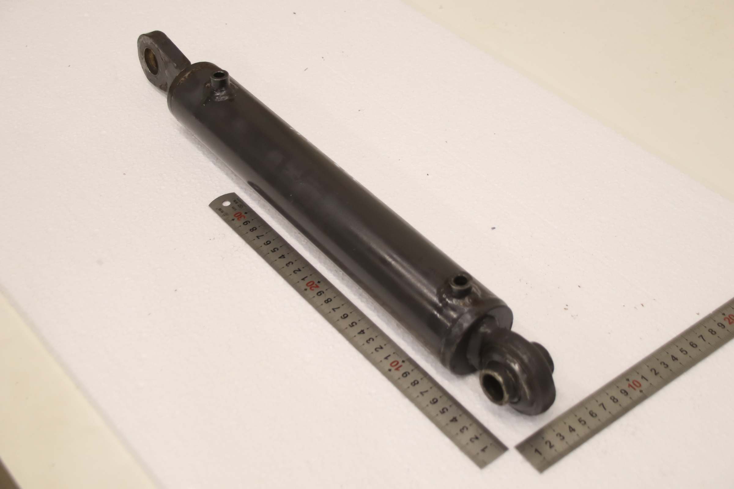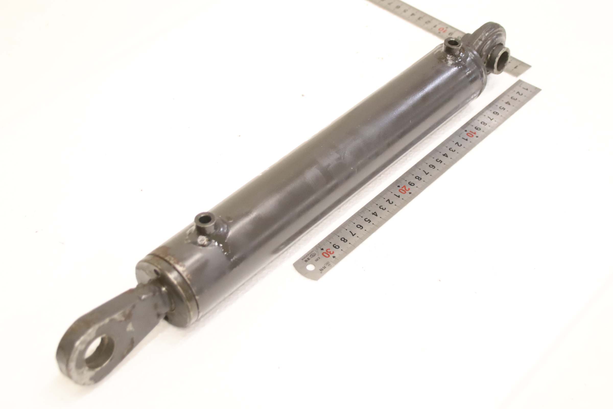 Hydraulic cylinder, support cylinder, hydraulic piston, pressure piston -Hydraulic cylinder: double-acting, stroke 250 mm -Piston rod: Ø 25 mm -Hole: Ø 25/19 mm -Pitch spacing: retracted 465 mm -Number: 2 cylinders available -Price: per piece -Dimensions: 530/60/H73 mm -Weight: 5.9 kg/pc.