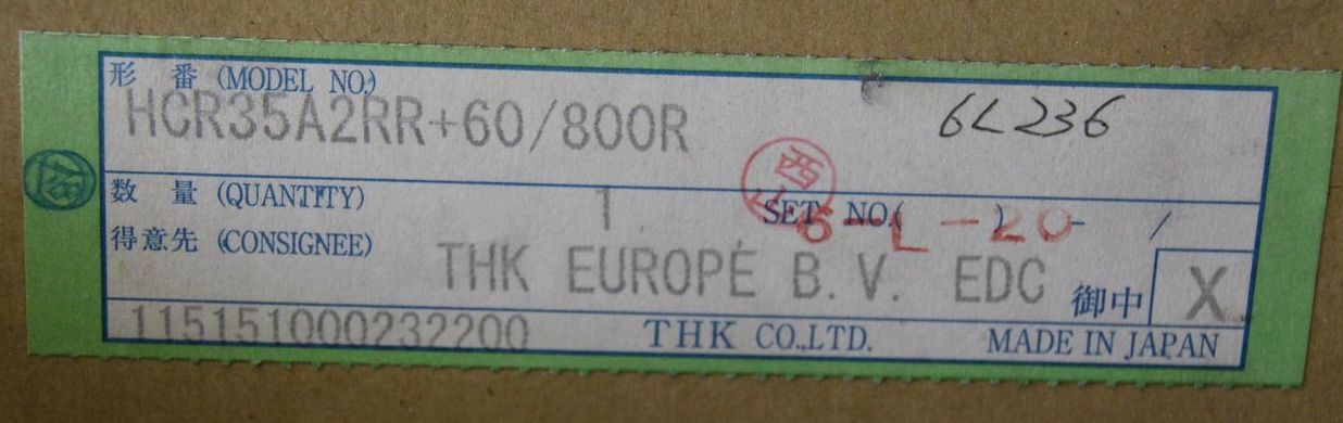 Linear bearings, linear rails, linear guides, roller guide rails, for guide carriages, guide rails, curved guides, cam bearings, cam track bearings, profile rails -Condition: original packaging -Manufacturer: THK, arch guide with guide carriage -Type: HCR35A2RR 60/800R -Length: 800 mm Quantity: 2 pieces Price: per piece -Package dimensions: 990/230/H110 mm -Weight: 10 kg/pc.