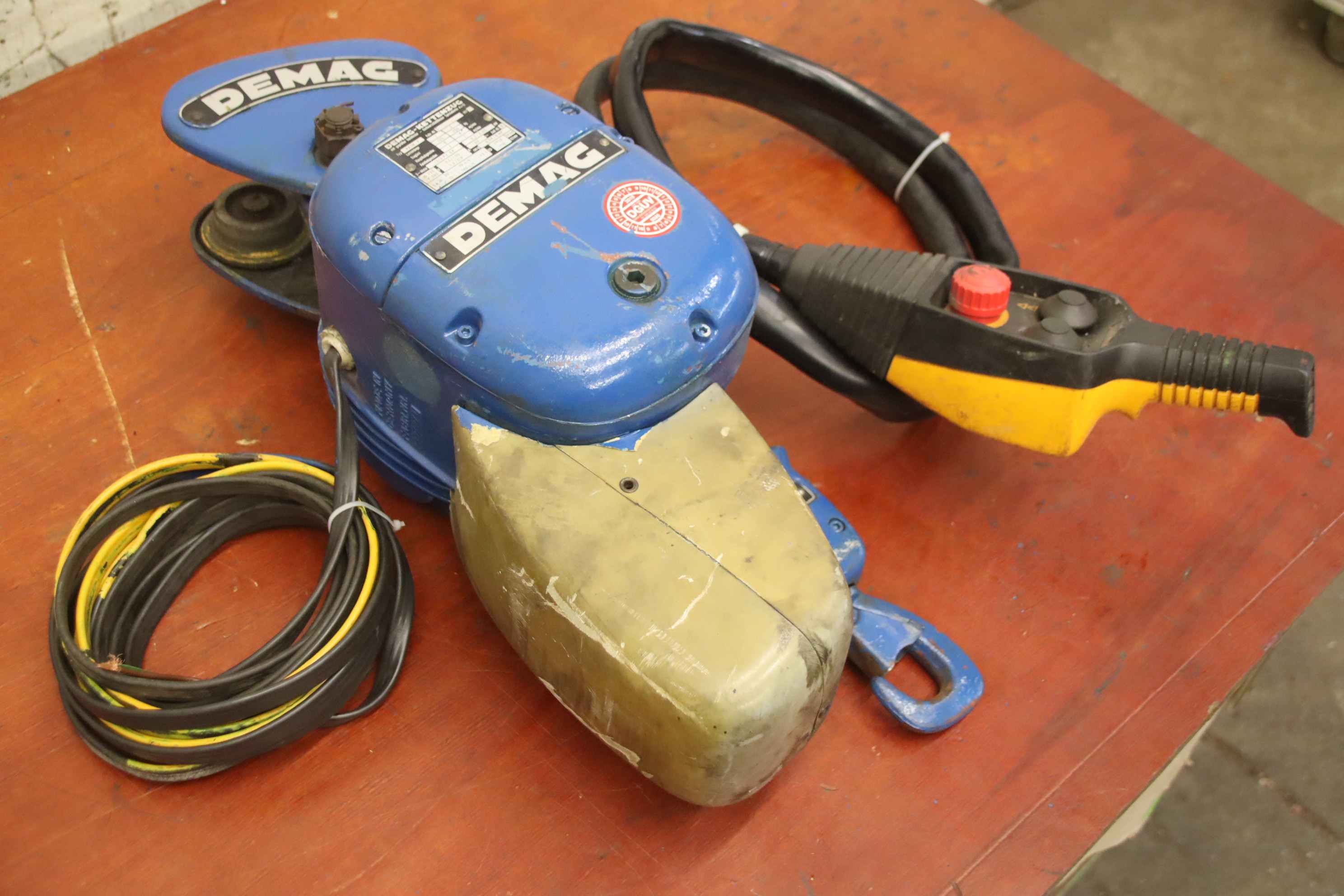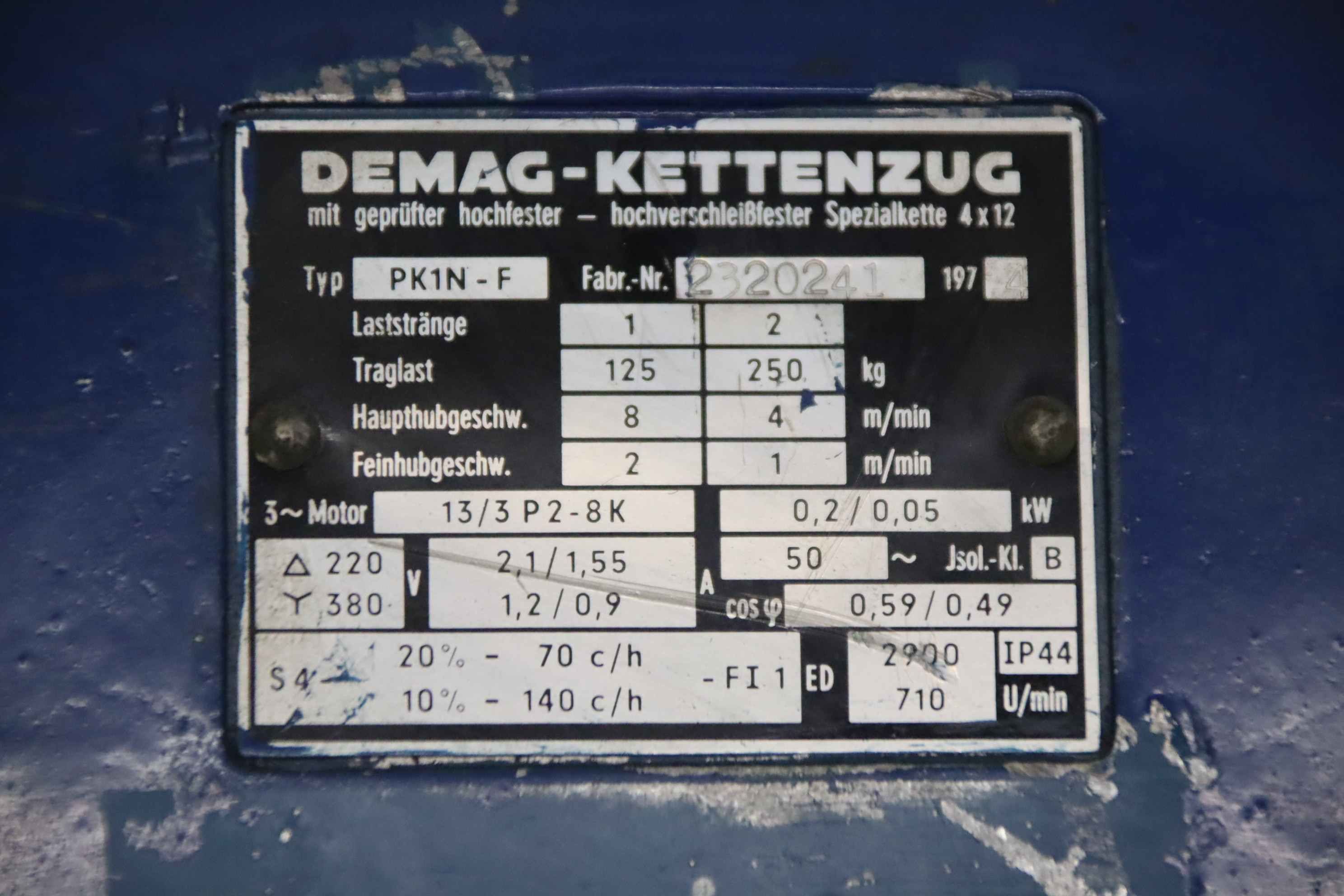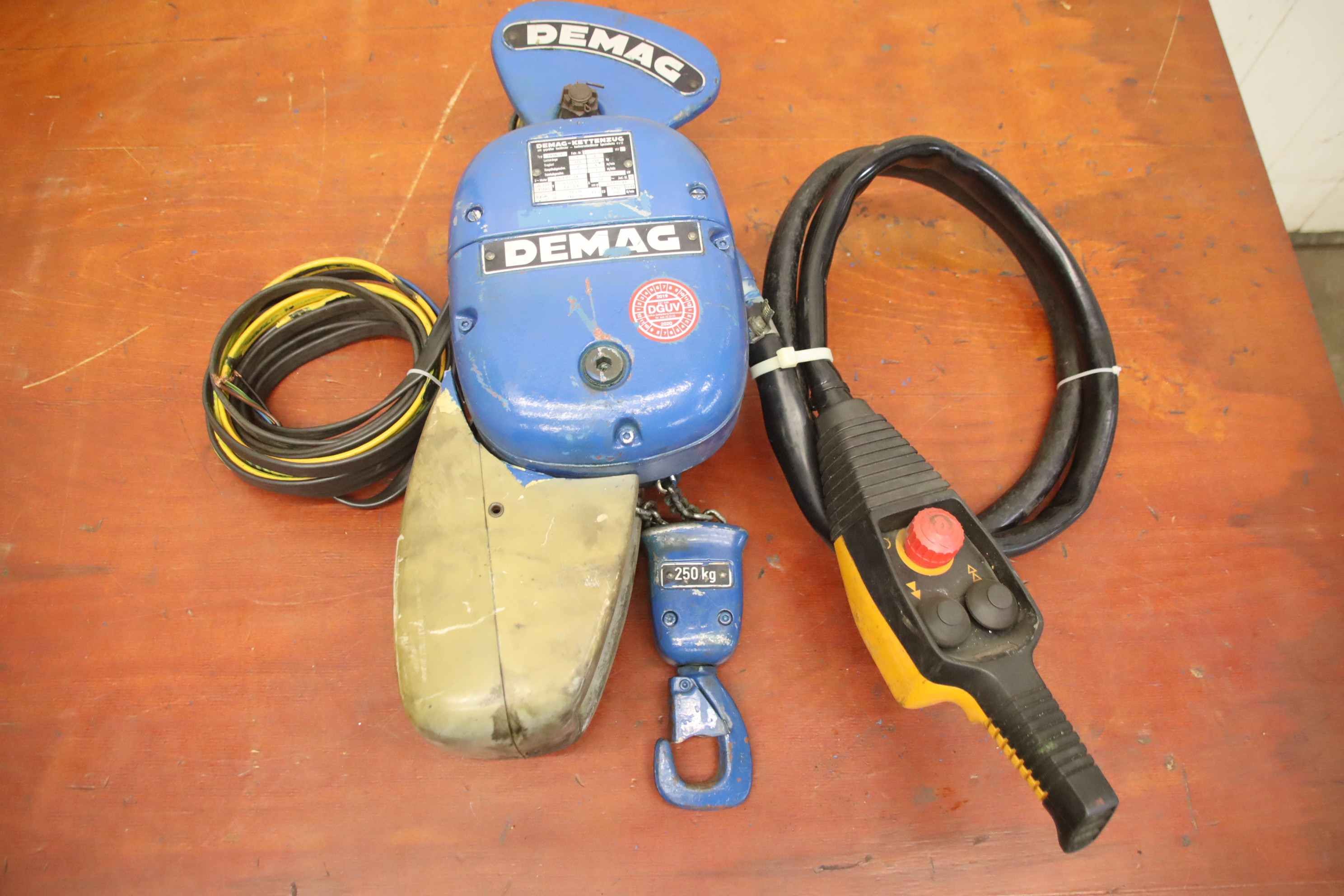 Electric chain hoist, crane, indoor crane, assembly crane, hand trolley, push trolley, crane trolley, trolley drive, crane drive, crane undercarriage, trolley-Manufacturer: Demag, electric chain hoist with chassis-Type: PK1N load capacity 250 kg-Main stroke: 4 m/min-Fine stroke: 2 m/min-Transport dimensions: 600/500/H230 mm-Weight: 23 kg