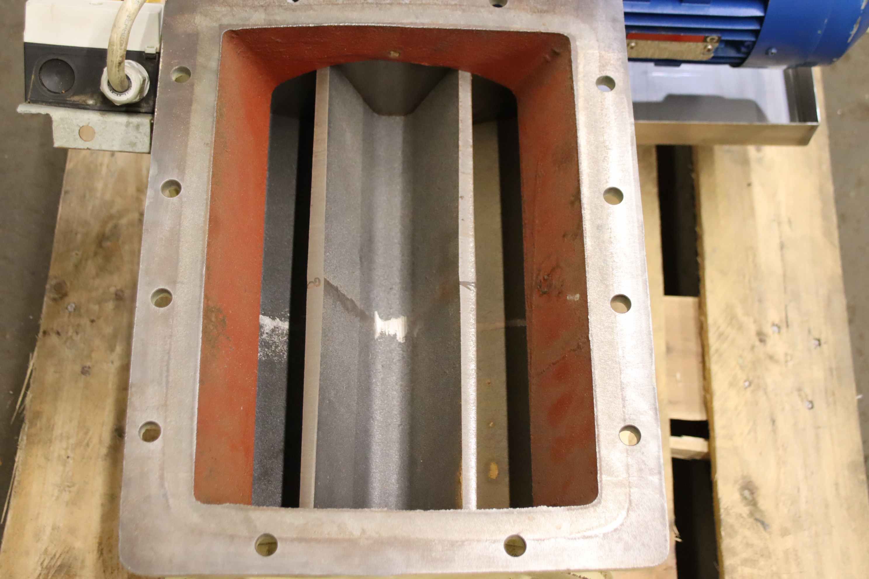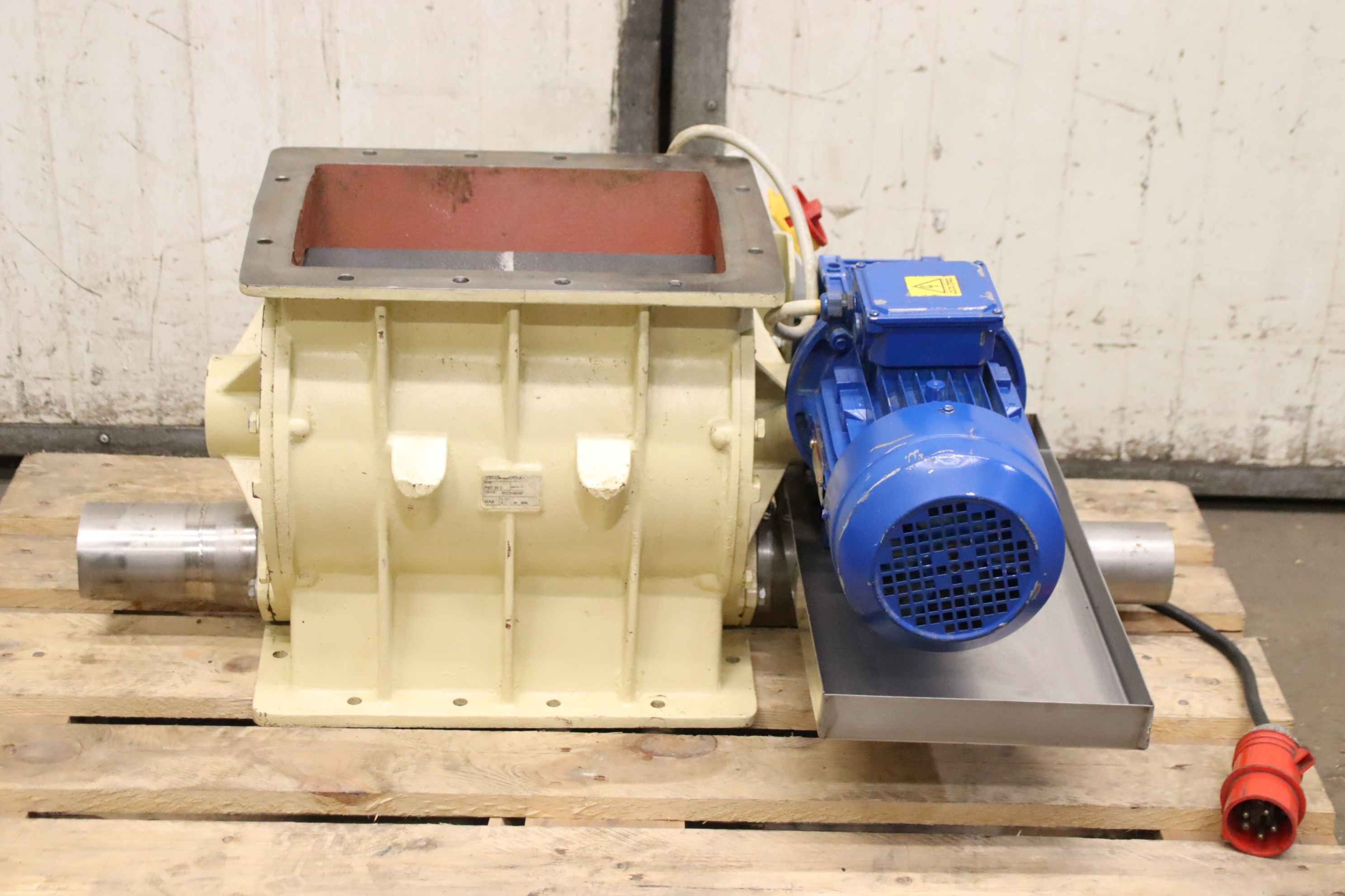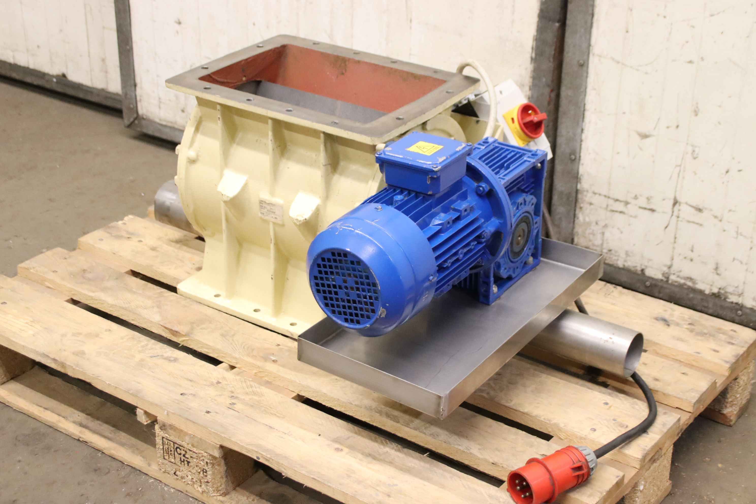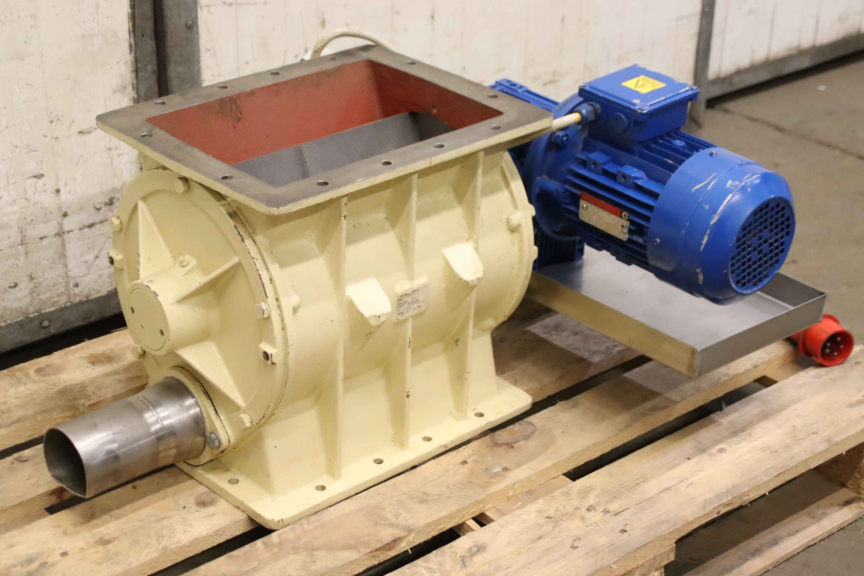 Dosing rotary valve, rotary valve, dosing valve, rotary valve for conveyor screw, transport screw, screw conveyor, conveyor technology, pipe conveyor screw -Manufacturer: Tecom Modena, rotary valve 8 blades type PST 28 D with drive -Speed: 37 rpm -Drive motor: 1.50 kW -Inlet opening: 350 x 250 mm -Outlet: Ø 90 mm / Ø 76 mm -Dimensions total: 970/690/H425 mm -Weight: 146 kg