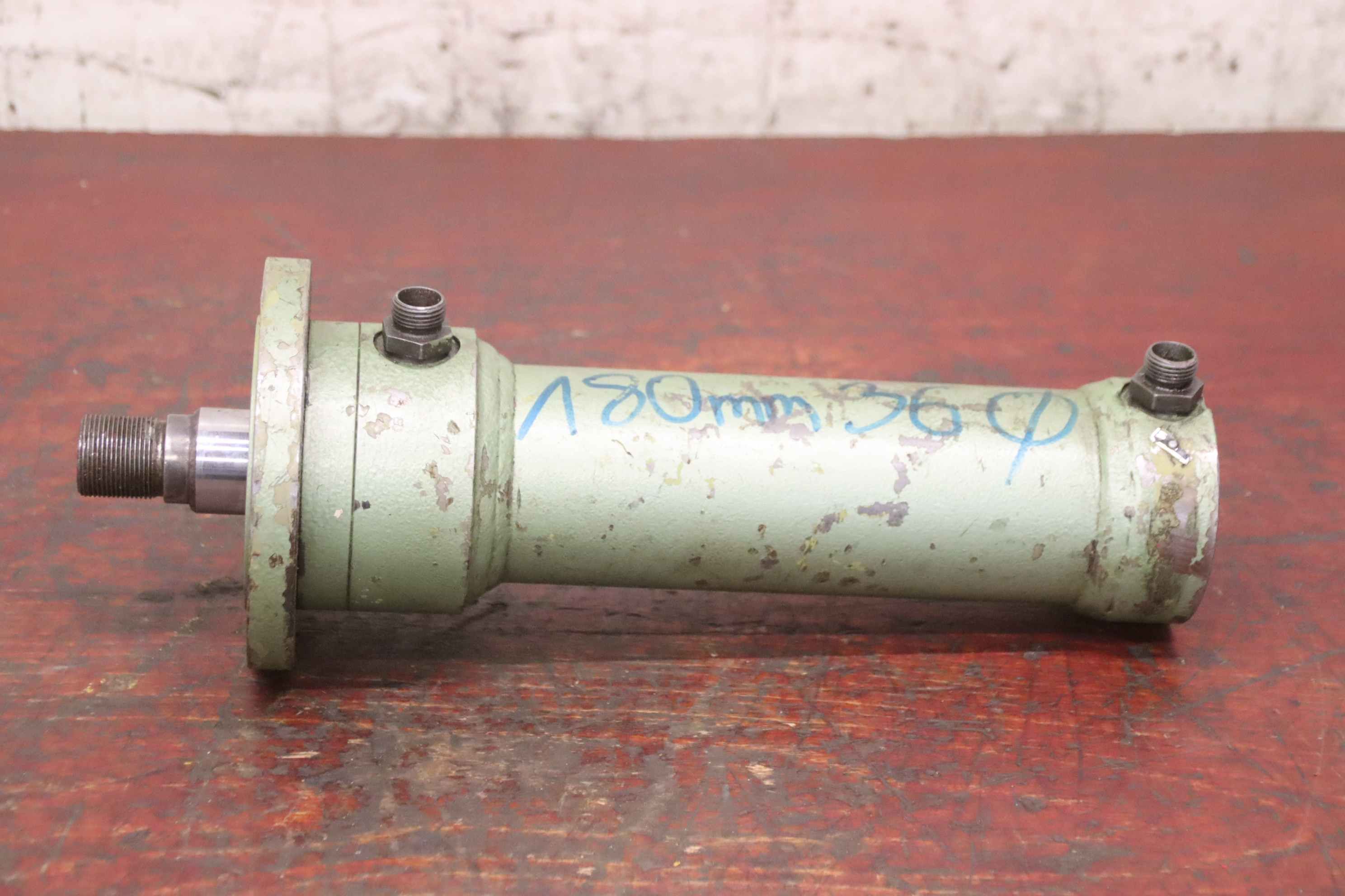 Hydraulic cylinders, support cylinders, hydraulic rams, pressure rams-Hydraulic cylinder double-acting stroke 180 mm-Piston rod: Ø 36 mm / M28-Mounting: bolt circle Ø 118 x 8 mm-Dimensions: 380/140/H140 mm-Weight: 10.6 kg