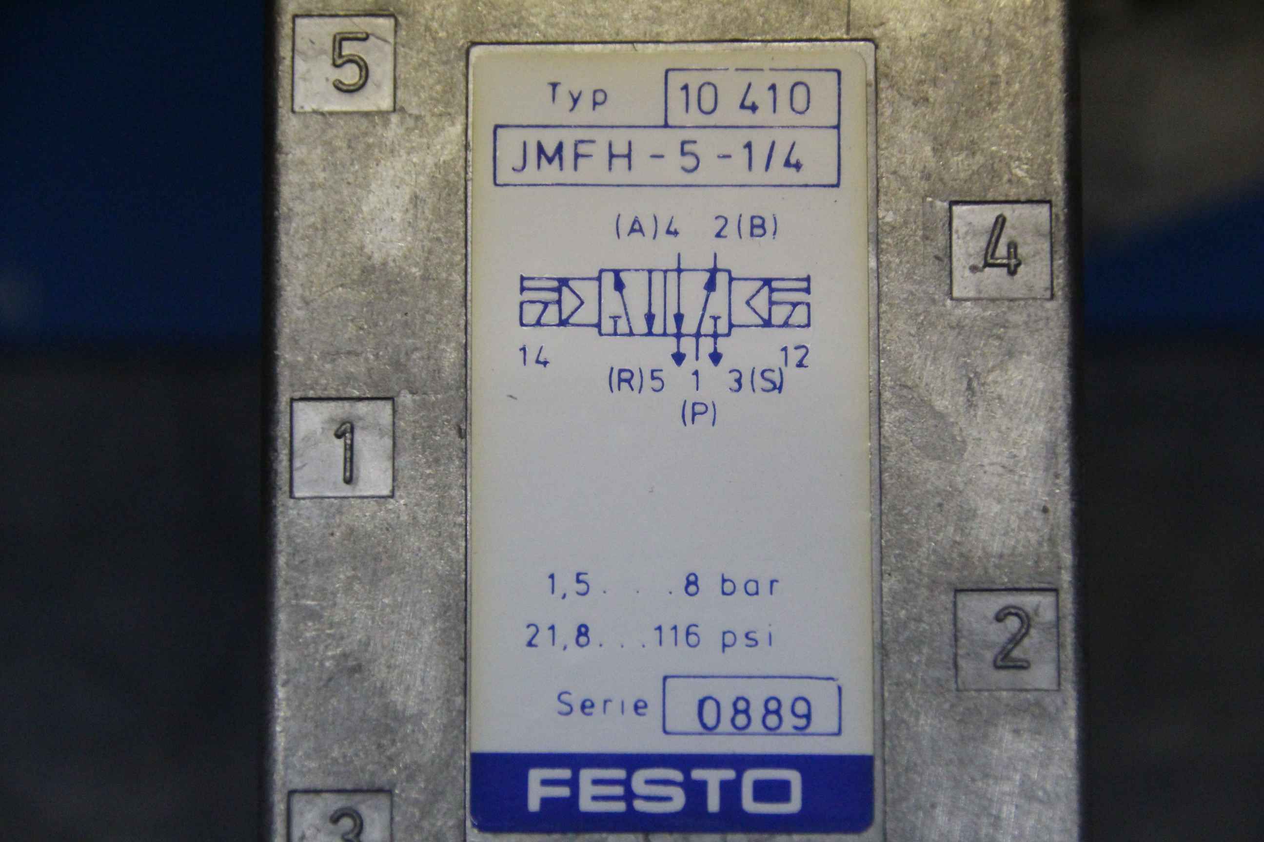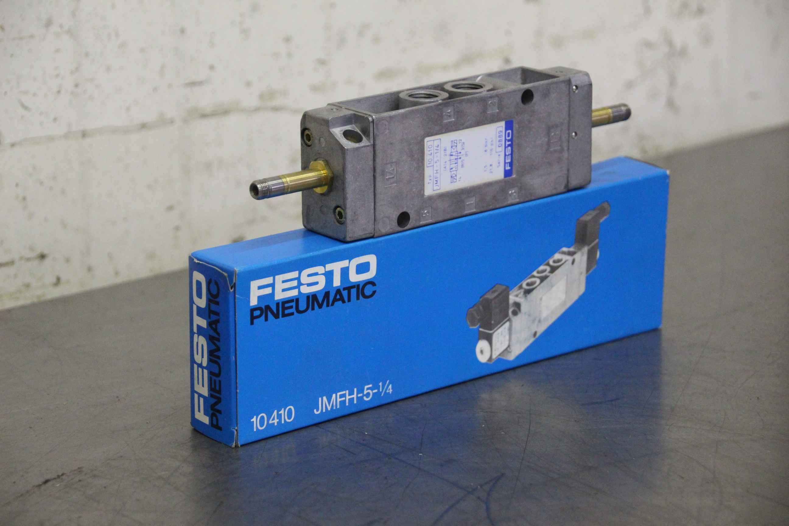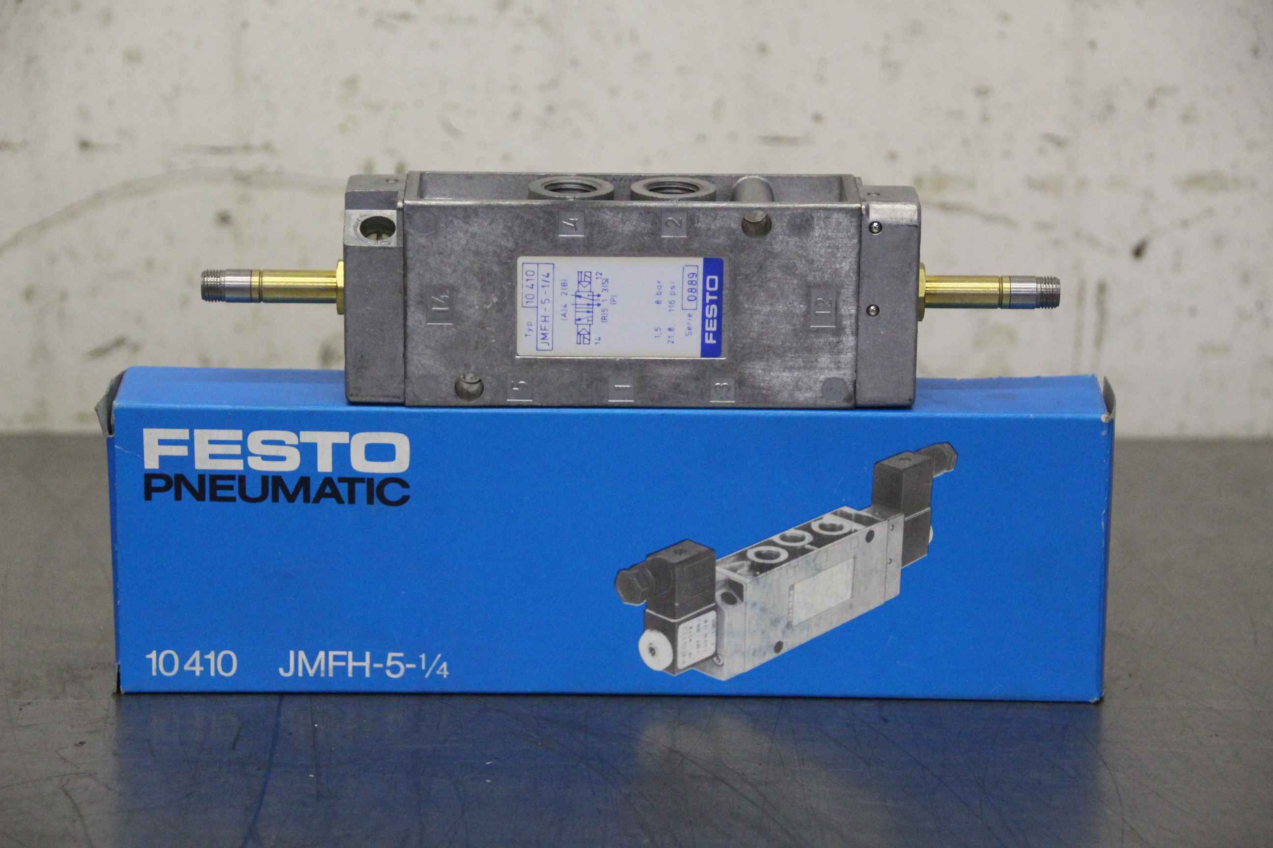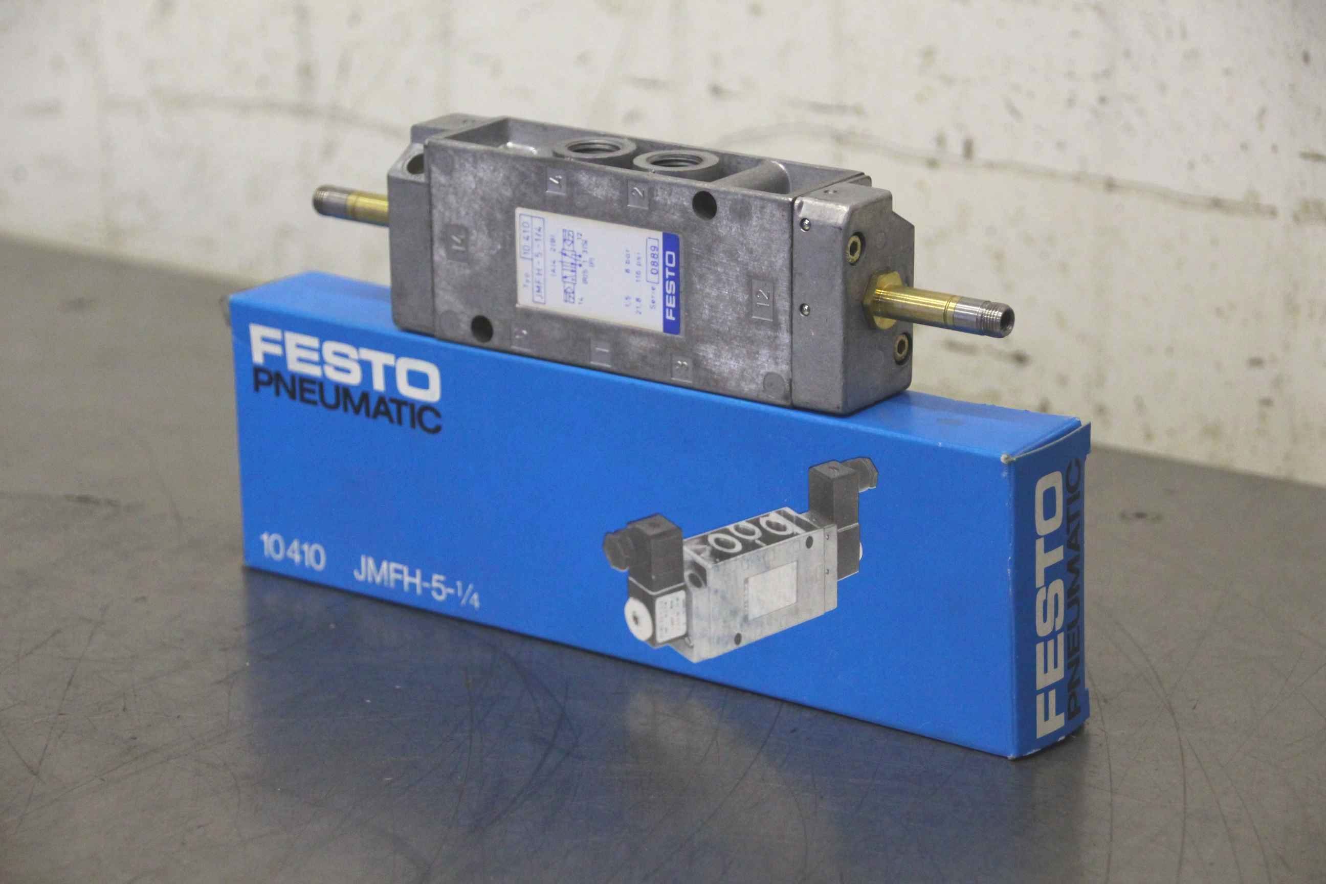 5/2 way valve, solenoid valve, pneumatic valve, air valve, pressure valve, valve block, control block, reversing directional valve-Manufacturer: Festo, solenoid valve-Type: 10410 JMFH-5-1 / 4-Working pressure: 1.5 - 8 bar-Number: 7x valves available-Price per piece-Dimensions: 235/75 / H30 mm-Weight: 0.4kg / piece