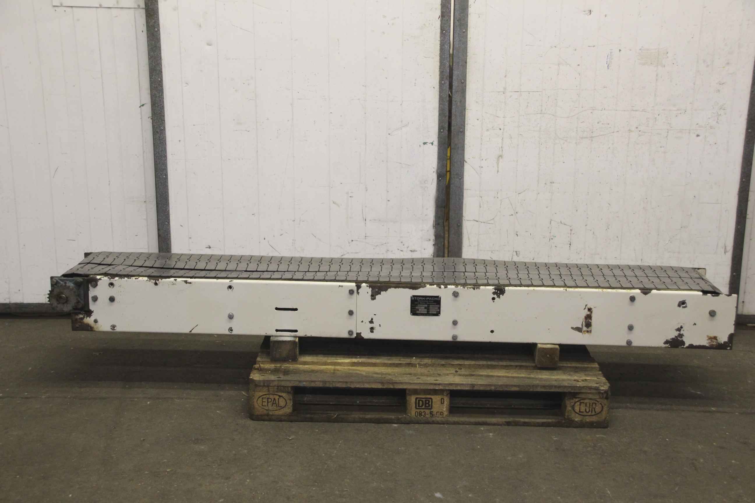 Conveyor belt, belt conveyor, conveyor belt, belt conveyor-Manufacturer: Stork-Packo, conveyor belt with high load capacity-Type: SAL-HE 10-Metal belts: belt width 2 x 150 mm-Conveying length: approx. 2200 mm-Drive: without drive motor-Dimensions: 2350/460 / H210 mm-Weight: 127 kg