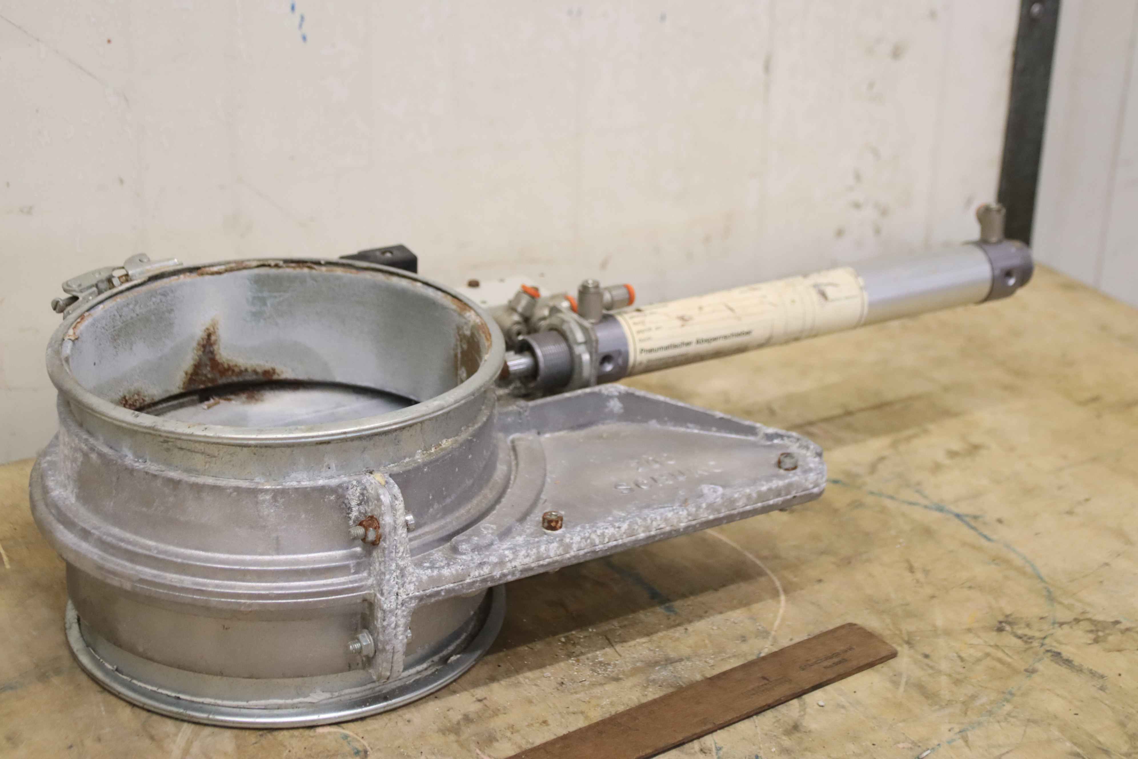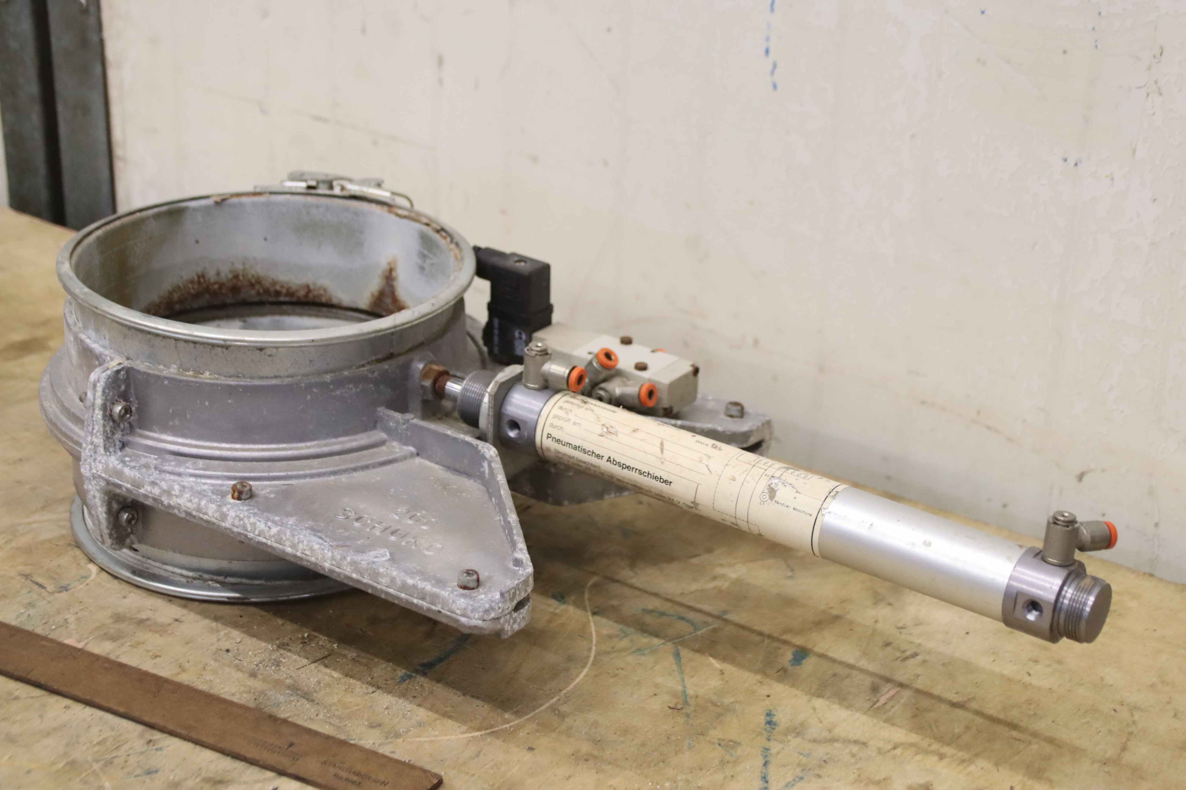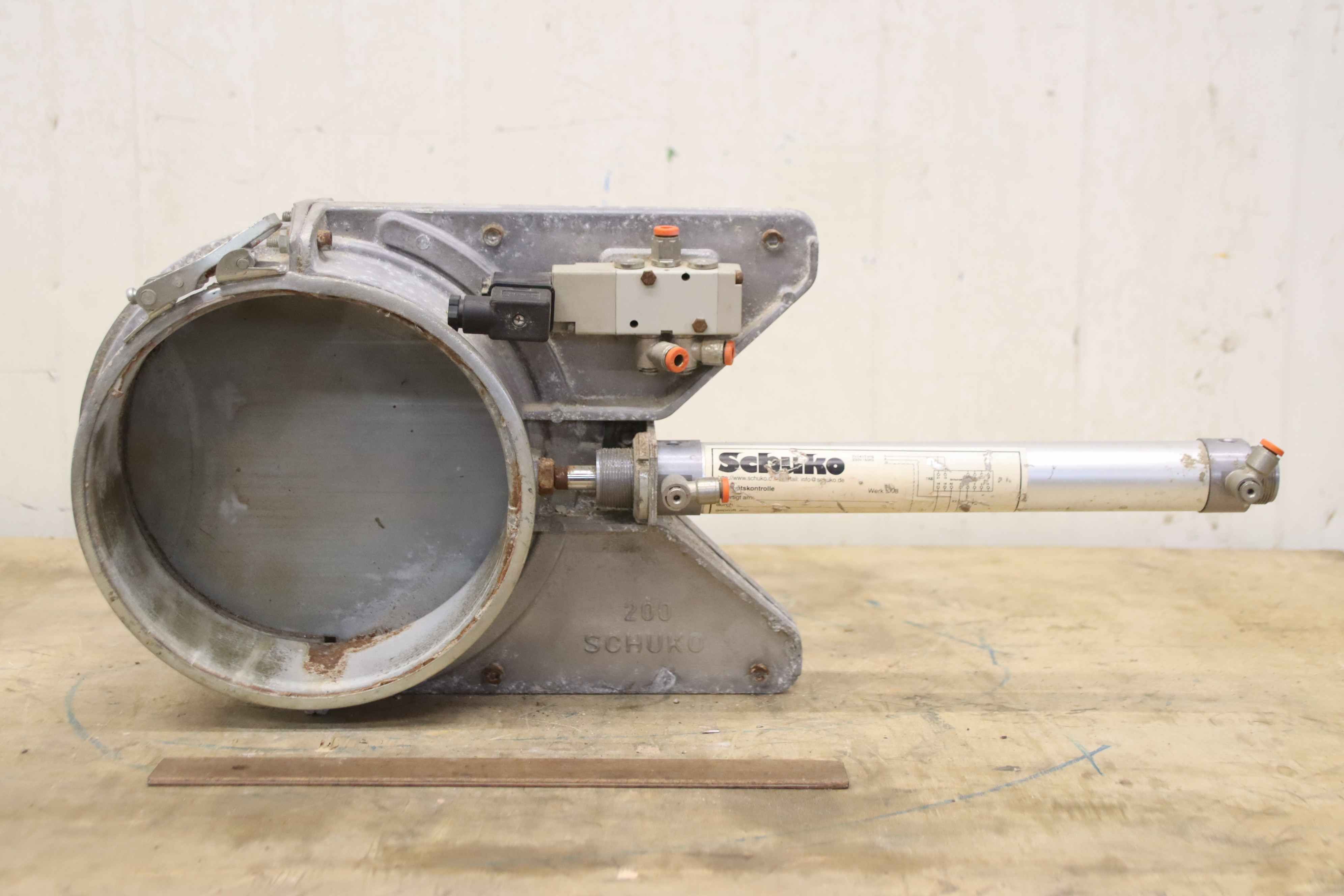 Butterfly valve, flap valve, ball valve, butterfly valve, shut-off valve, gate valve, pneumatic energy saving gate valve-Manufacturer: Schuko, pneumatic gate valve type 200-Diameter: 200 mm-Valve drive: 220 V, convertible to 24 V-Nominal pressure: max. 6 bar-Number: 3x gate valve available-Price per piece-Dimensions: 610/260/H155mm-Weight: 6,1 kg/pc.