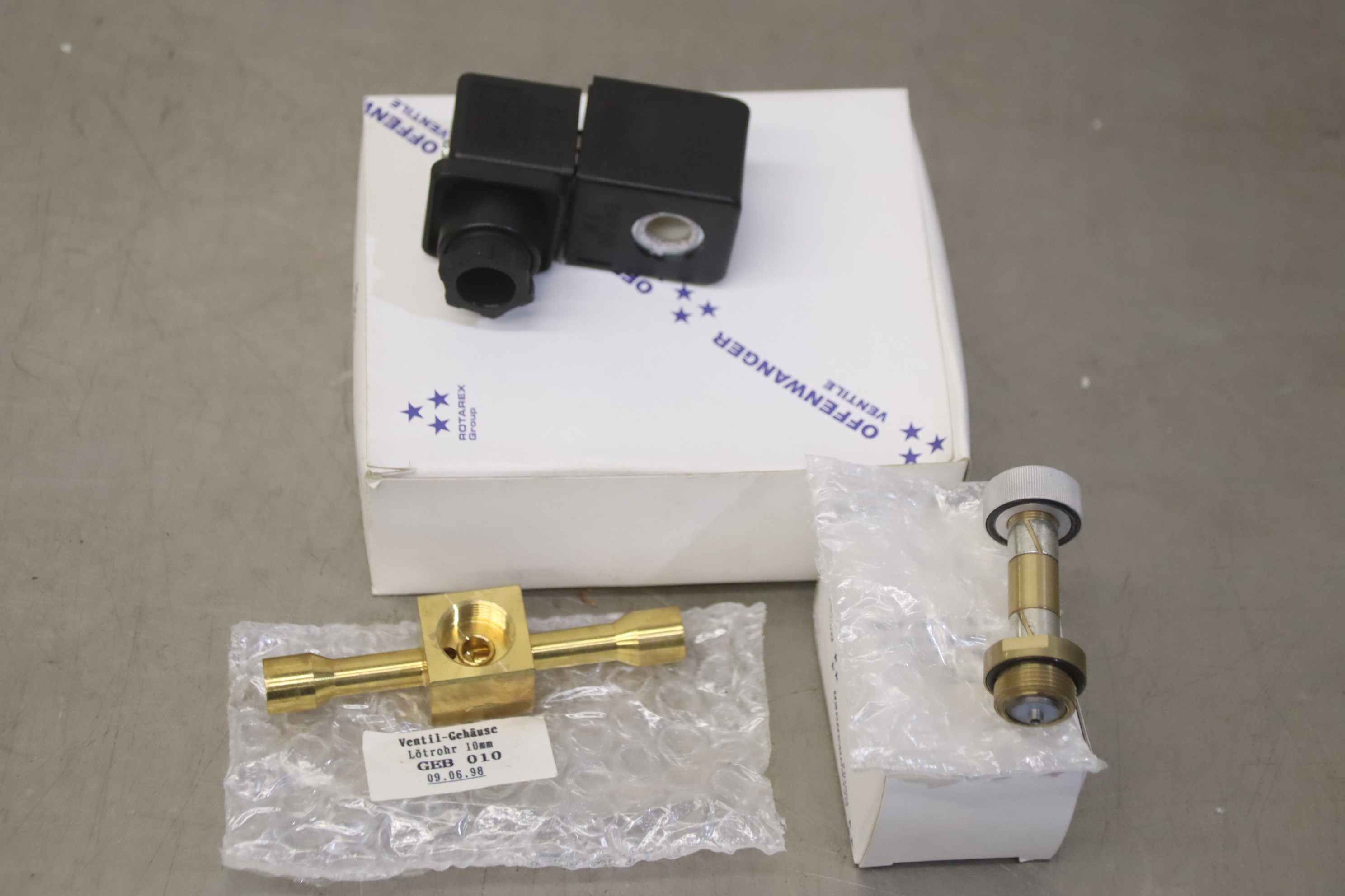 Solenoid Valve, Disc Valve, Flap Valve, Electric Solenoid Valve, Solenoid Valve, Solenoid Gas Valve, Gas Solenoid Valve-Manufacturer: Offenwanger, solenoid valve unused in original packaging-Type: VEB 212-Valve: VEZ 000 voltage 24V-Valve body: GEB 010-Quantity: 18x valve available-Price per piece-Dimensions of box: 125/105/H40 mm-Weight: 0.3kg/piece
