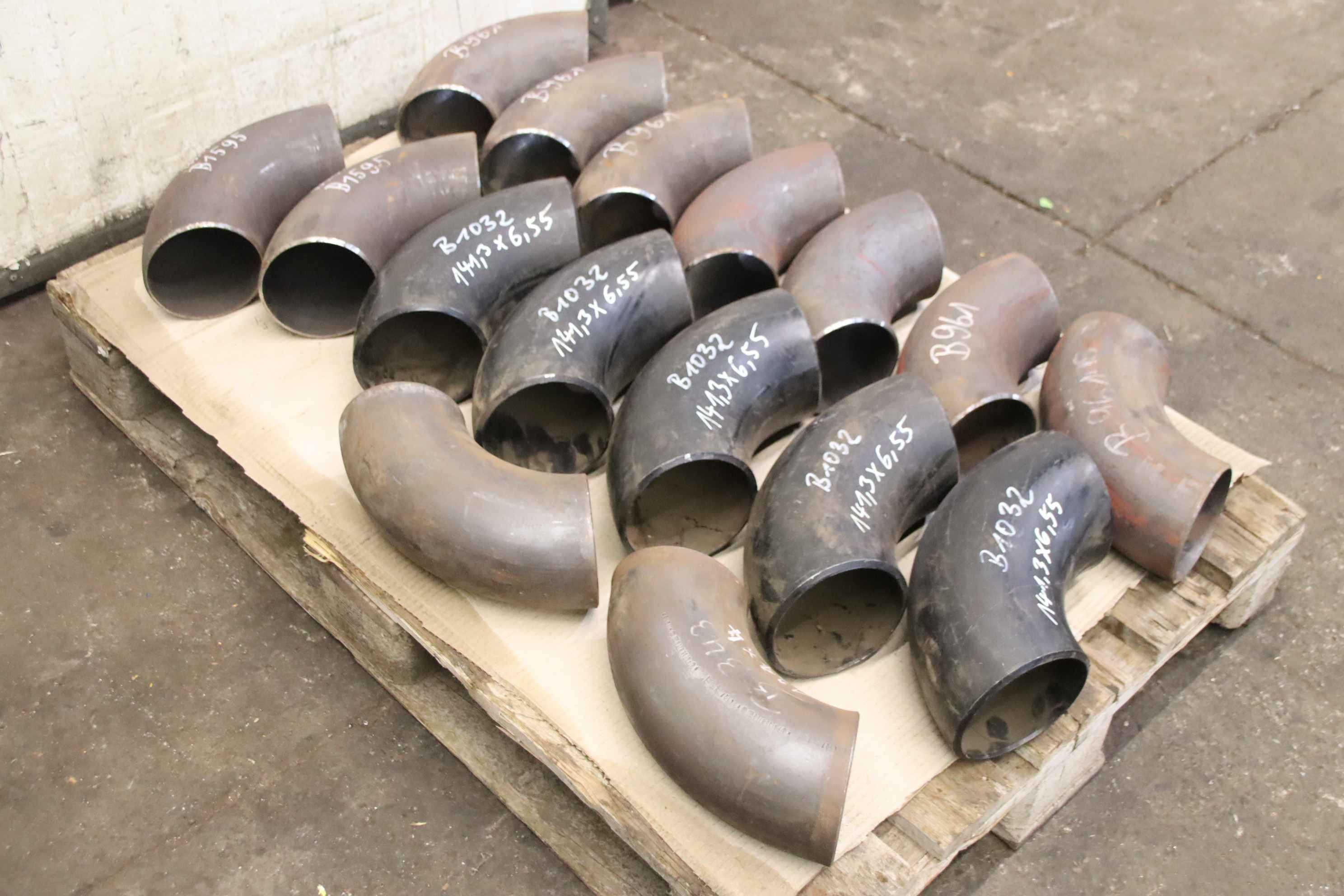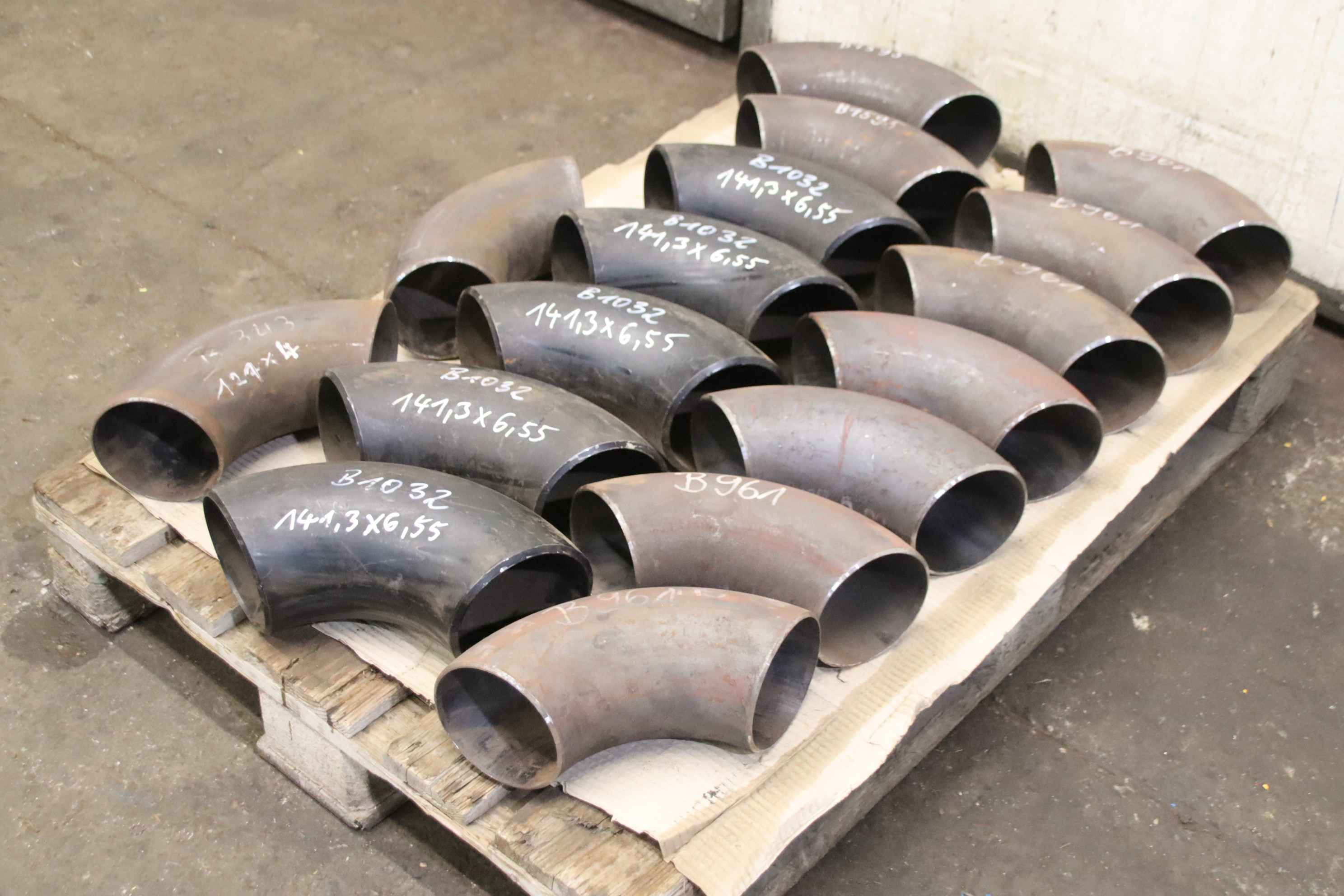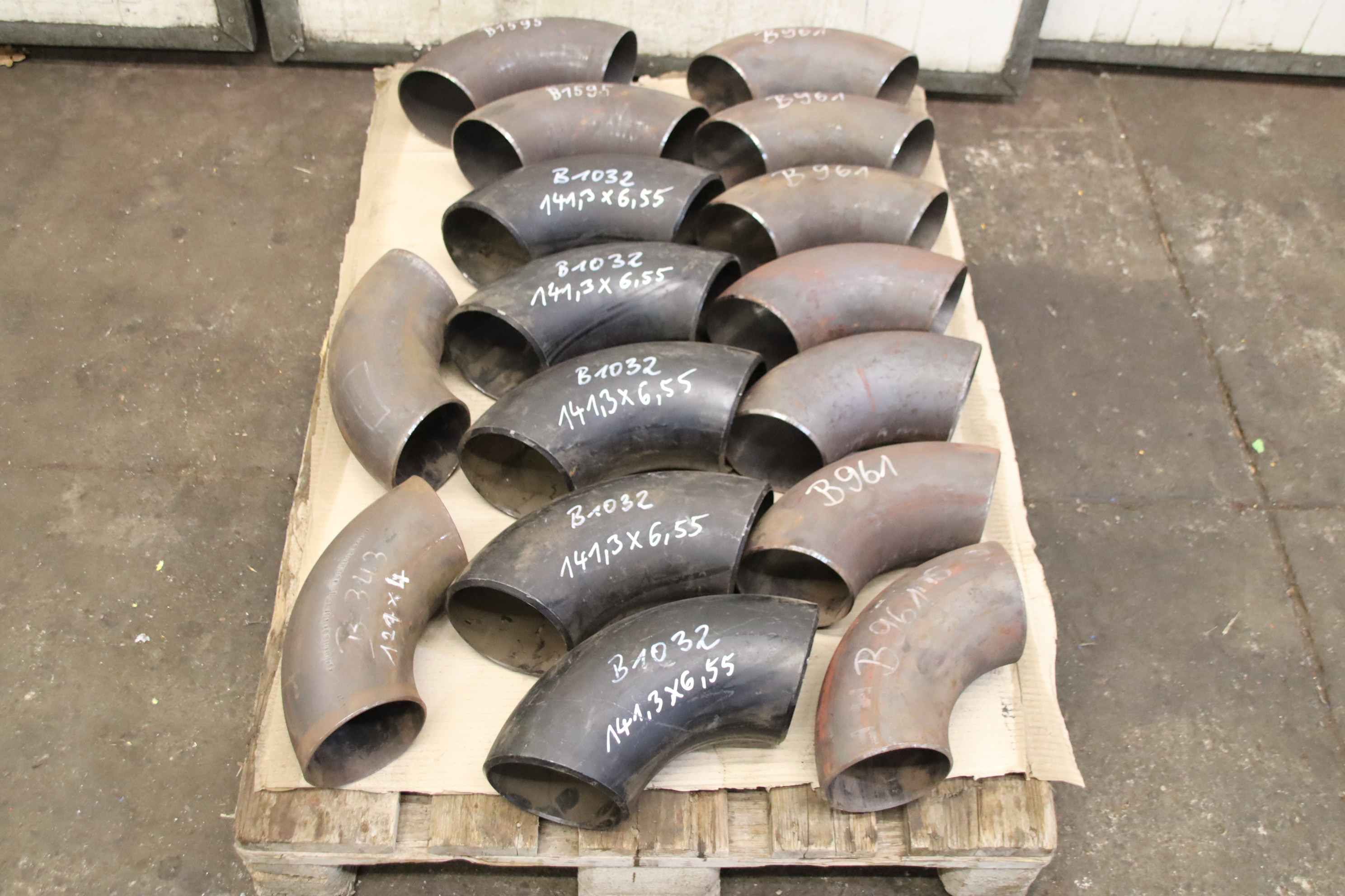 Flange connection, V-flange, pipe coupling, welding reduction, reduction, clapper base, pipe bend, welding bend, pipe angle-Pipe elbow: welding elbow 90° 16 pieces-Type: Ø 127 -141.3 mm 4 different versions see photo parts list-Price/tax: complete-Stock: other sizes/types also available, please inquire-Transport dimensions: 1200/800/H125 mm-Weight: 97 kg with pallet