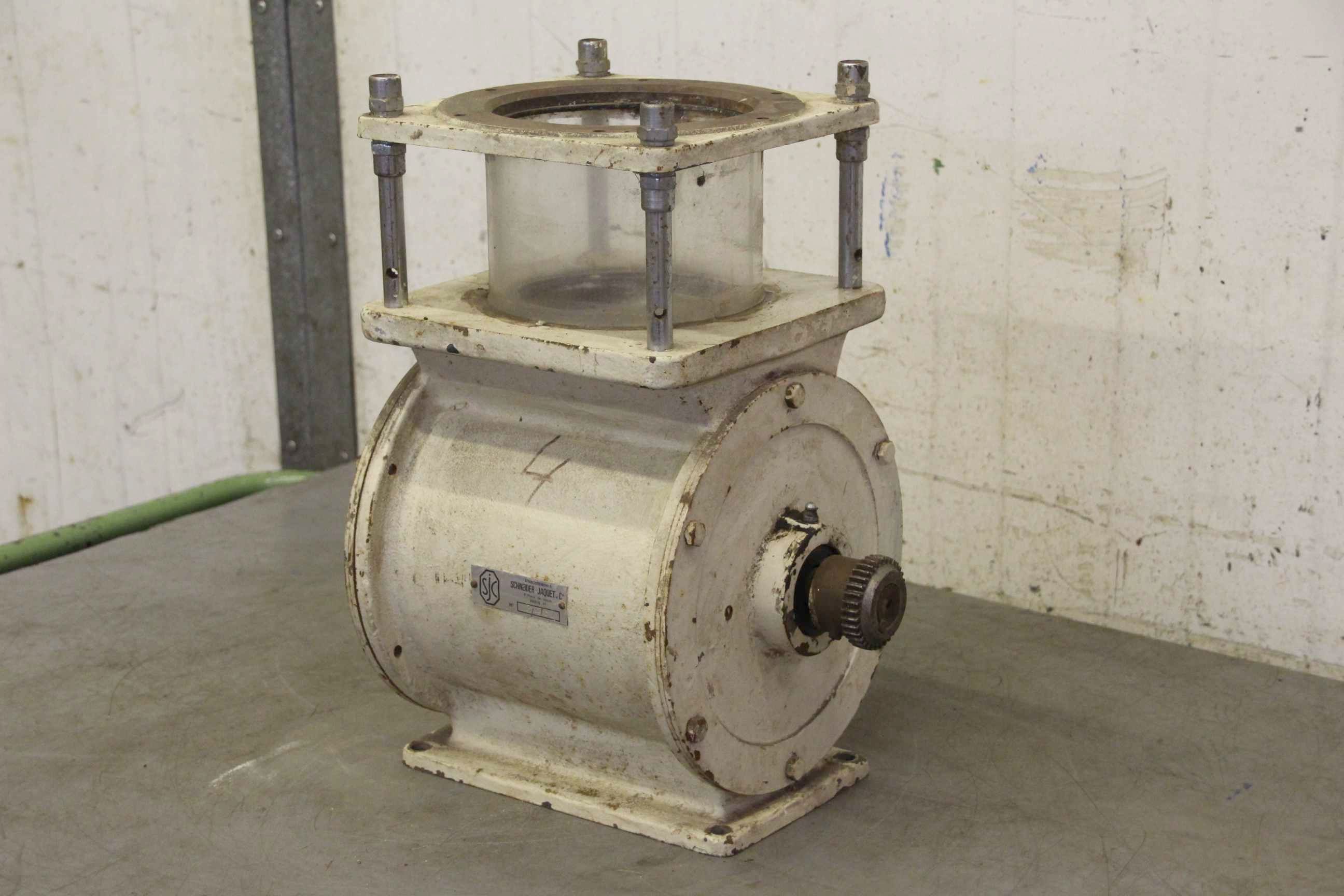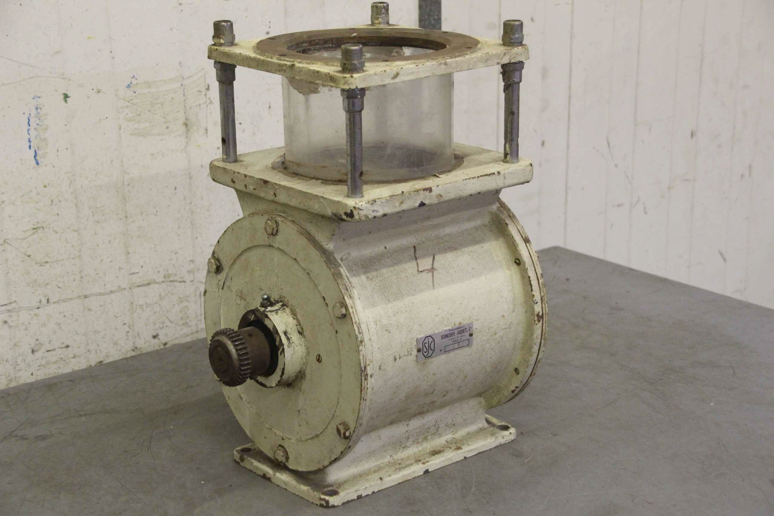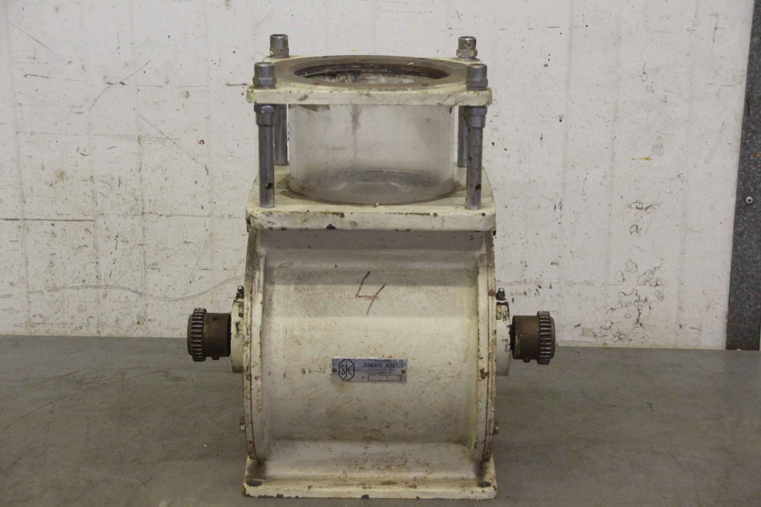 Dosing rotary valve, rotary valve, dosing valve, rotary valve for screw conveyor, screw conveyor, screw conveyor, conveyor technology, pipe screw conveyor-Manufacturer: Schneider-Jaquet, rotary valve-Inlet opening: Ø 147 mm-Outlet: 180 x 90 mm-Shaft: Ø 25 x 45 mm-Height shaft axis: 140 mm-Number: 3x rotary valve available-Price per piece-Dimensions: 380/250 / H430 mm-Weight: 38 kg